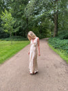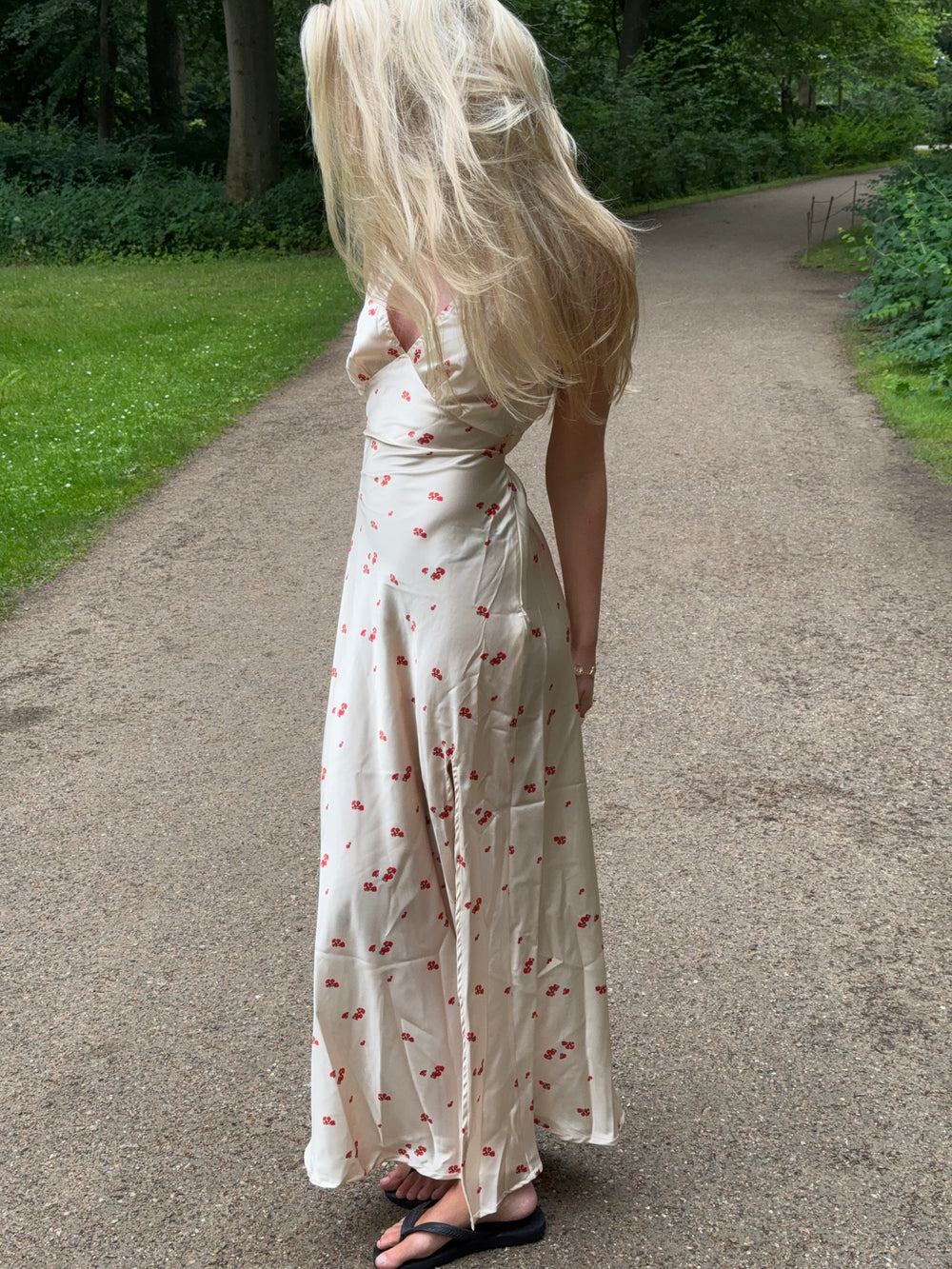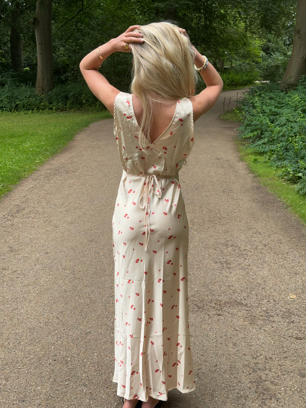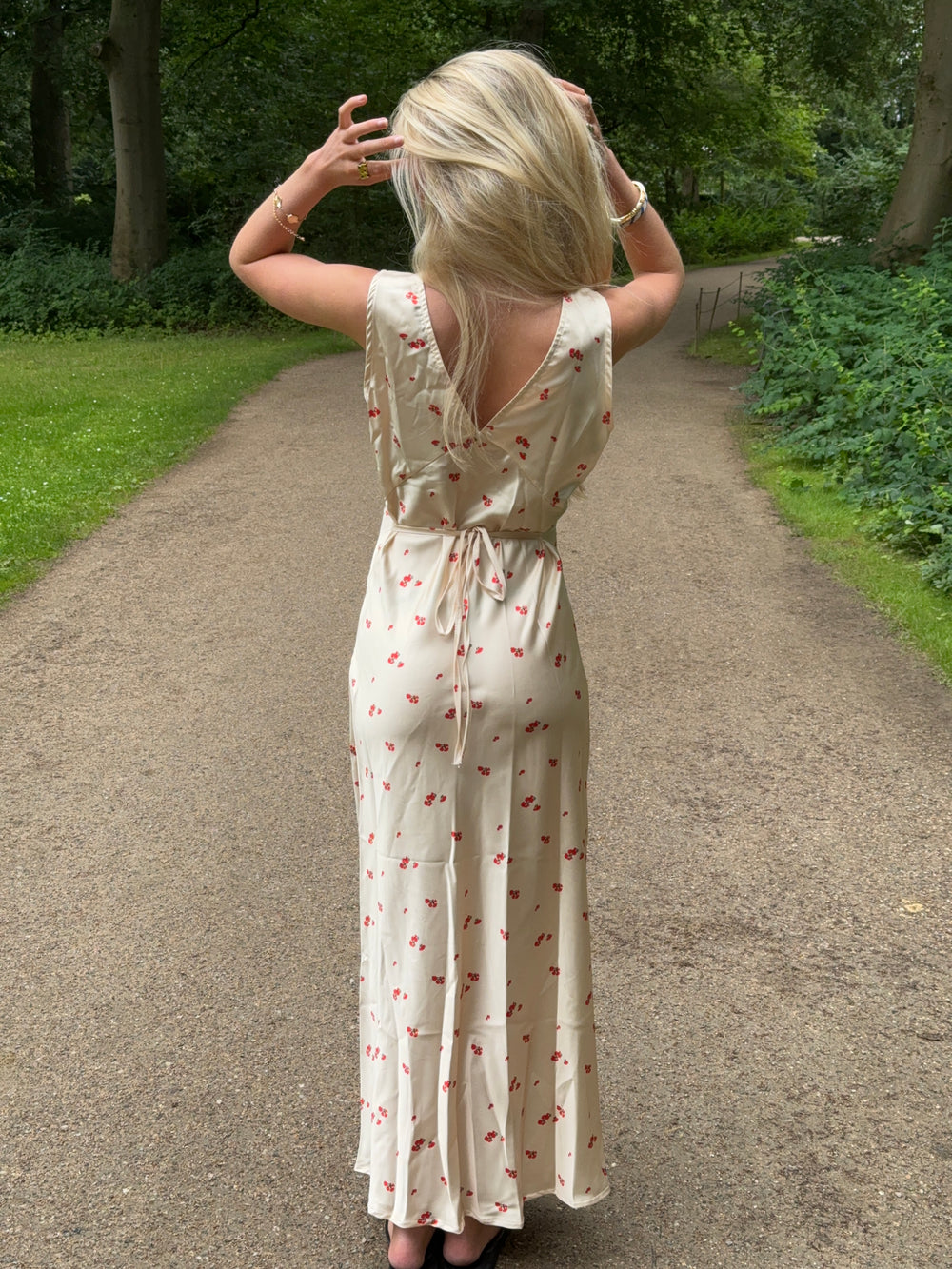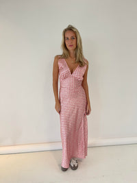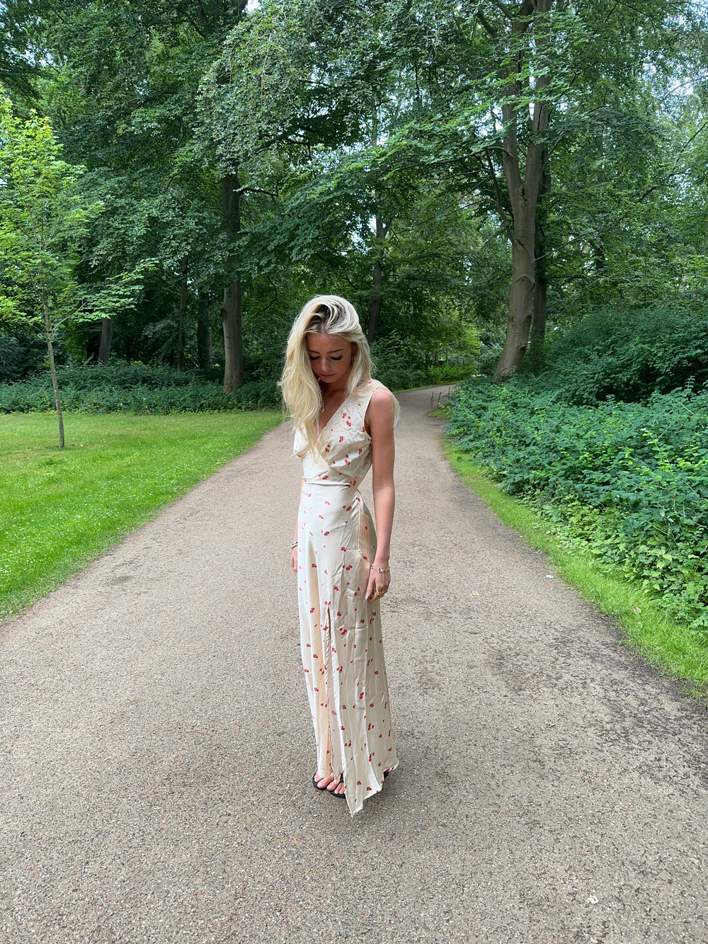 Vores Marielle kjole har det fineste røde blomstermønster, som giver det perfekte sommerlook! Kjolen har maxi-pasform, en slids i den ene side og en flot v-udskæring.