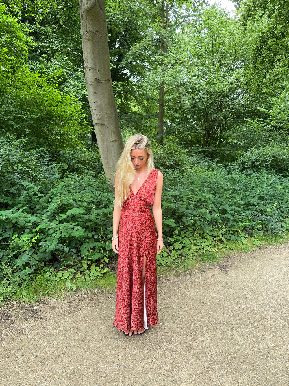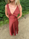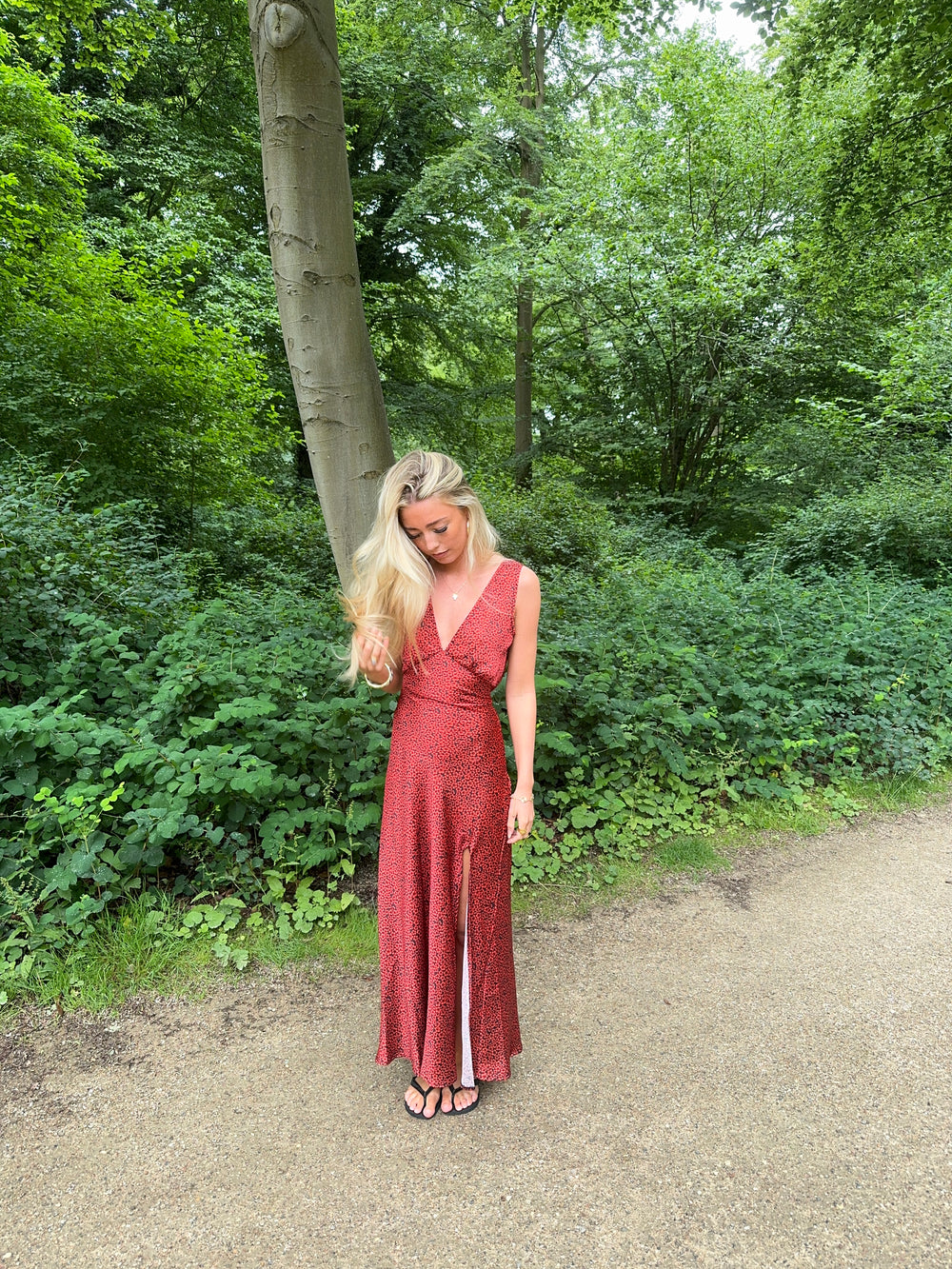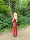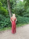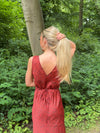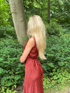Vores røde Marielle kjole har det fineste sorte blomstermønster, som giver det perfekte sommerlook! Kjolen har maxi-pasform, en slids i den ene side og en flot v-udskæring.