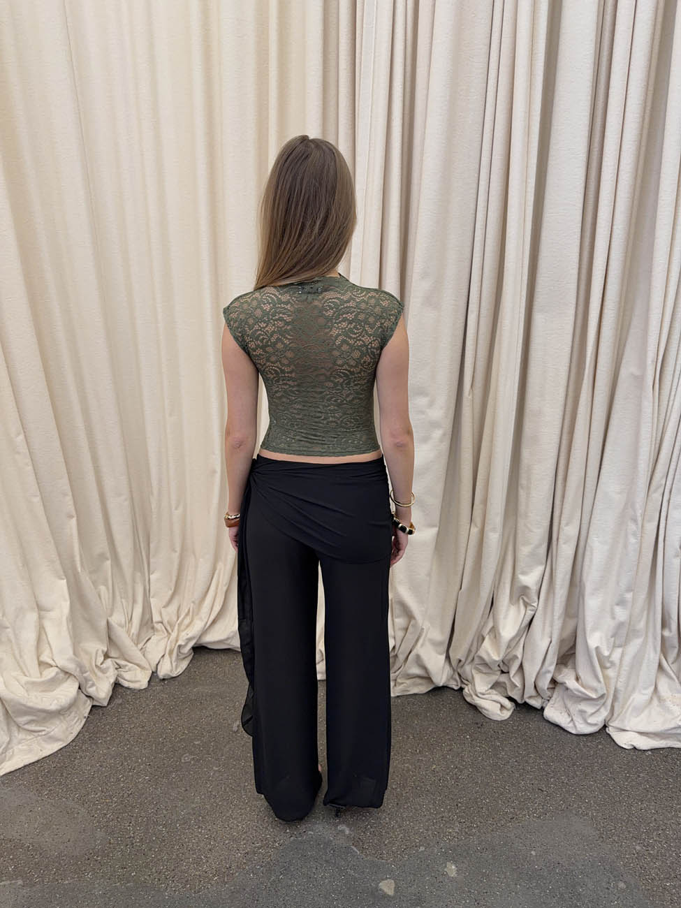 Denne smukke top i kaki er fremstillet i en eksklusiv blonde med detaljerede, blomsterinspirerede mønstre. Blusen har en tætsiddende silhuet med let stræk og små ærmekanter, der giver et feminint og sofistikeret udtryk. Den høje blondehals og bølgede kantdetaljer fuldender designet med et romantisk præg.