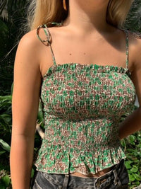 Blomster toppen har elastik i taljen og bindes ved skuldrene.