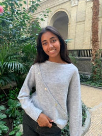 Denne striktrøje er lavet i et blødt materiale. Trøjen har de fineste dekorative knapper foran, så det betyder at den ikke kan åbnes. Den har ribbede detaljer på ærmeenderne, forneden og midt på blusen.