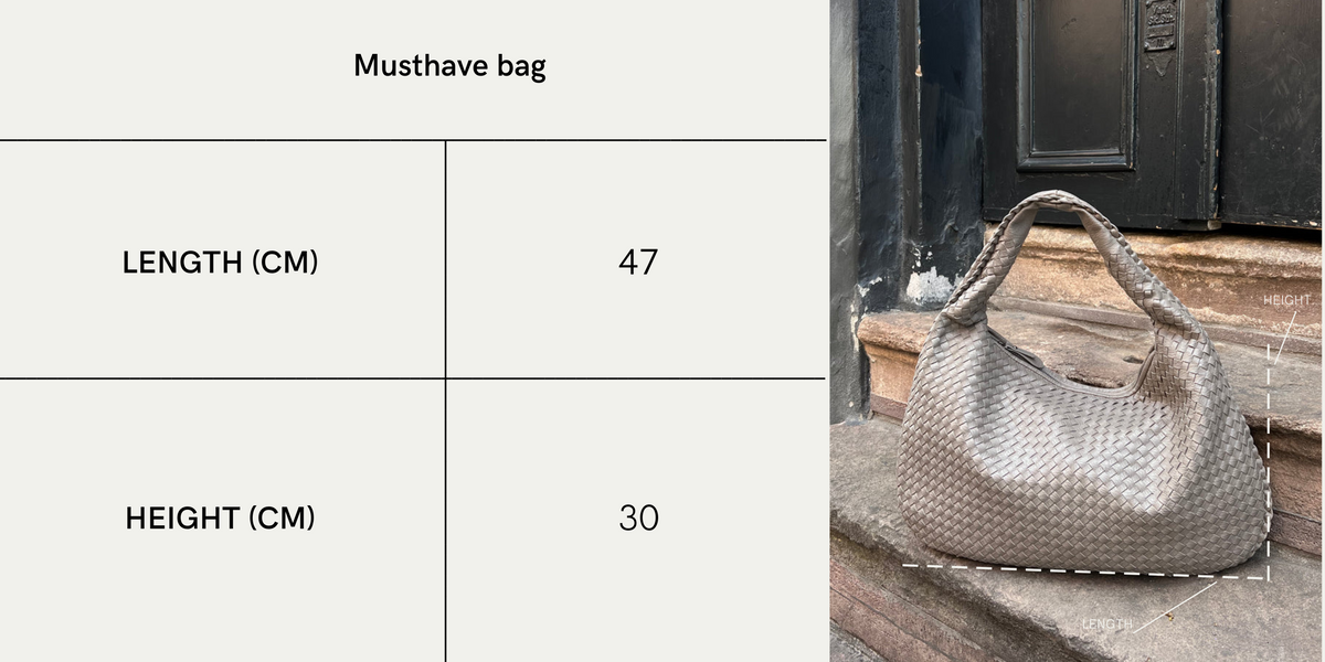 Din nye GO-TO hverdagstaske. Vores Musthave skuldertaske har en rund form og et vævet/flettet design. Tasken har et stort hovedrum med lynlåslukning, og to mindre rum med lynlås inde i tasken samt en lille åben lomme. Musthave tasken er meget rumlig, og kan endda have plads til en Macbook 13" i.