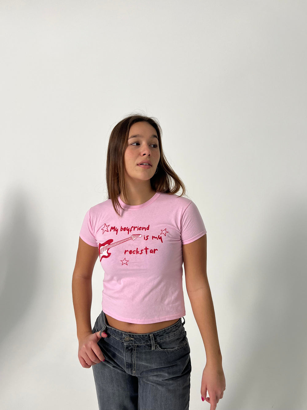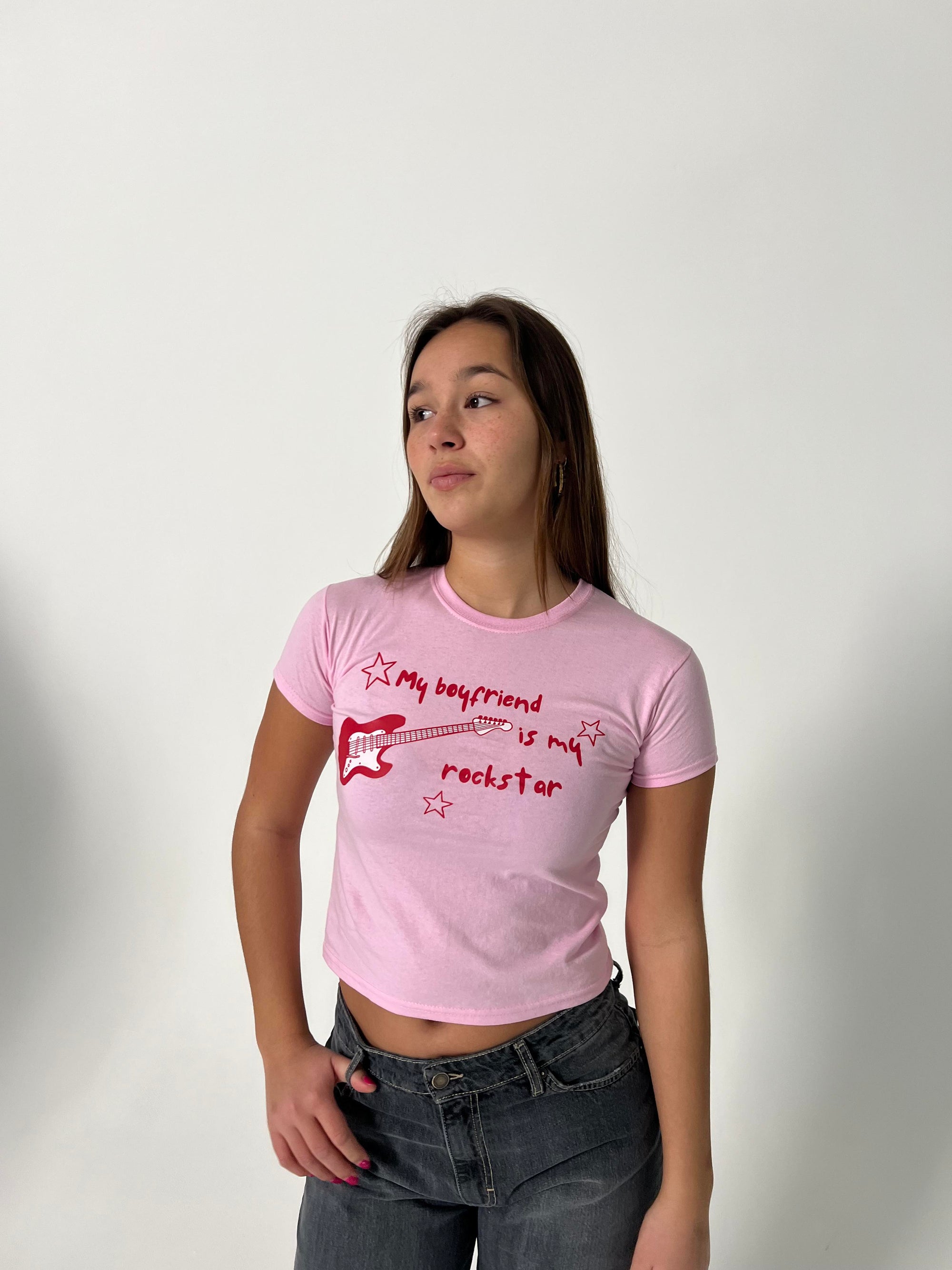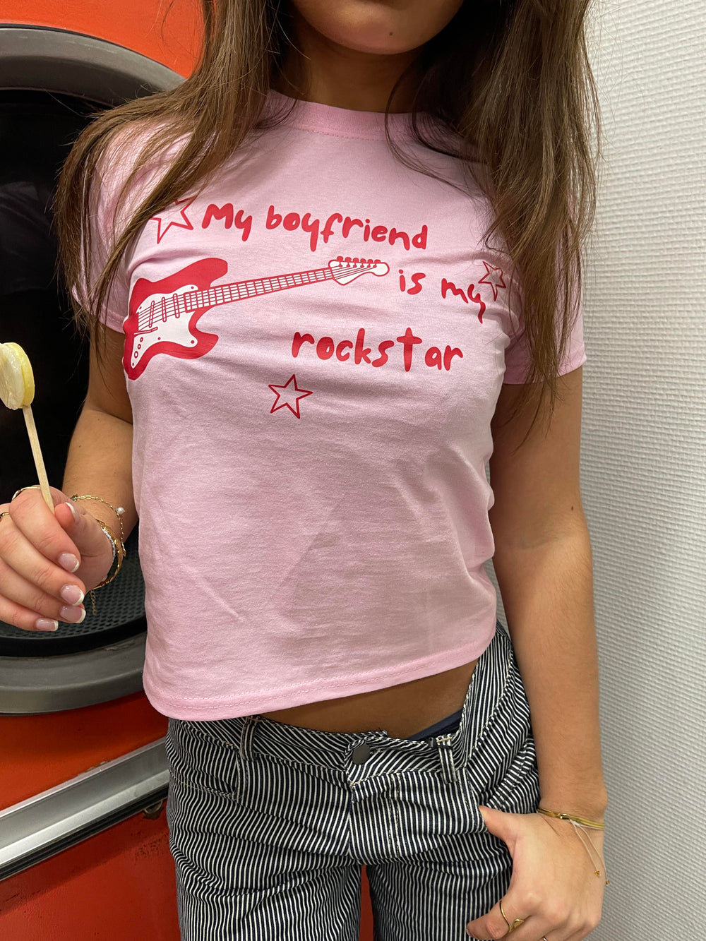Pink baby tee med "my boyfriend is my rockstar" og guitarsymbol. Vores tee´s er fra fruit of the loom og i en super blød og behagelig kvalitet.