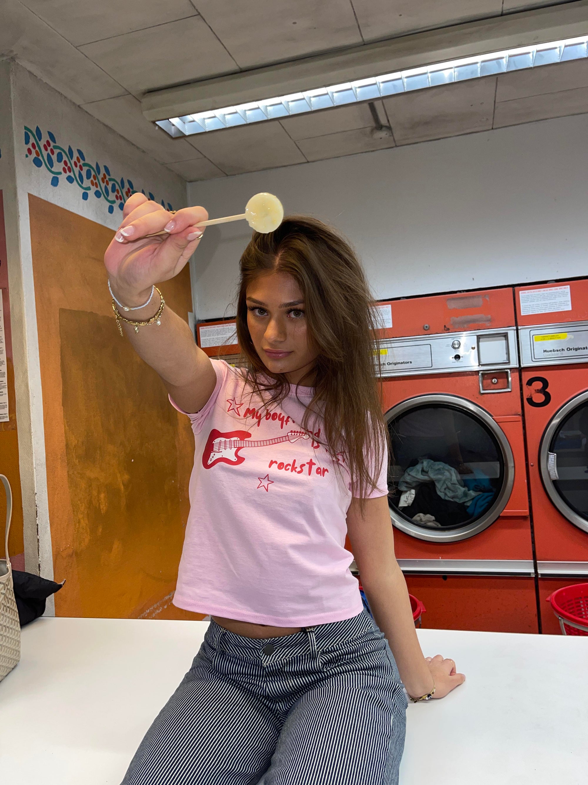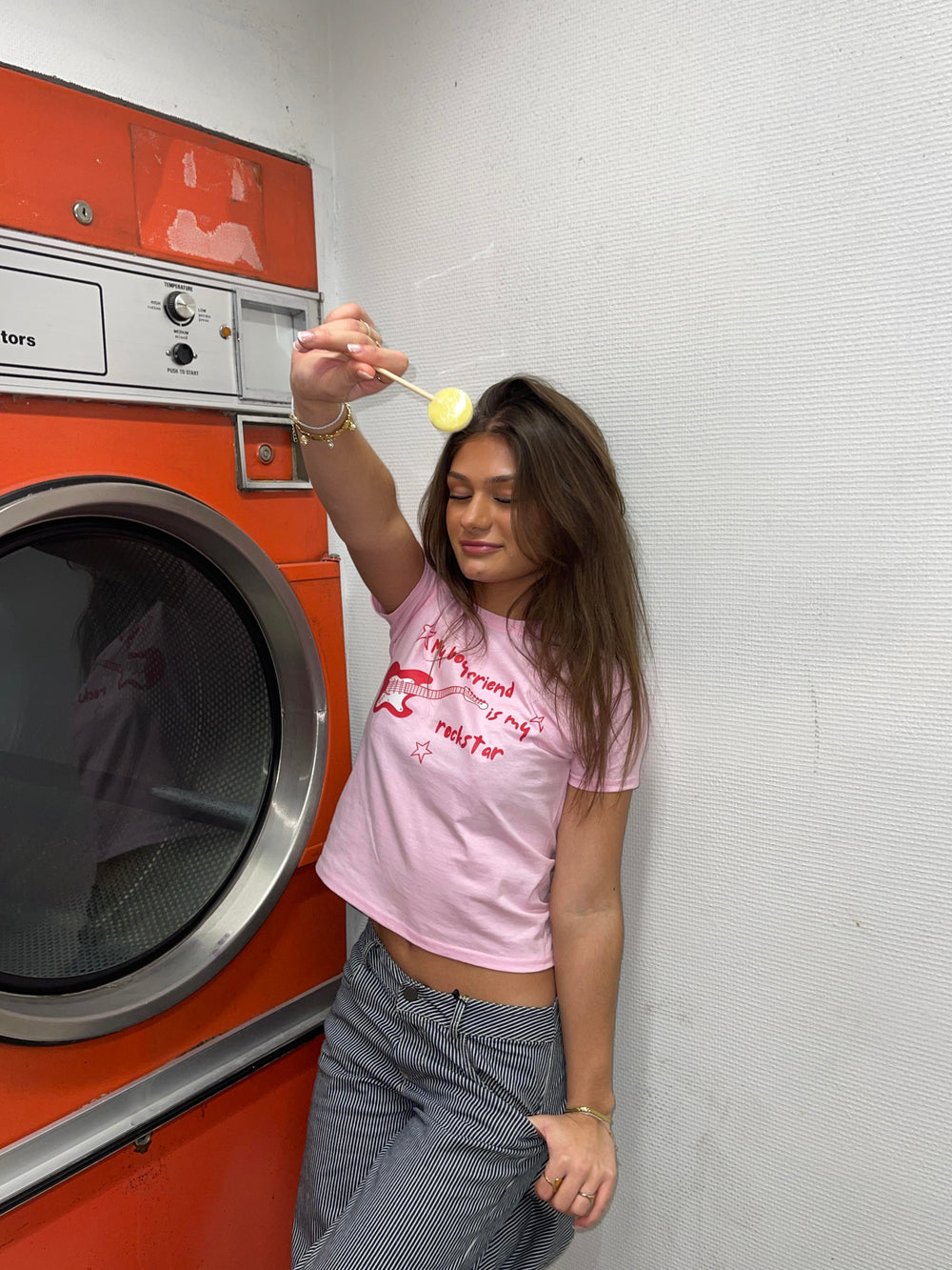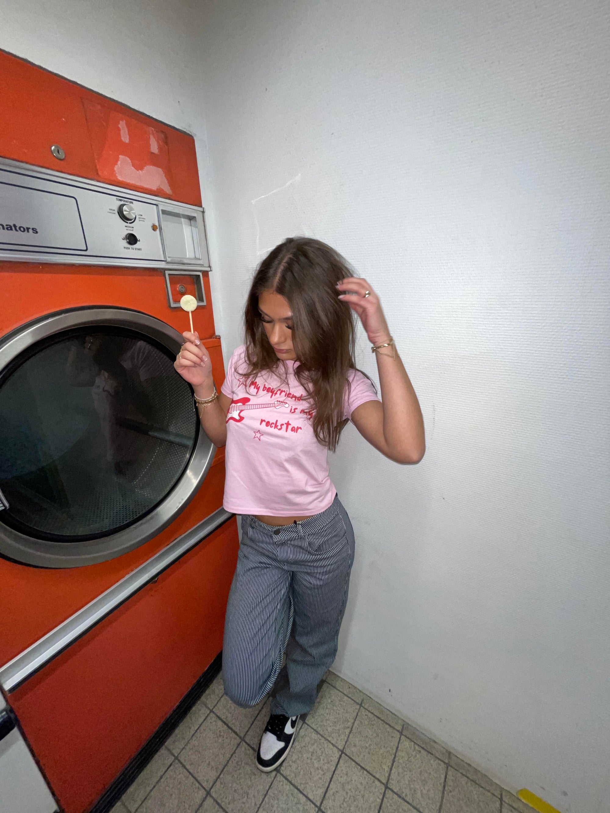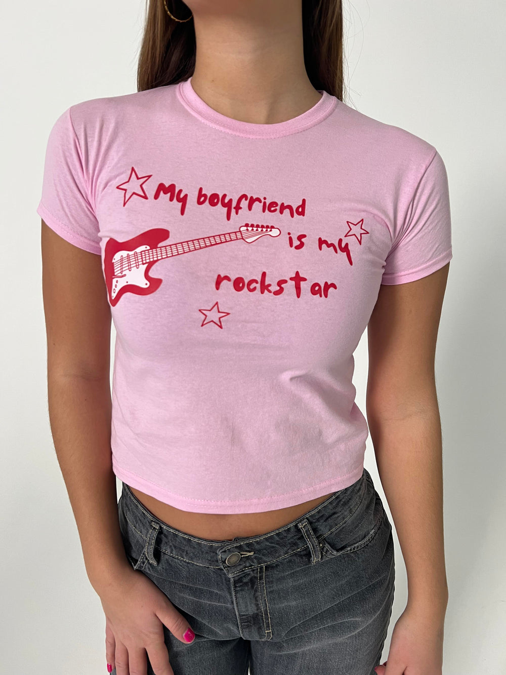 Pink baby tee med "my boyfriend is my rockstar" og guitarsymbol. Vores tee´s er fra fruit of the loom og i en super blød og behagelig kvalitet.