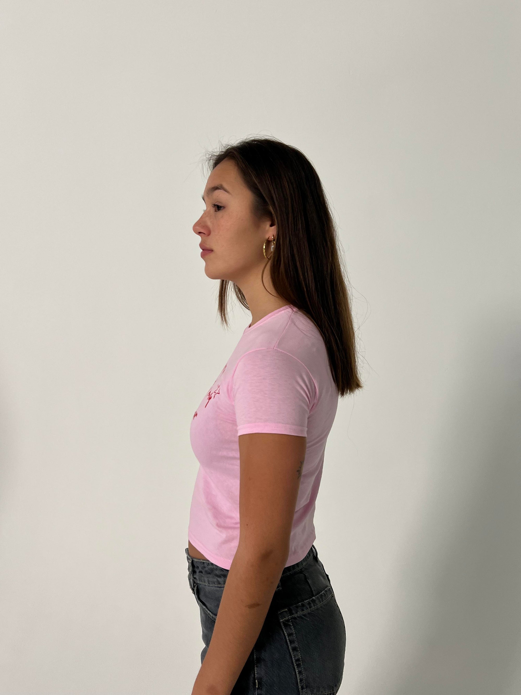 Fit: De er en børnestørrelse, for at skabe den perfekte baby tee-effekt, så vi anbefaler man går 1-2 størrelser op hvis man ønsker et mere oversize look. Derudover kan fittet også variere alt efter din størrelse ved dit bryst. Hvis du er tvivl, kan du tjekke vores størrelsesguide ud.