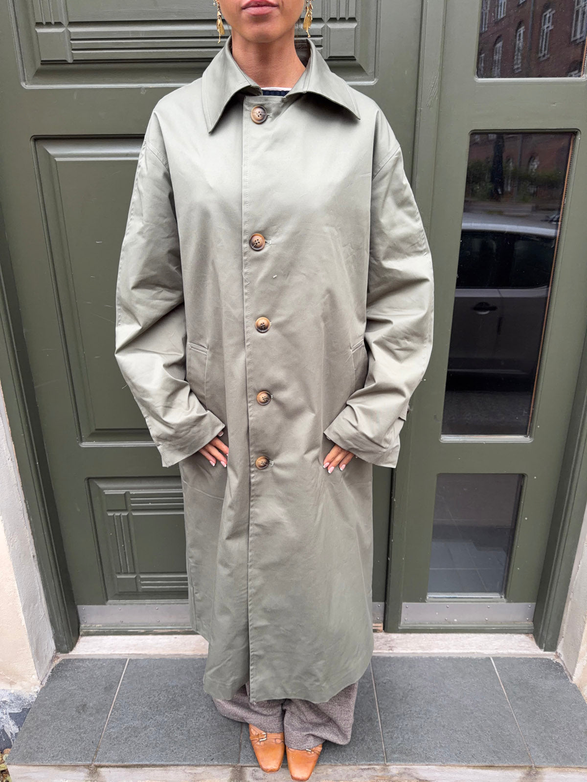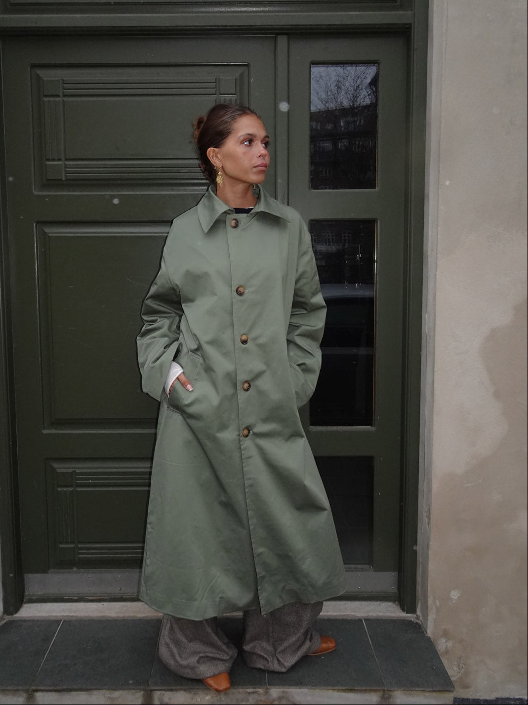 Denne lange trenchcoat i en smuk olivengrøn nuance er et tidløst og alsidigt overgangsstykke, der passer perfekt til både forår og efterår. Jakken har et klassisk dobbeltknapluk-system, som giver et eksklusivt og struktureret udtryk, mens de justerbare ærmestropper med knapdetaljer fuldender det ikoniske trenchcoat-look.