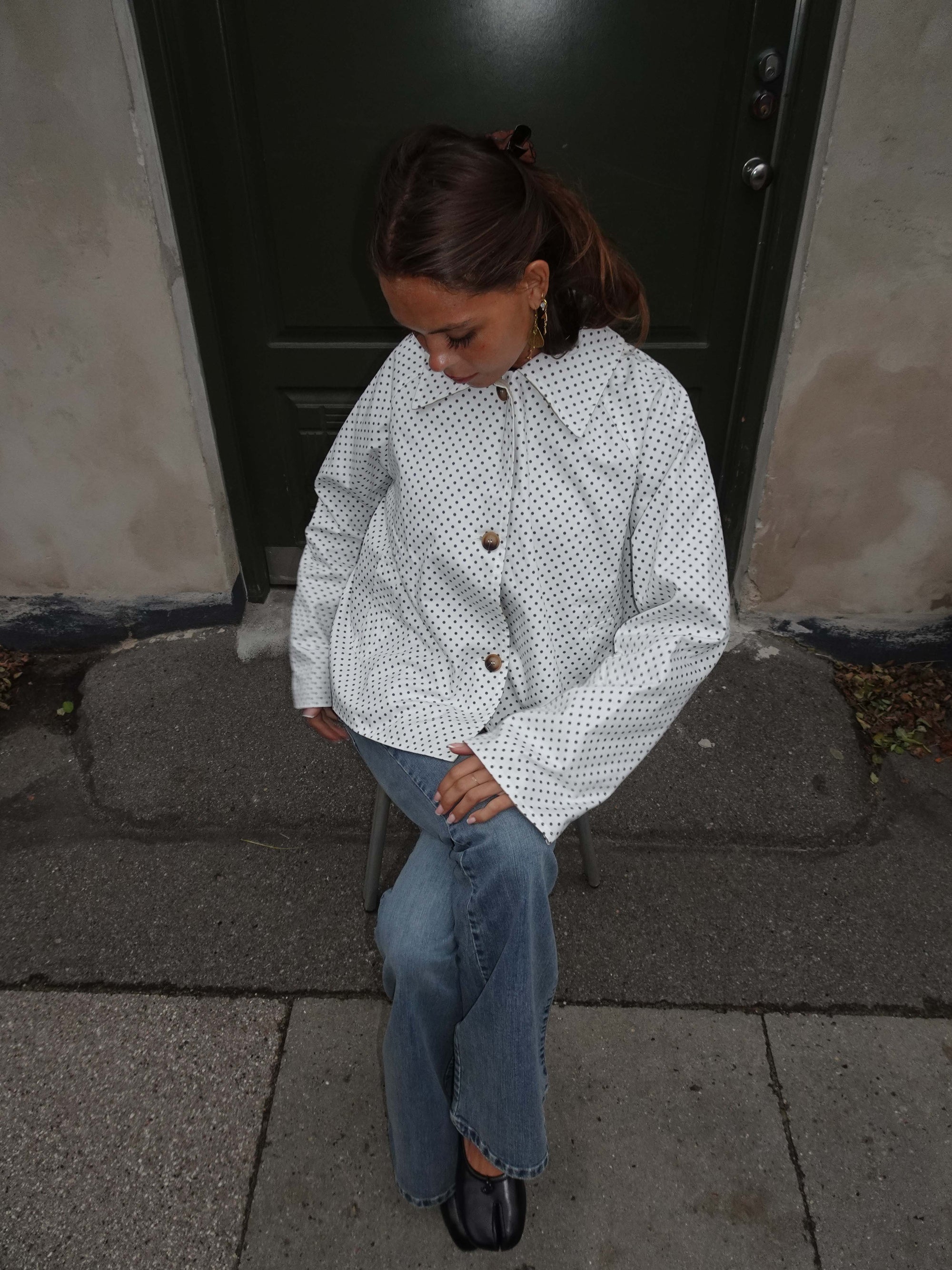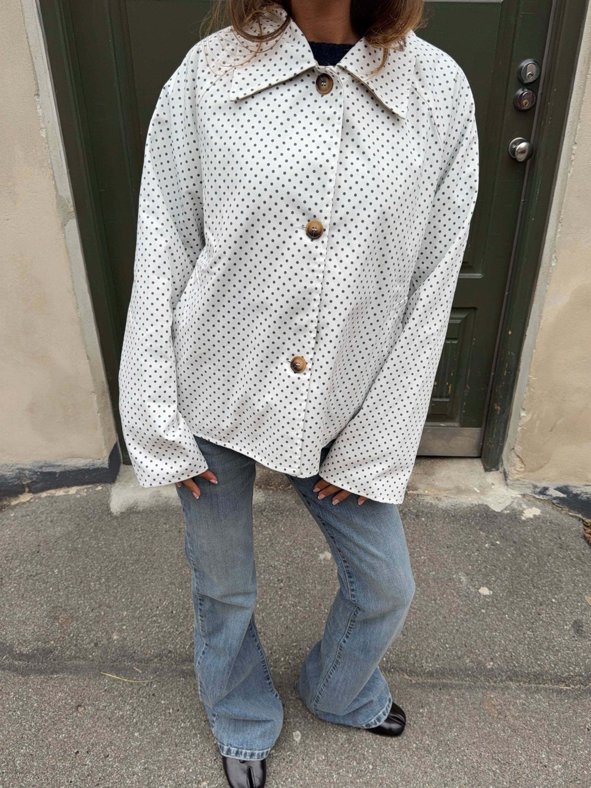 En kort, hvid jakke med små sorte prikker i et jævnt polkaprint. Jakken har en klassisk krave, lange ærmer og en lige, boxy pasform. Den lukkes med tre synlige knapper foran og har diskrete sidelommer, som giver et enkelt og stilrent udtryk. Stoffet fremstår let og glat, perfekt til et frisk og moderne look. Jakken er vendbar og kan bruges med begge sider ud.