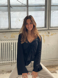 Den flotteste satin bluse som har lange og vide ærmer og en løs pasform. Blusen har bindedetaljer foran og en v-udskæring.