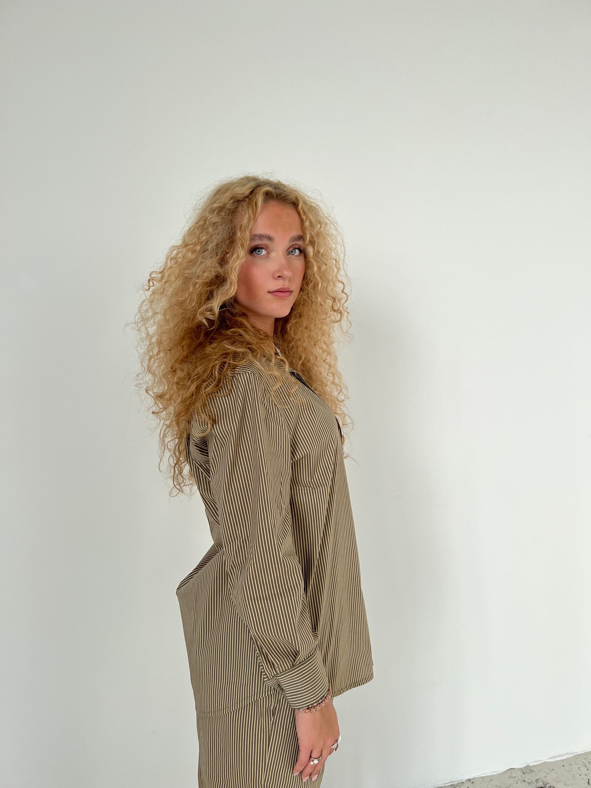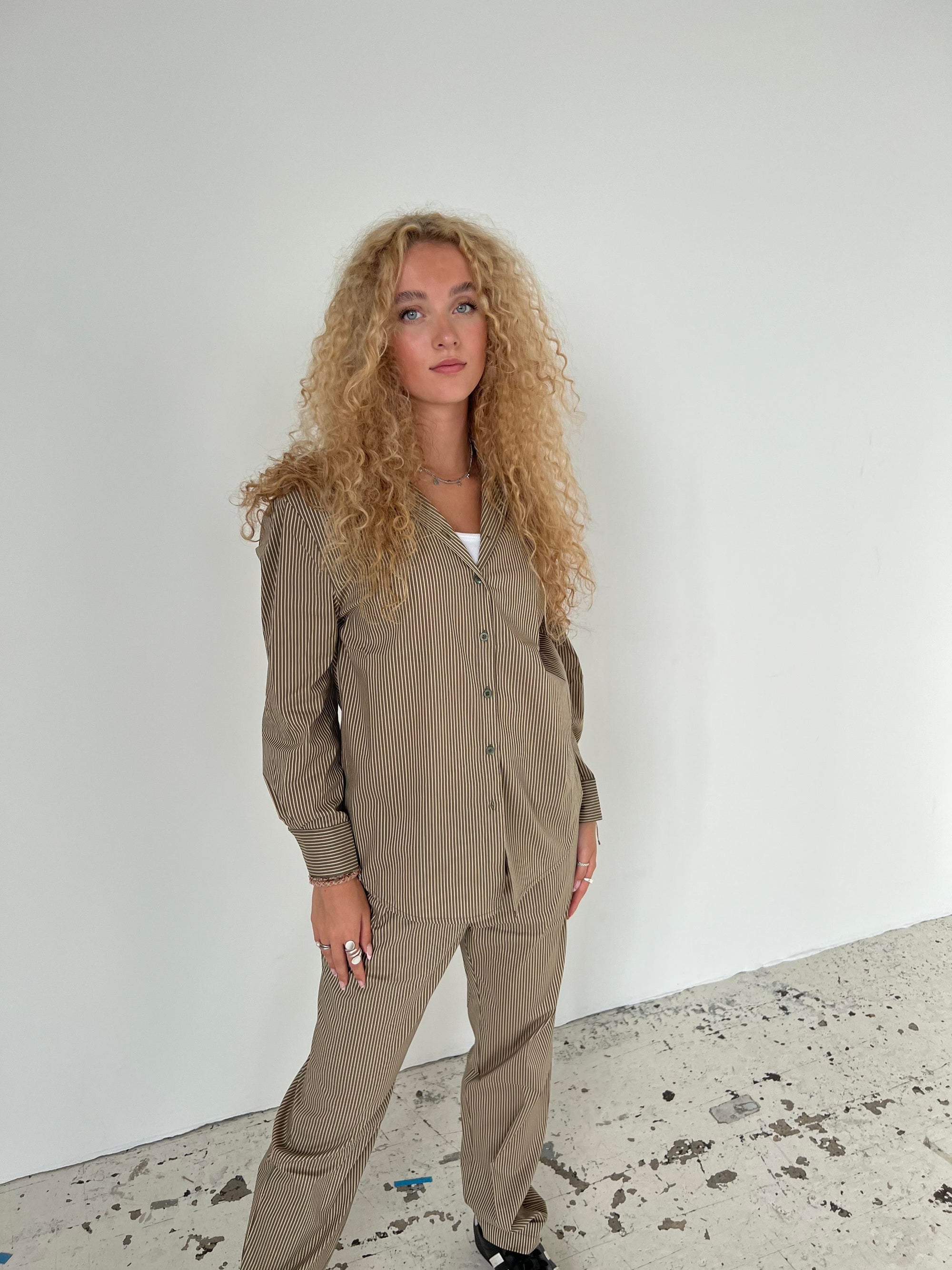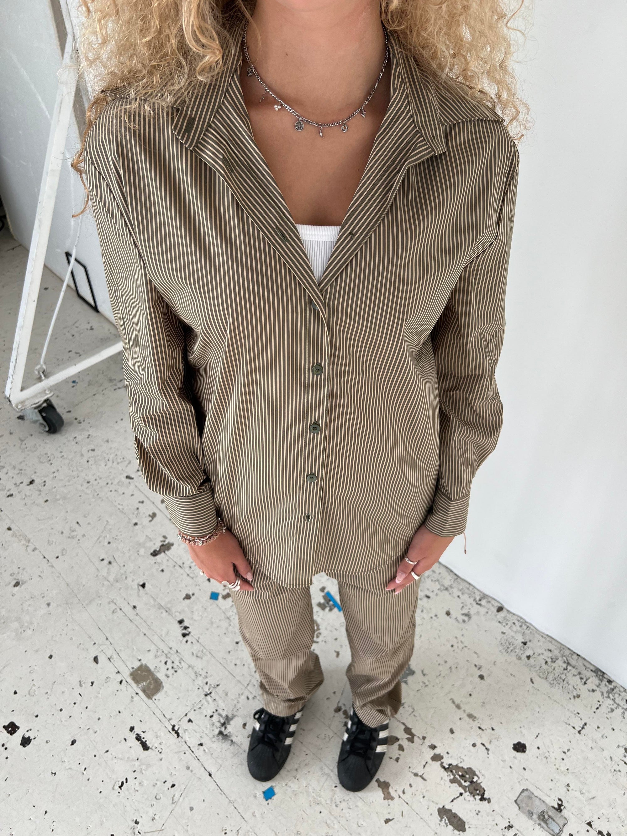 Klassisk skjorte med kaki striber. Denne skjorte er designet med et oversized fit, med knapper ned langs, samt på ærmerne. Passer perfekt med vores Zuri bukser og Zuri shorts med kaki striber.