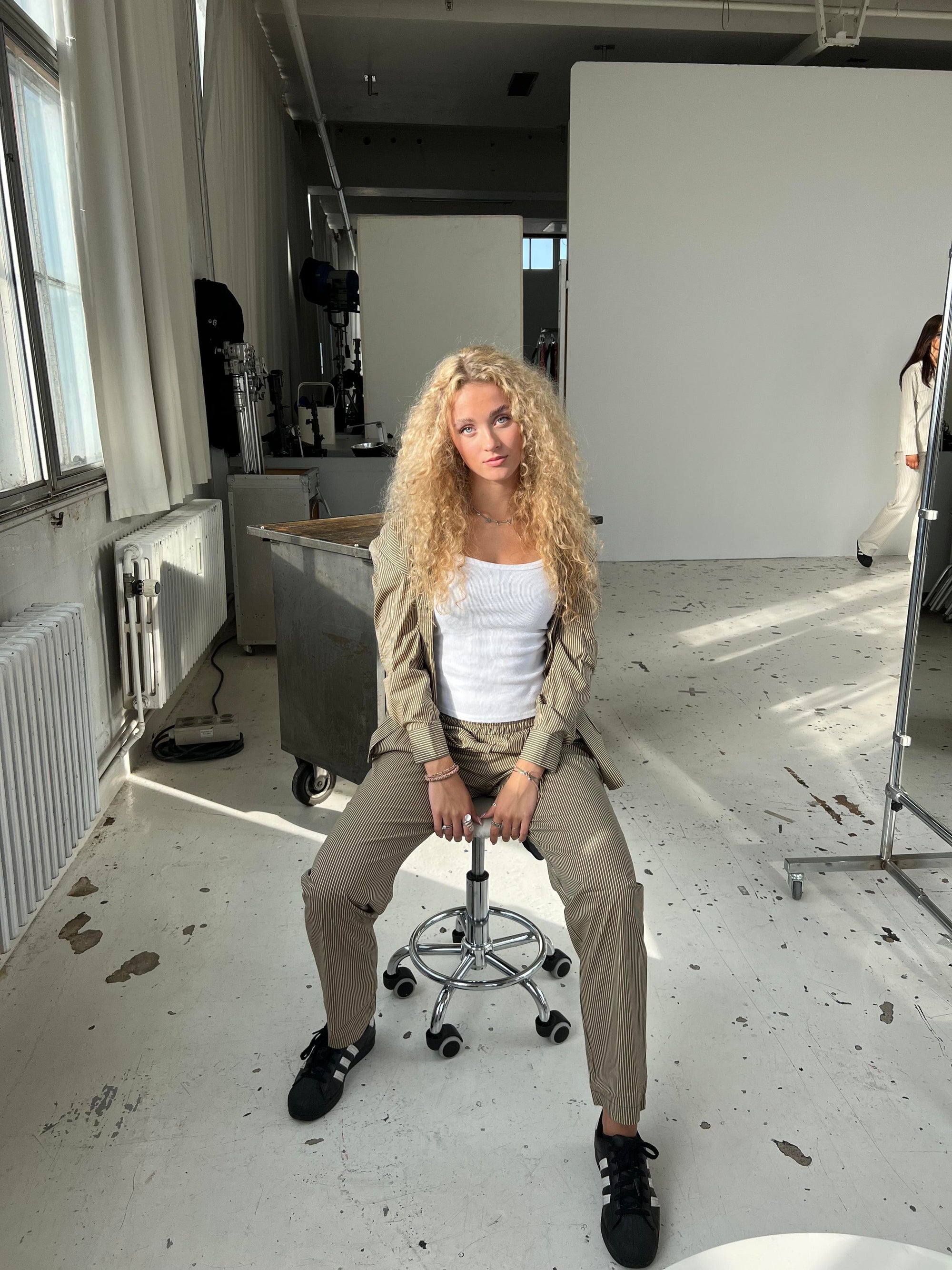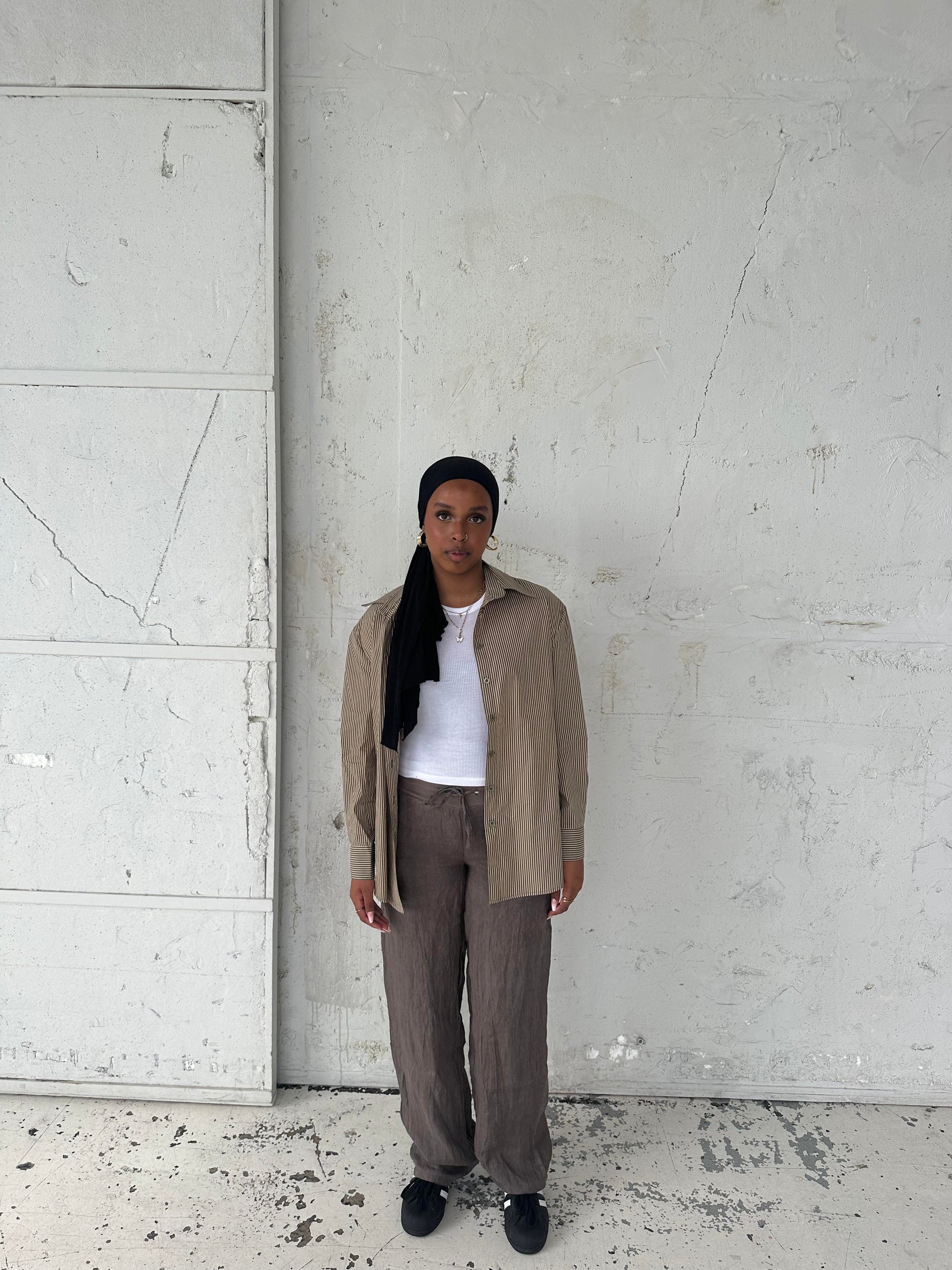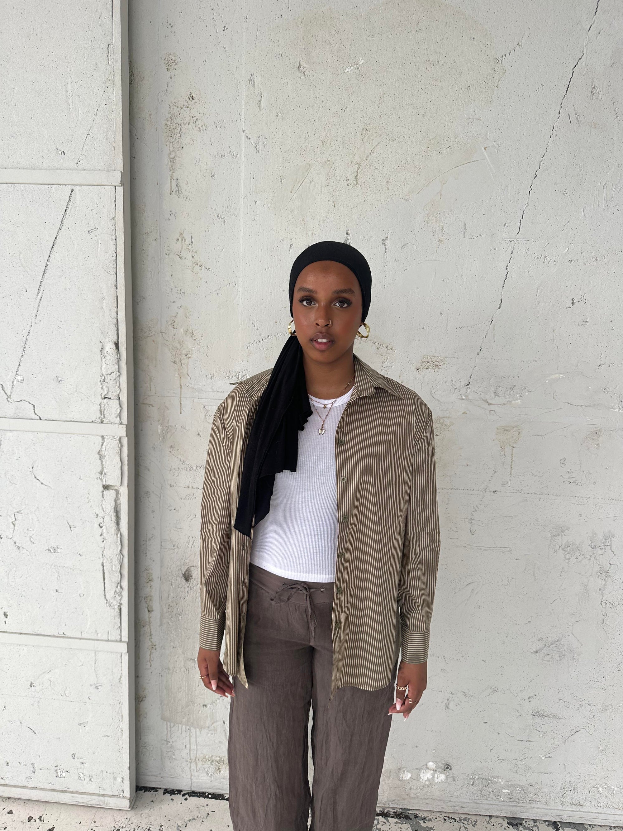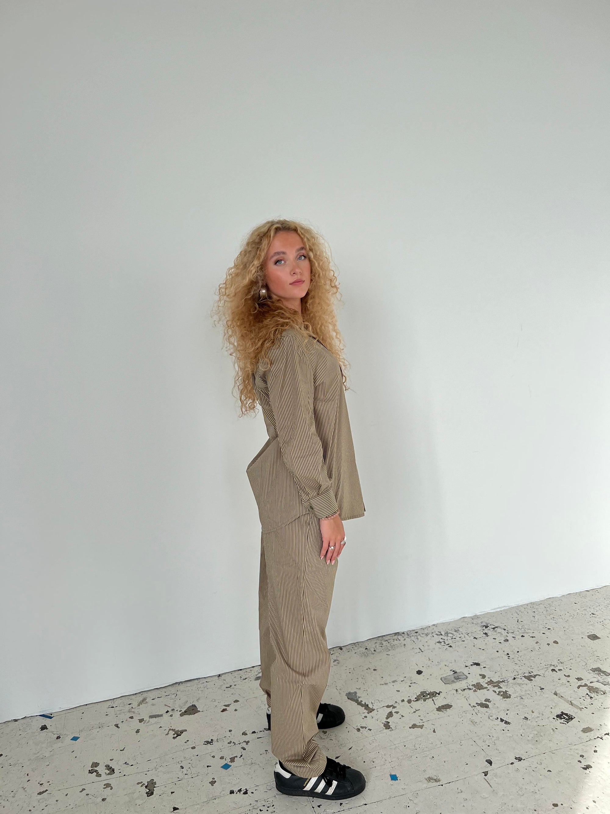 Klassisk skjorte med kaki striber. Denne skjorte er designet med et oversized fit, med knapper ned langs, samt på ærmerne. Passer perfekt med vores Zuri bukser og Zuri shorts med kaki striber.