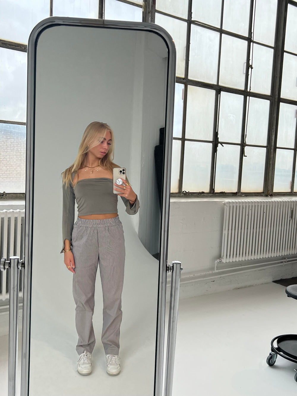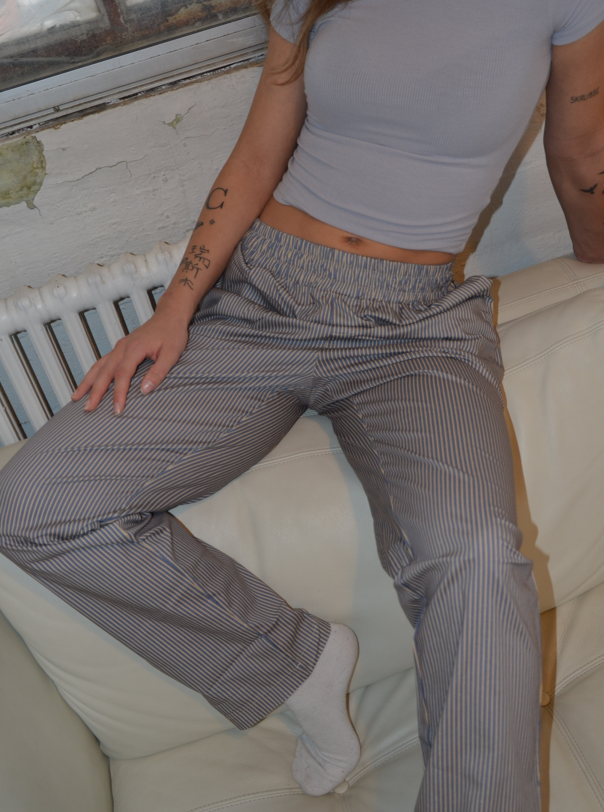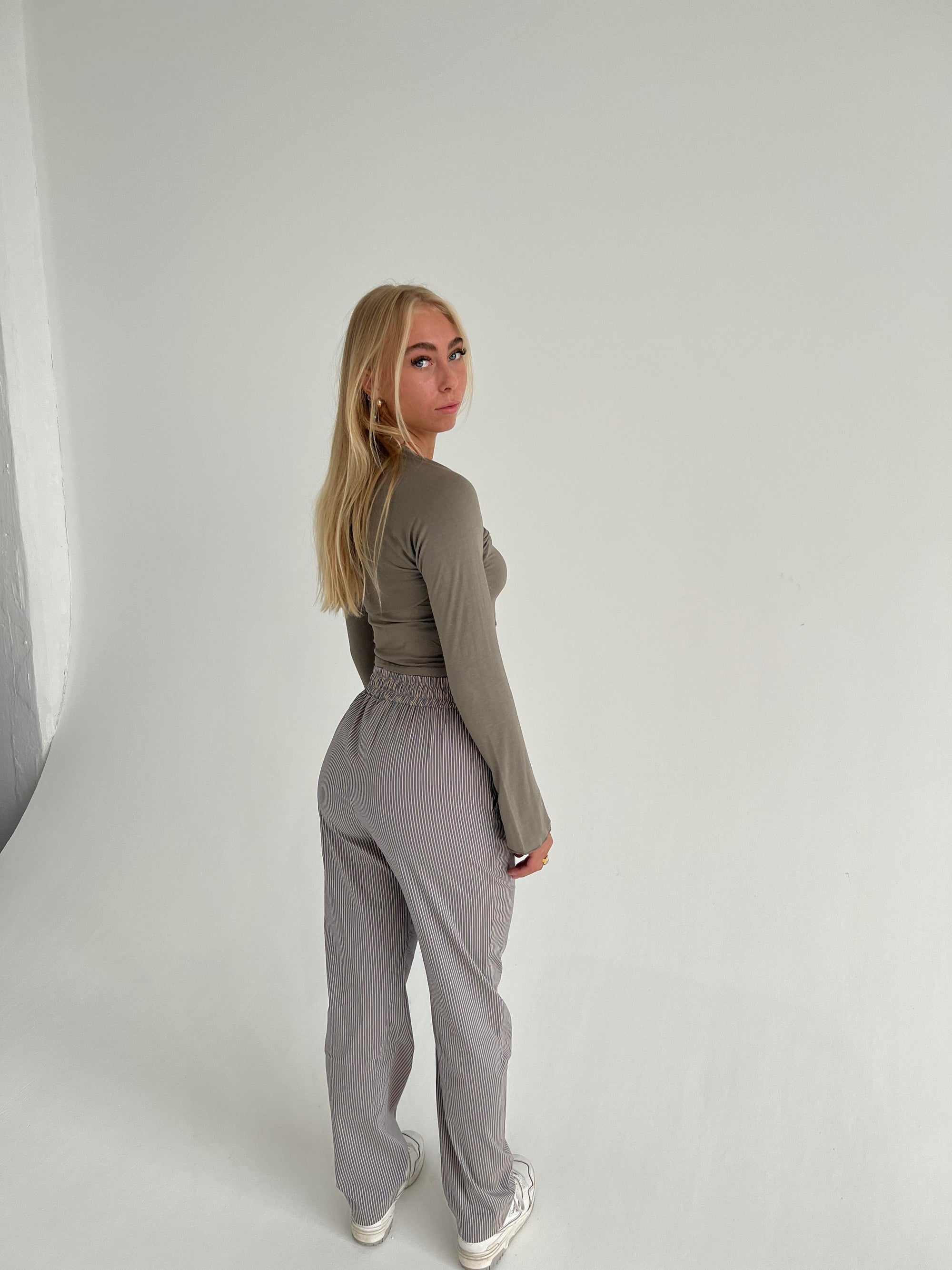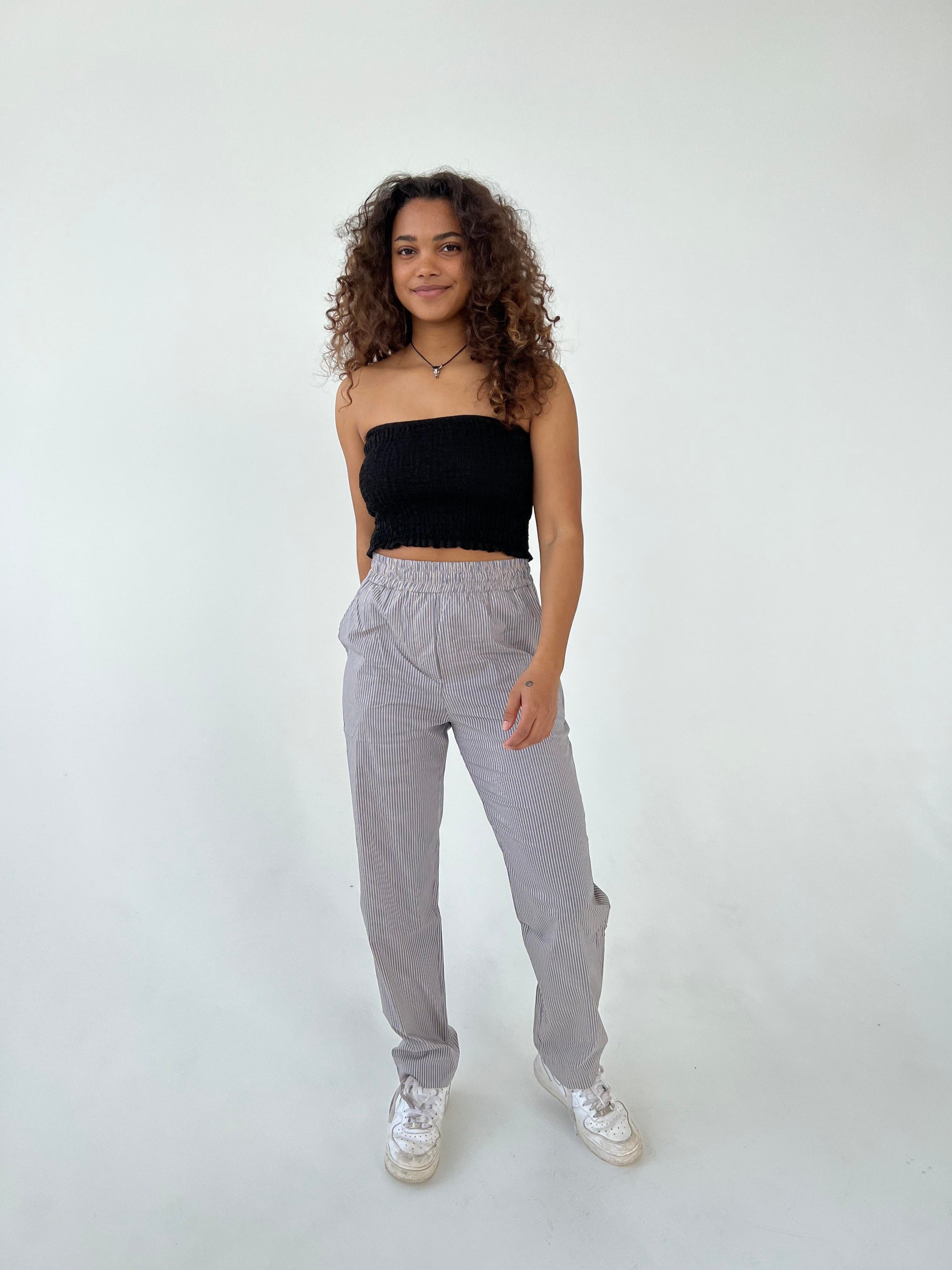 Dine go-to straight fit stribet bukser med lommer. De perfekte bukser til et afslappende hverdags outfit. Med det loose fit kan du style dem til alle hverdagens begivenheder, og føle dig både komfortabel og selvsikker. Bukserne har lommer og elastik taljebånd.