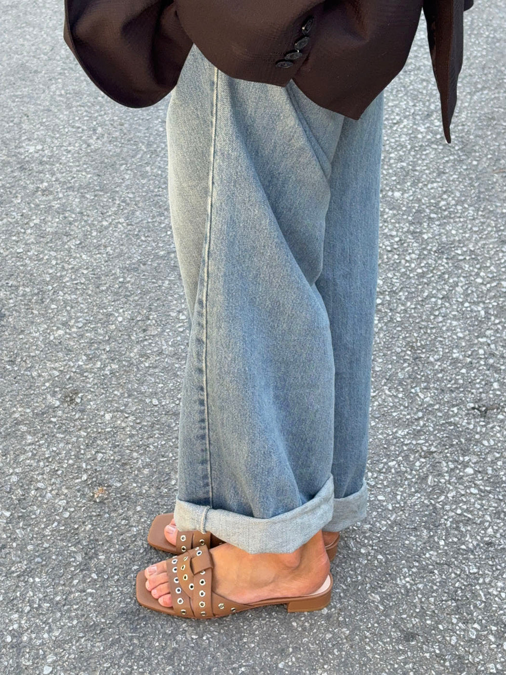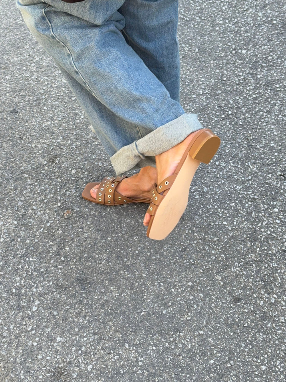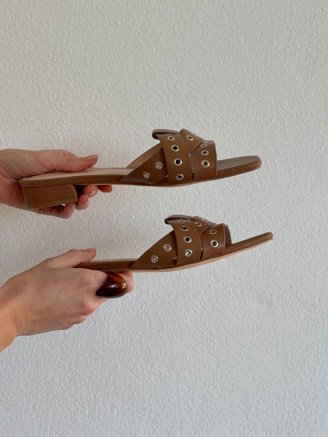 Disse karamelbrune sandaler med metalringe kombinerer feminin elegance med et moderne, råt udtryk. De brede, krydsede remme prydes af sølvfarvede ringdetaljer, der tilfører designet karakter og kant, mens den firkantede snude og lave hæl giver et stilrent og nutidigt look.