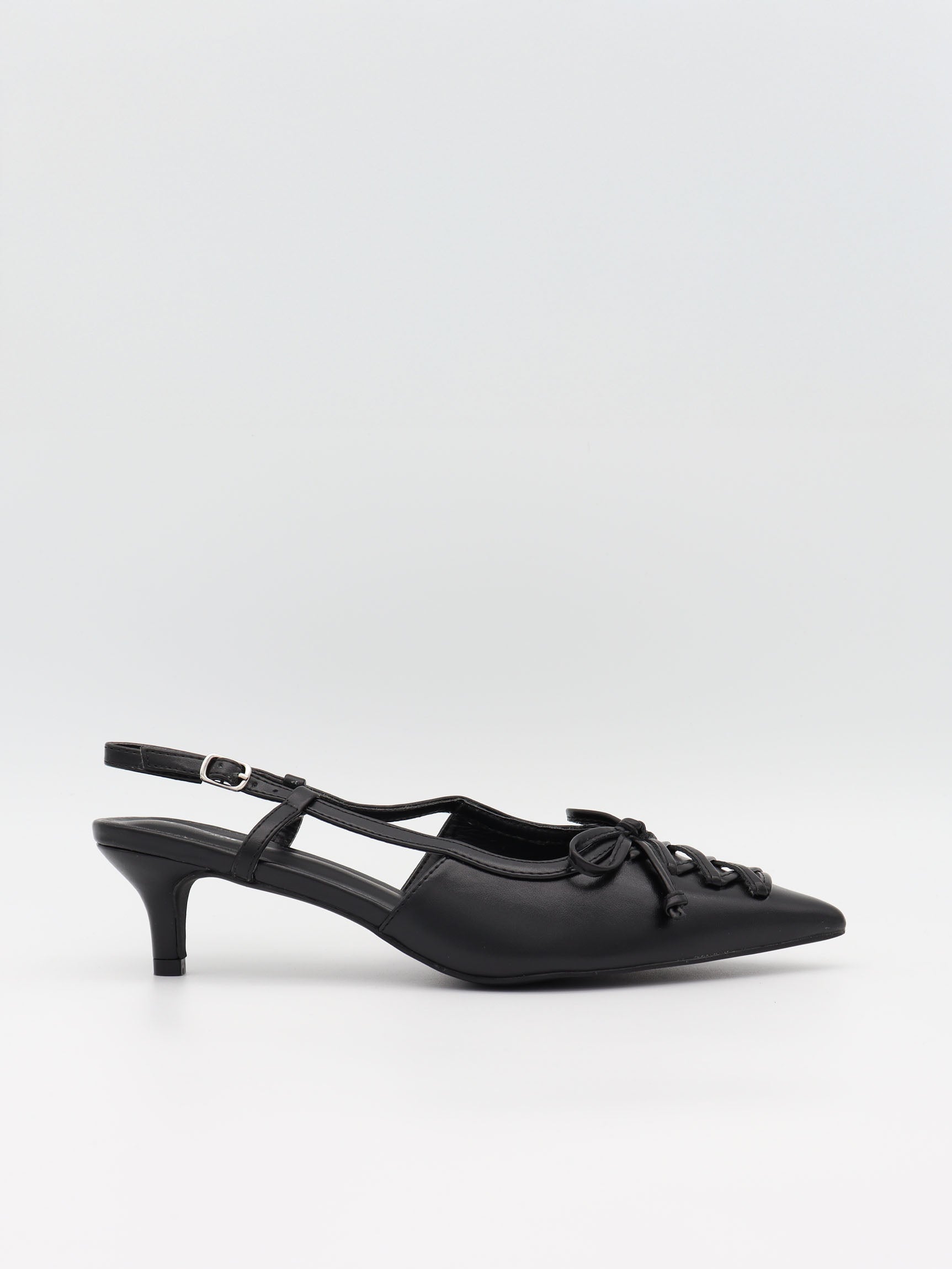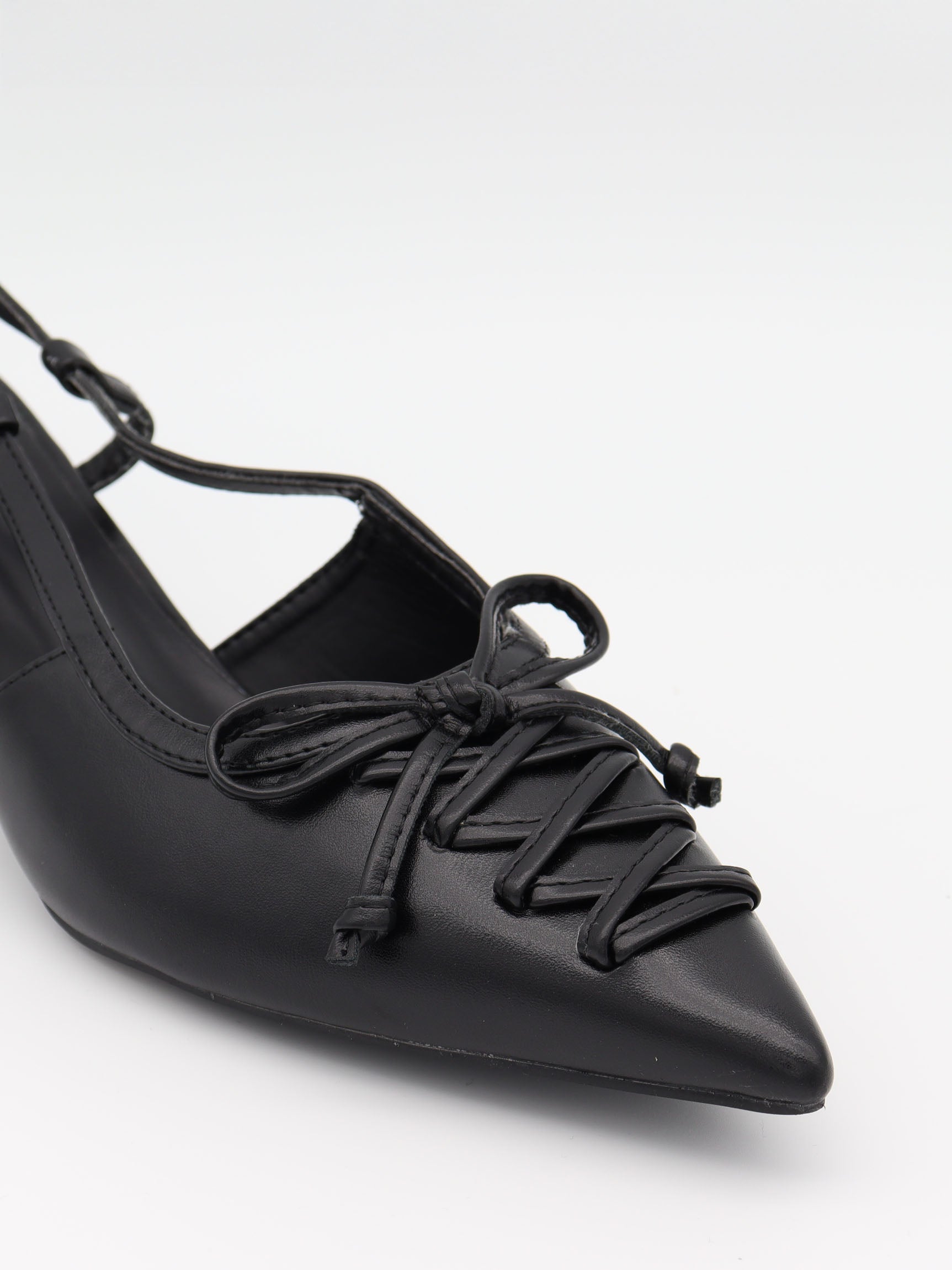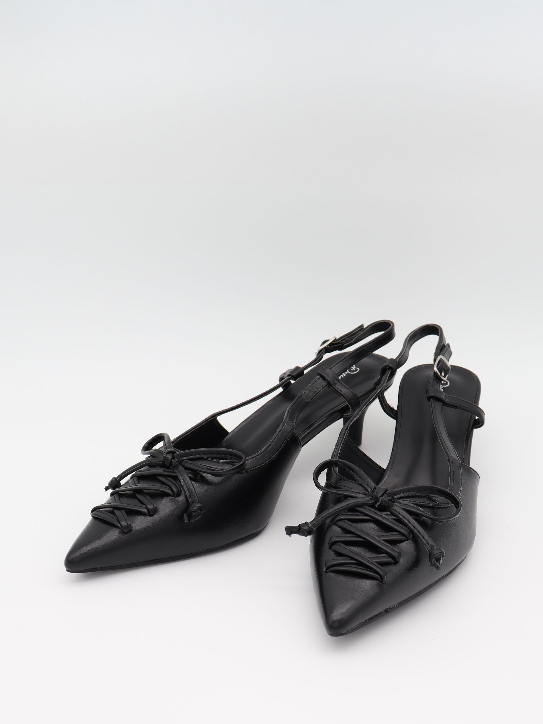 Disse sorte slingback-mules kombinerer klassisk elegance med et moderne, markant twist. Den spidse snude og snøredetaljerne foran tilfører et sofistikeret og let dramatisk udtryk, mens den åbne hæl med justerbar rem giver et feminint og luftigt look. Den lave hæl gør dem behagelige at bære, uden at gå på kompromis med stil eller attitude. Perfekte til både kontor og aftenbrug – et par sko, der forener raffineret design med selvsikkerhed og kant.