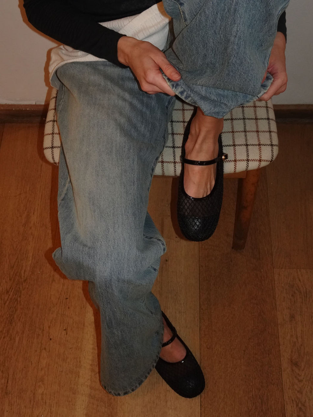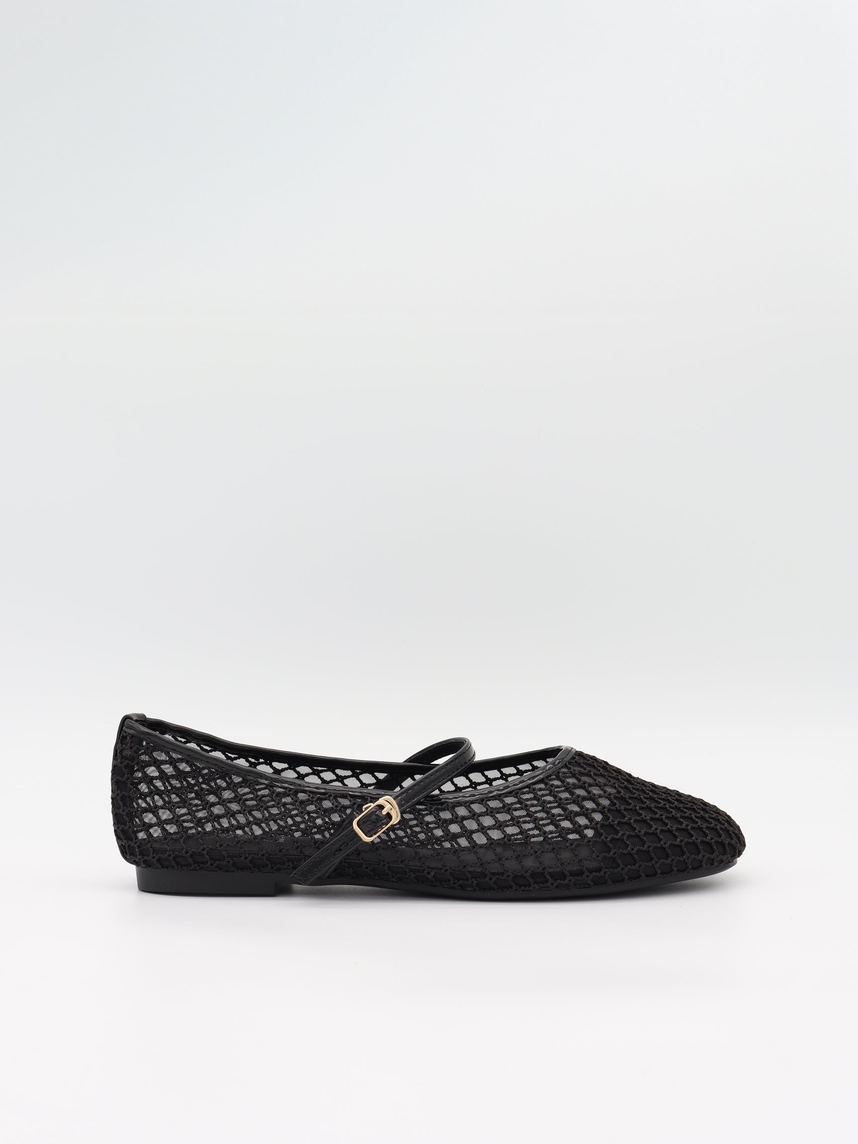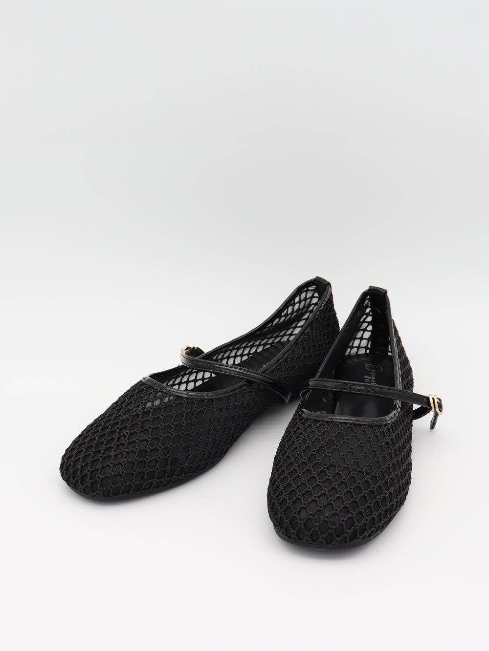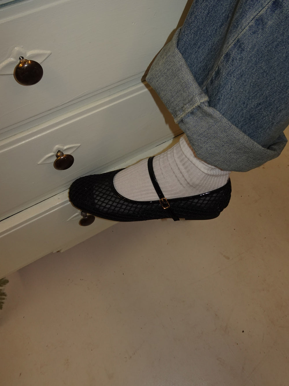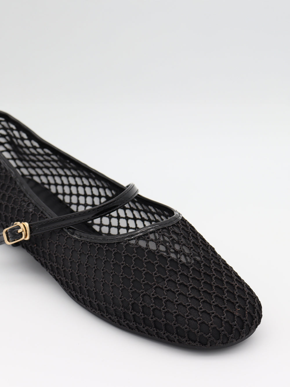 Disse sorte mesh-ballerinaer kombinerer komfort og elegance med et moderne twist. Den fine netstruktur giver skoene et let og luftigt udtryk, mens den slanke rem med gulddetalje tilfører et feminint og sofistikeret touch. De er perfekte til både hverdag og mere afslappede anledninger, og kan styles med alt fra jeans til sommerkjoler. Et alsidigt valg, der giver dit outfit et chic løft.