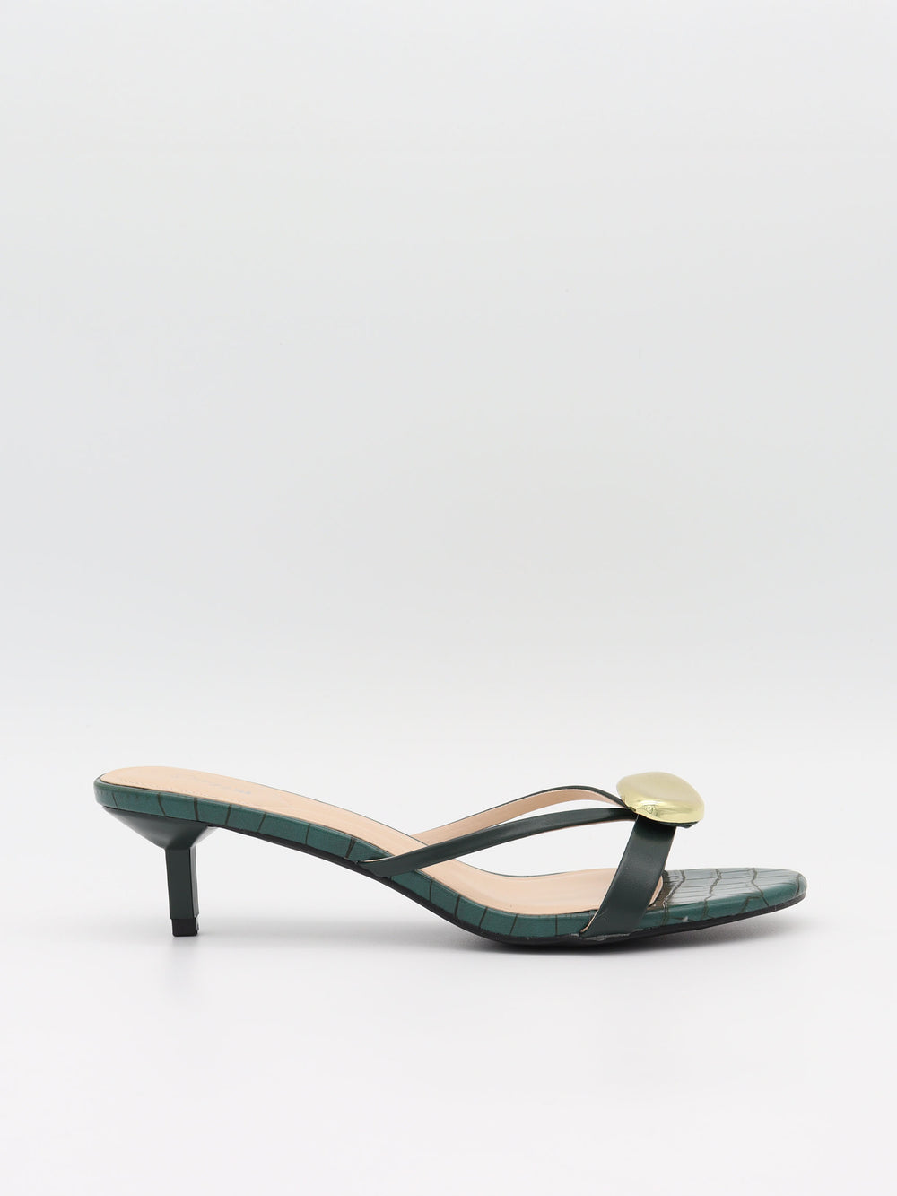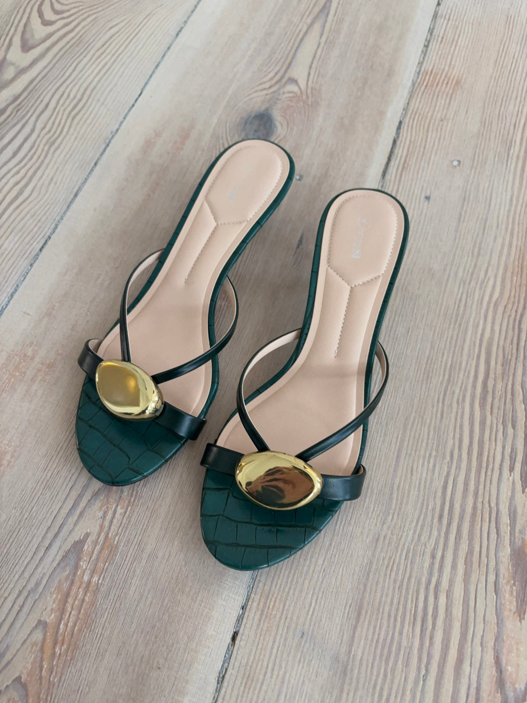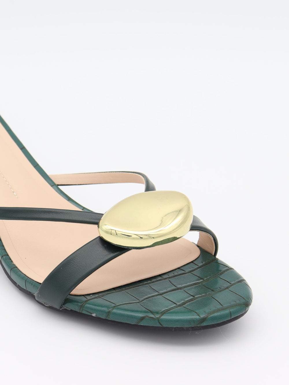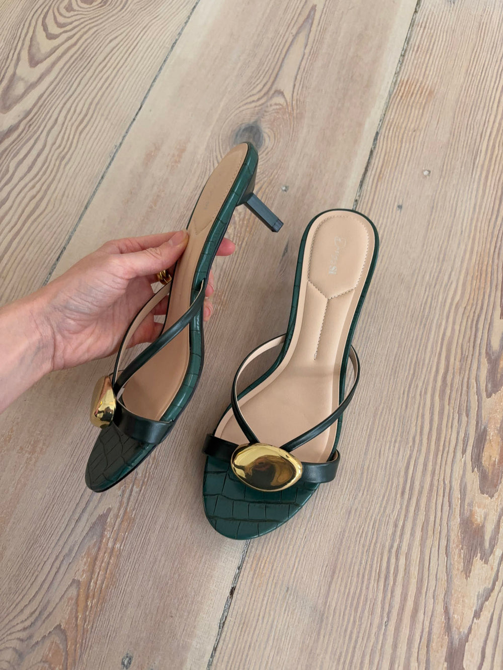 Disse elegante grønne hælsandaler kombinerer minimalistisk design med et eksklusivt touch. De fine, krydsende stropper skaber et let og feminint udtryk, mens den brede frontrem prydes af en smuk, blank gulddetalje, der løfter hele sandalen og tilføjer et luksuriøst finish. Den stabile, slanke hæl gør dem både stilfulde og behagelige at gå i, og den let præget sål i croco-look giver ekstra kant.