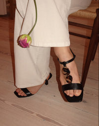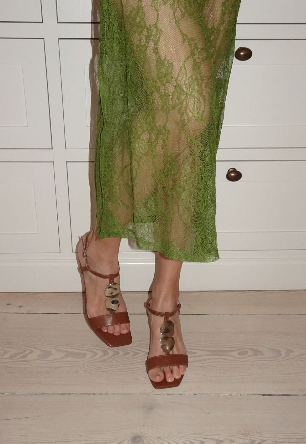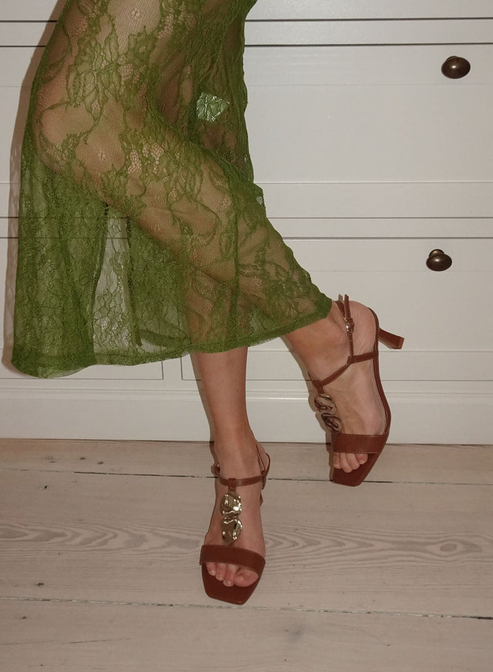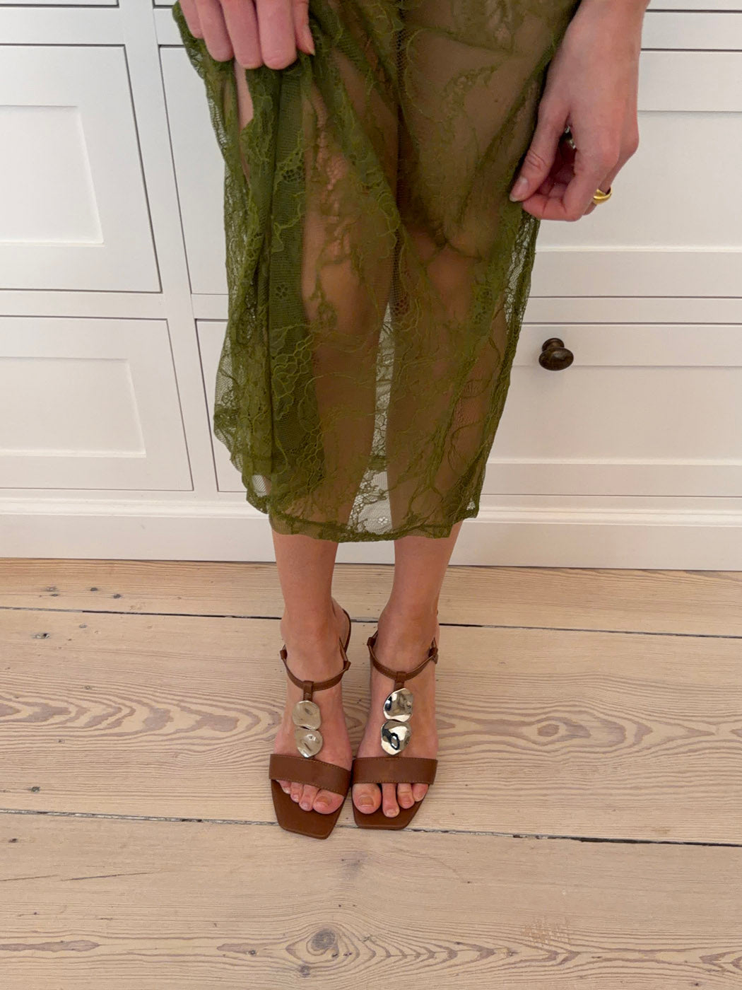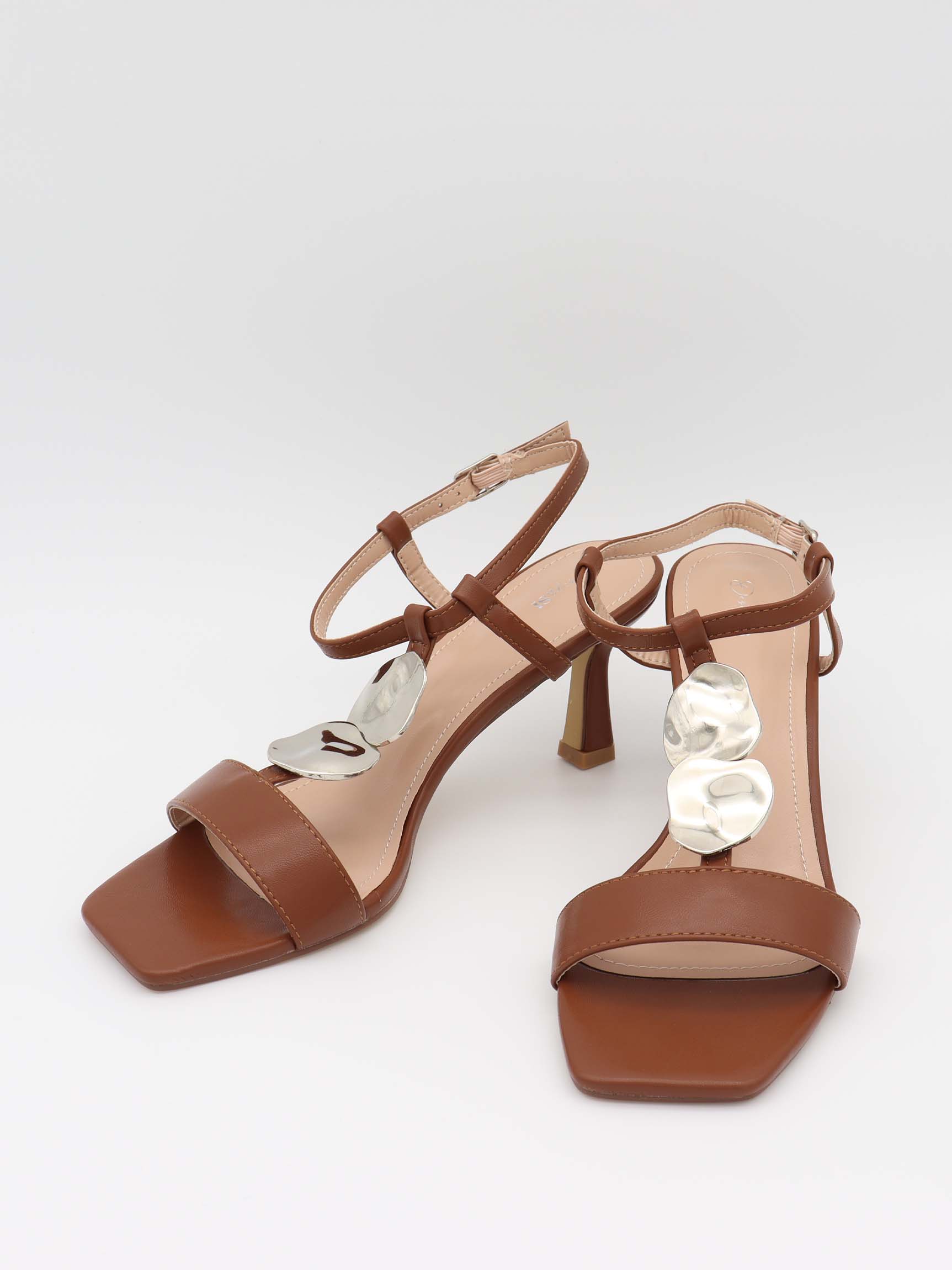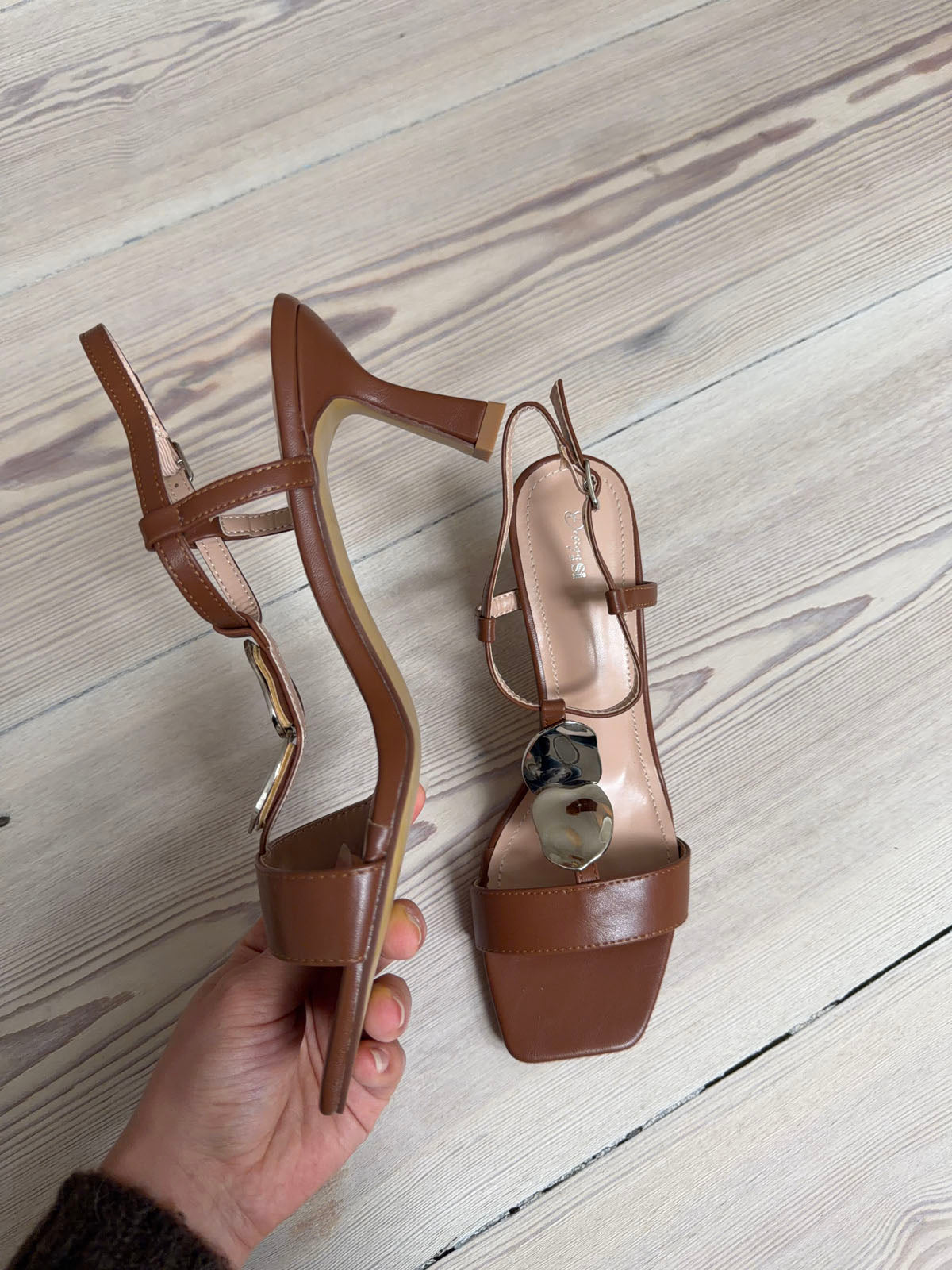 Disse stilfulde sandaler i en varm brun nuance forener den klassiske strophæl med eksklusive detaljer. De tre sølvfarvede dekorative elementer på forfoden tilføjer et glamourøst look og iøjnefaldende touch, mens de fine remme giver et feminint og sofistikeret udtryk.