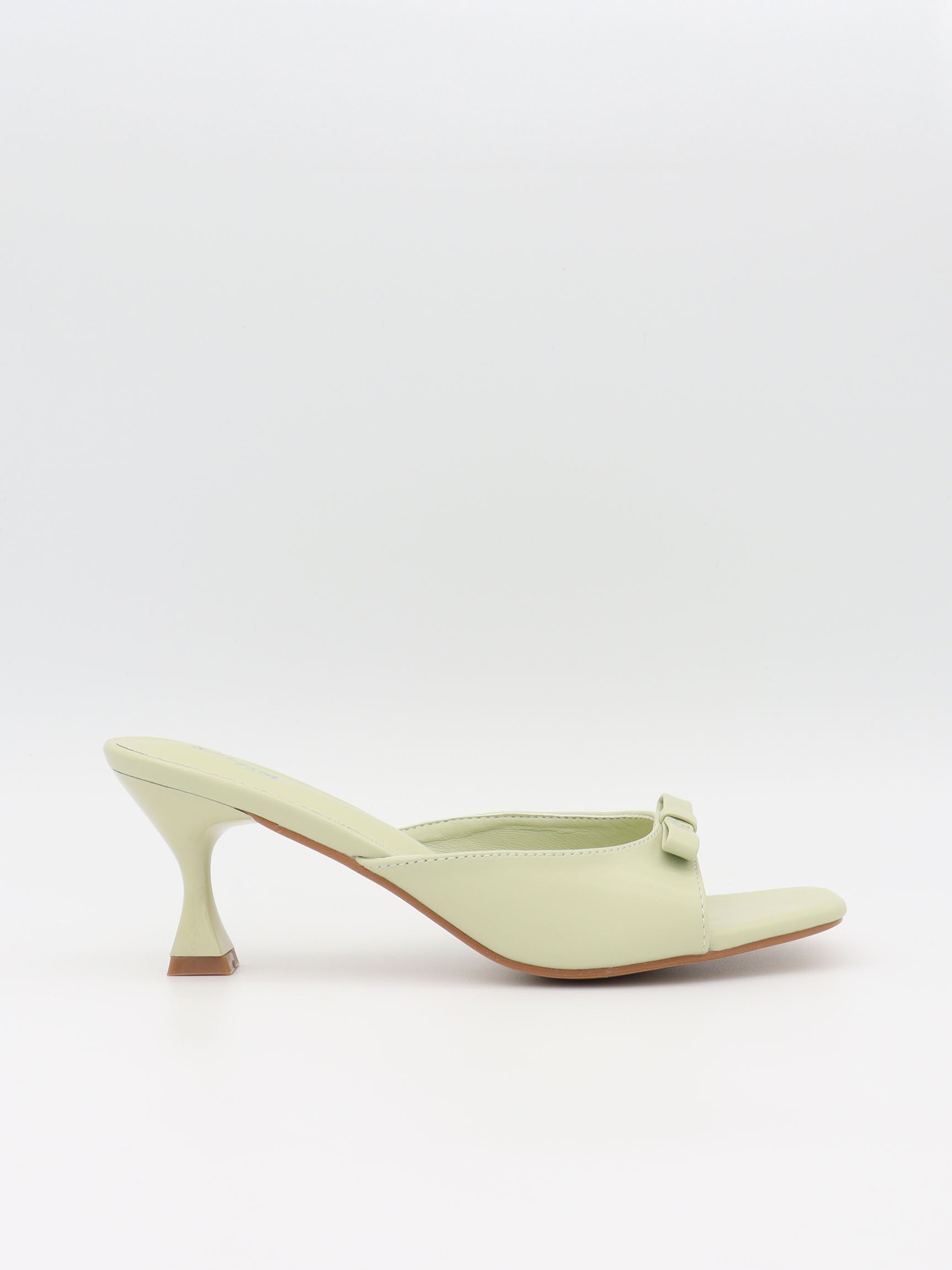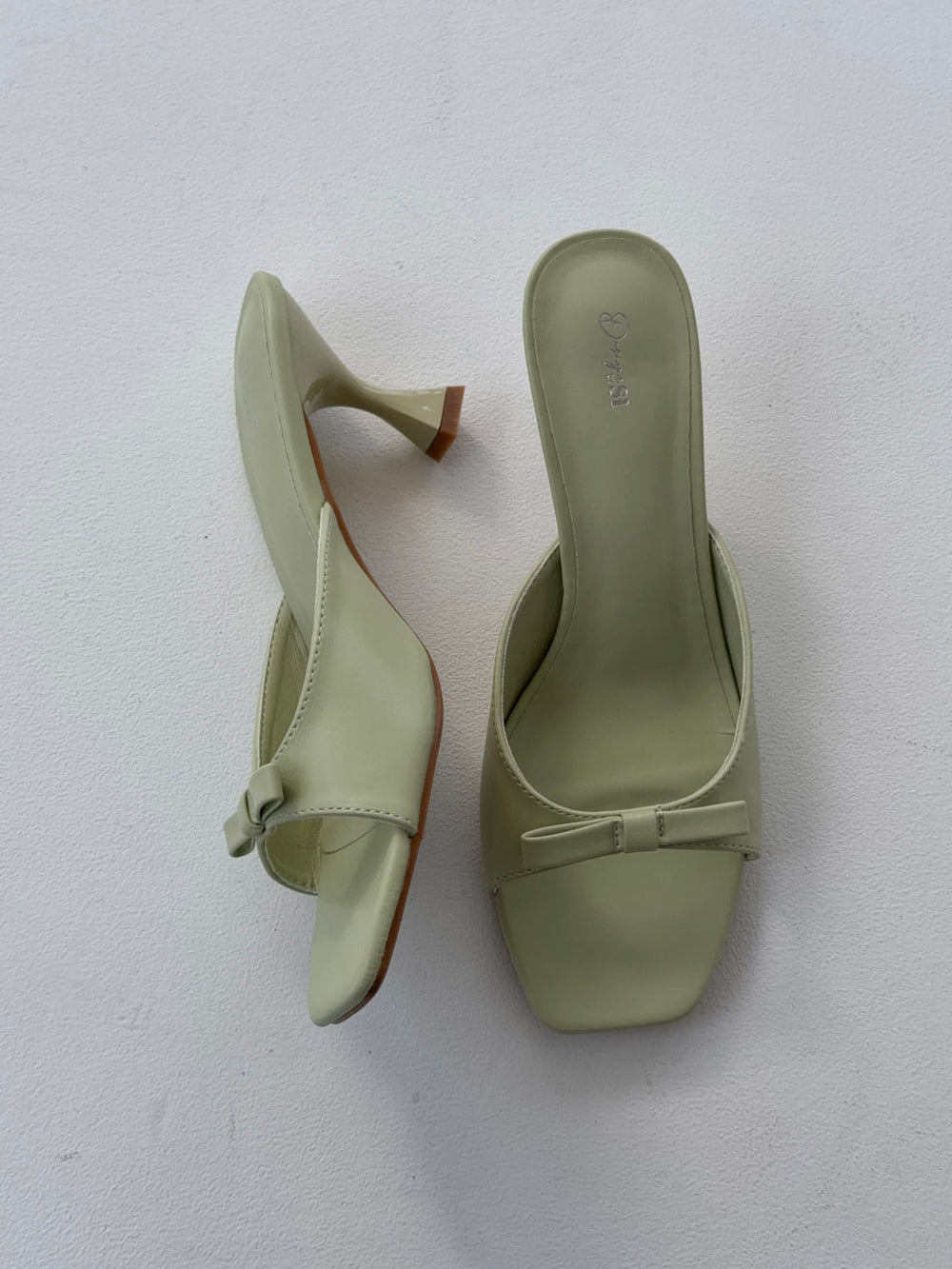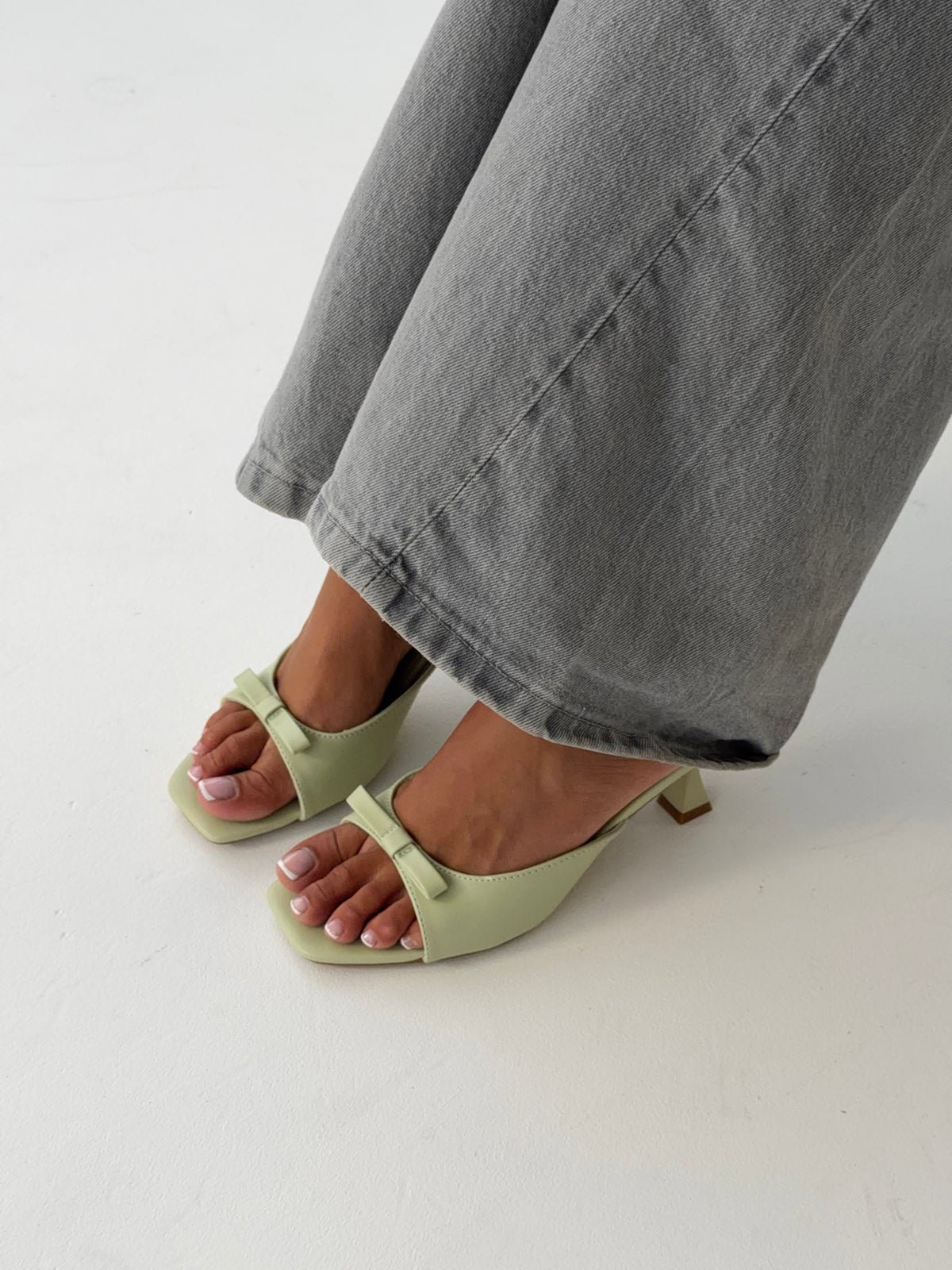 Tilføj et strejf af elegance til dit outfit med disse feminine mules i en smuk pastelgrøn nuance. Skoene har en moderne, firkantet snude og en elegant lille hæl, der giver et sofistikeret udtryk uden at gå på kompromis med komforten. Den fine sløjfedetalje foran fuldender det feminine look og gør dem perfekte til både hverdag og fest.