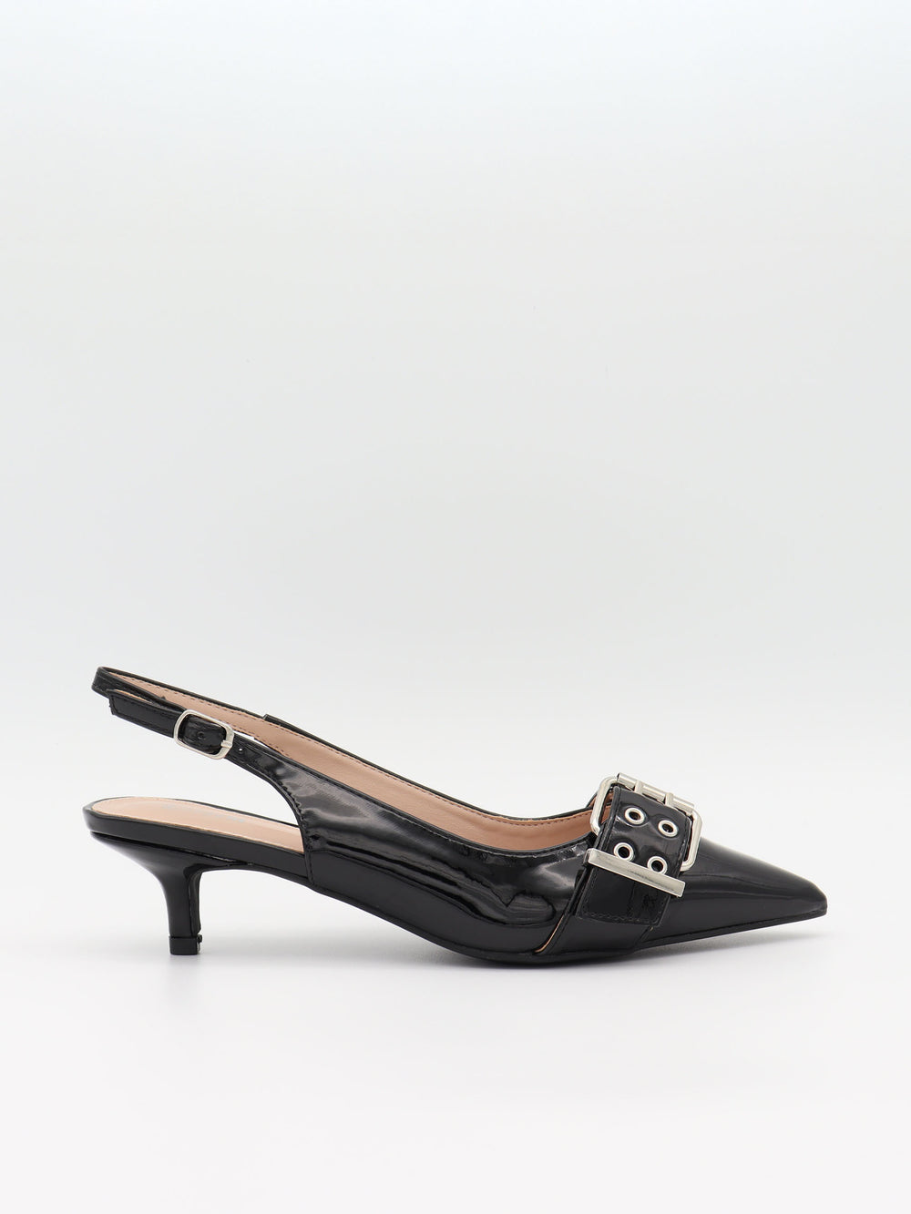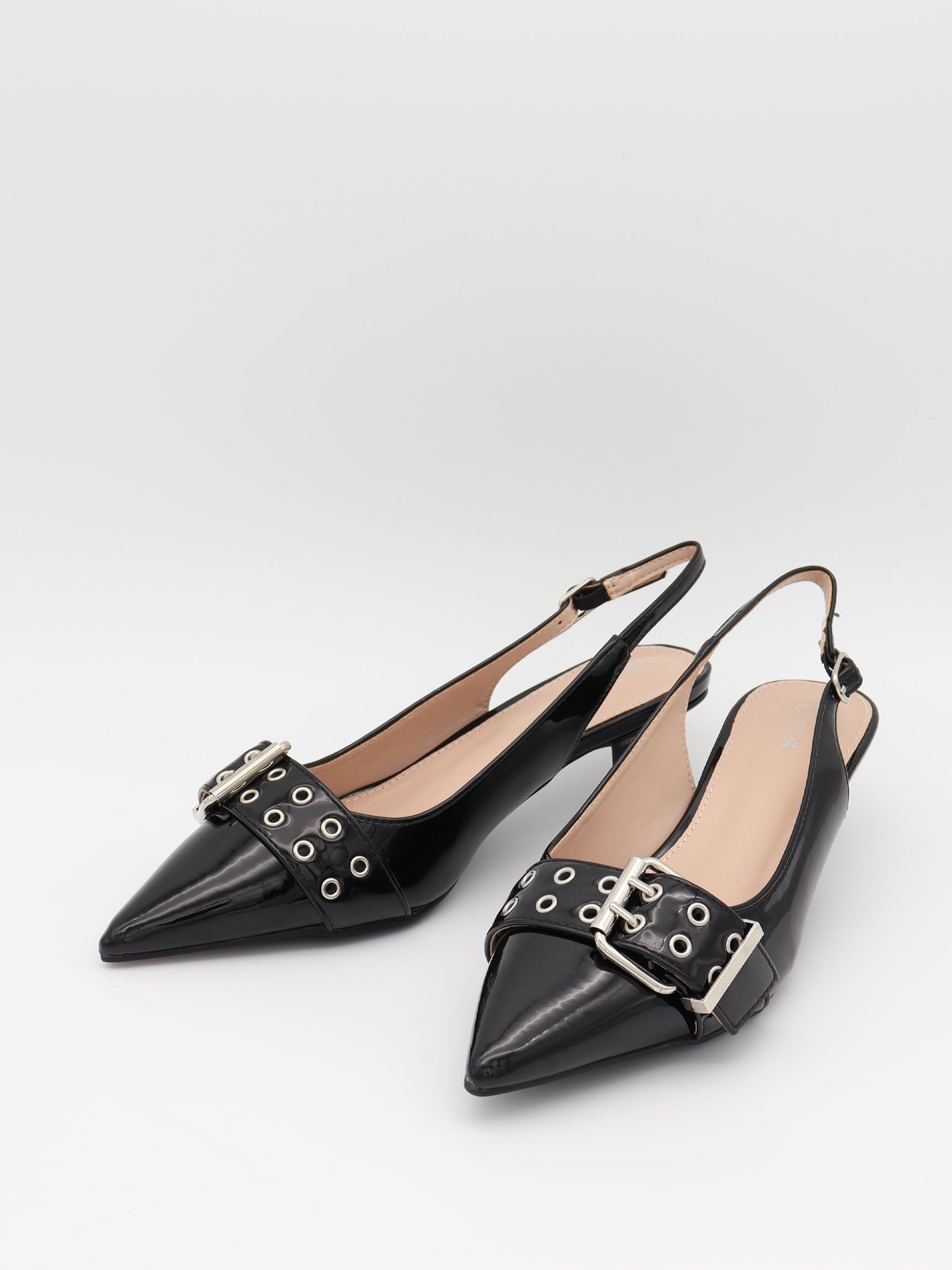 Disse slingback-mules i sort lak kombinerer femininitet med et råt og moderne udtryk. Den spidse snude og elegante hæl skaber en slank silhuet, mens den brede rem med sølvnitter og spænde tilfører et markant, stilbevidst element. Den dybe røde tone og den blanke overflade giver et eksklusivt look, perfekt til at løfte både enkle hverdagsoutfits og festlige styles. En sko, der balancerer mellem klassisk elegance og selvsikker attitude – ideel til dig, der vil skille dig ud med stil.