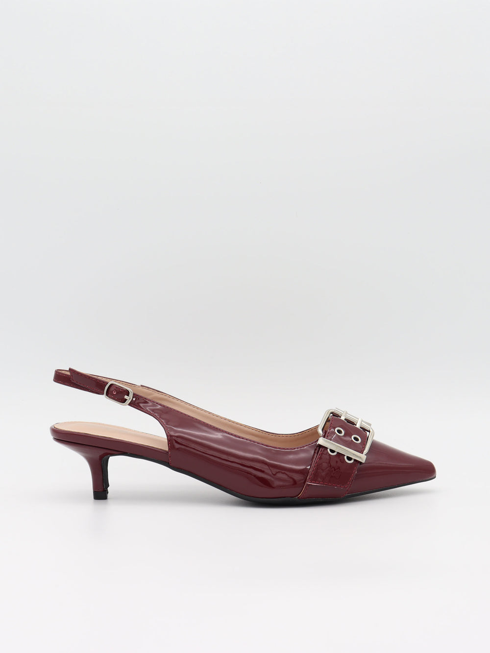 Disse slingback-mules i vinrød lak kombinerer femininitet med et råt og moderne udtryk. Den spidse snude og elegante hæl skaber en slank silhuet, mens den brede rem med sølvnitter og spænde tilfører et markant, stilbevidst element. Den dybe røde tone og den blanke overflade giver et eksklusivt look, perfekt til at løfte både enkle hverdagsoutfits og festlige styles. En sko, der balancerer mellem klassisk elegance og selvsikker attitude – ideel til dig, der vil skille dig ud med stil.
