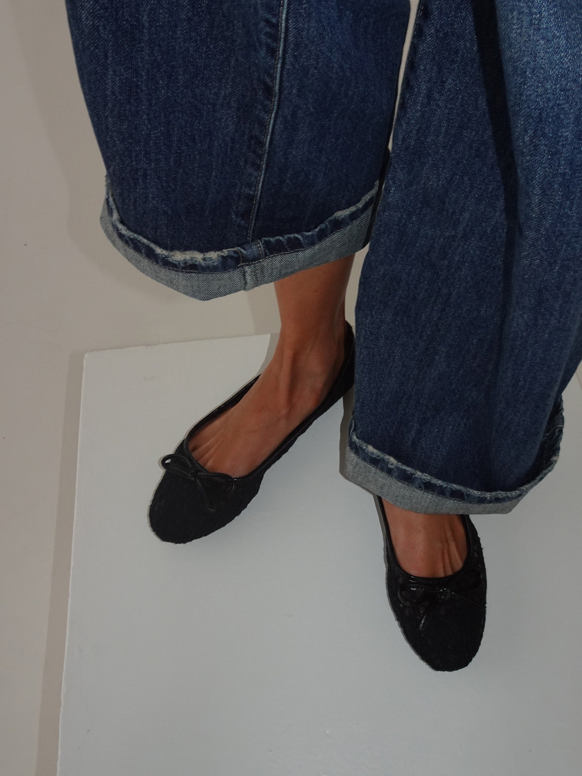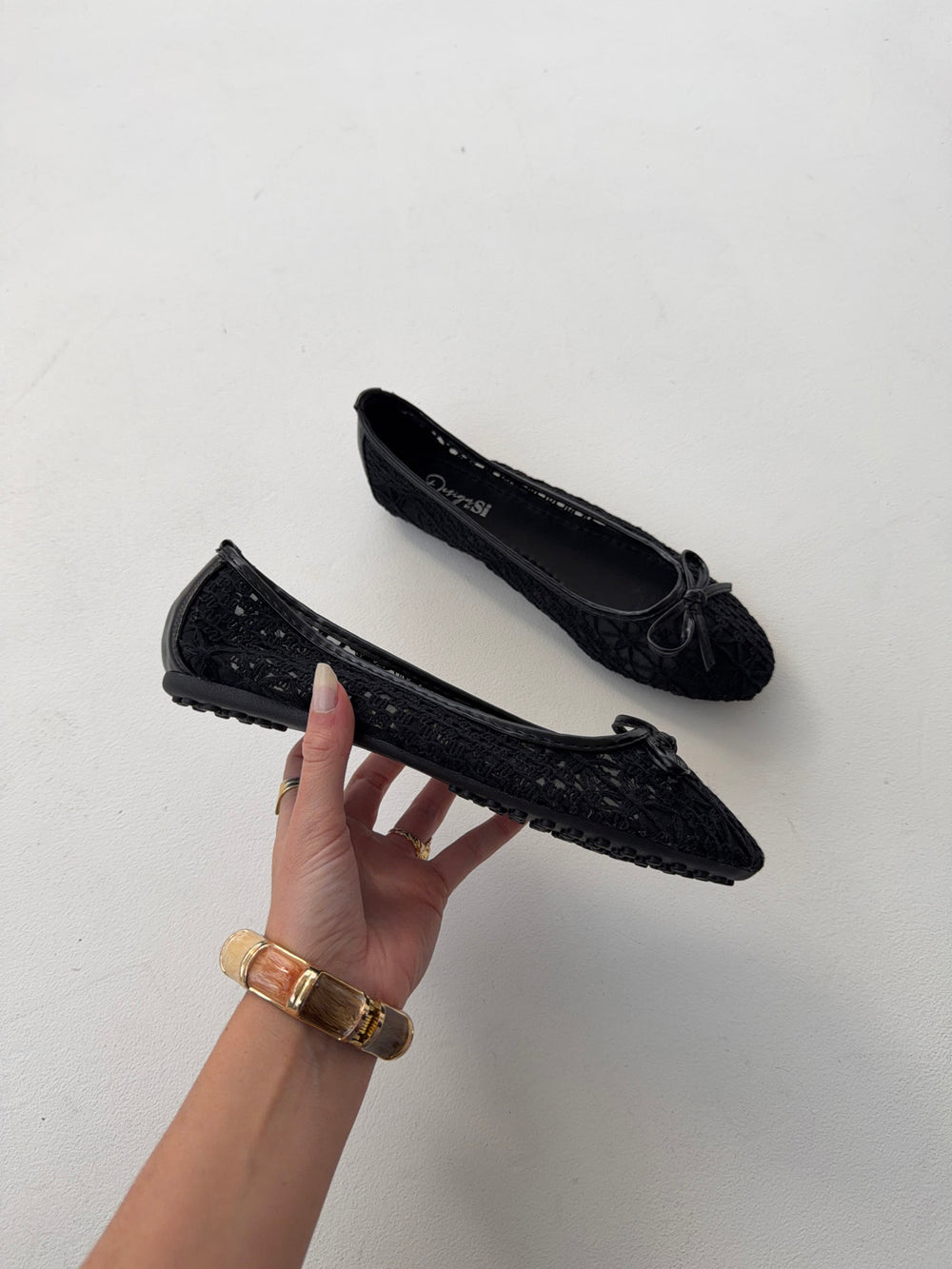 Capuchina ballerinaer er et elegant og tidløst valg, der kombinerer komfort med feminint design. Fremstillet i sort, let gennembrudt materiale med et diskret mønster, der giver skoen et sofistikeret og luftigt udtryk. Den klassiske rundede snude og den fine sløjfedetalje foran fuldender looket, mens den bløde sål sikrer god komfort – perfekt til både hverdagsbrug og mere elegante anledninger.