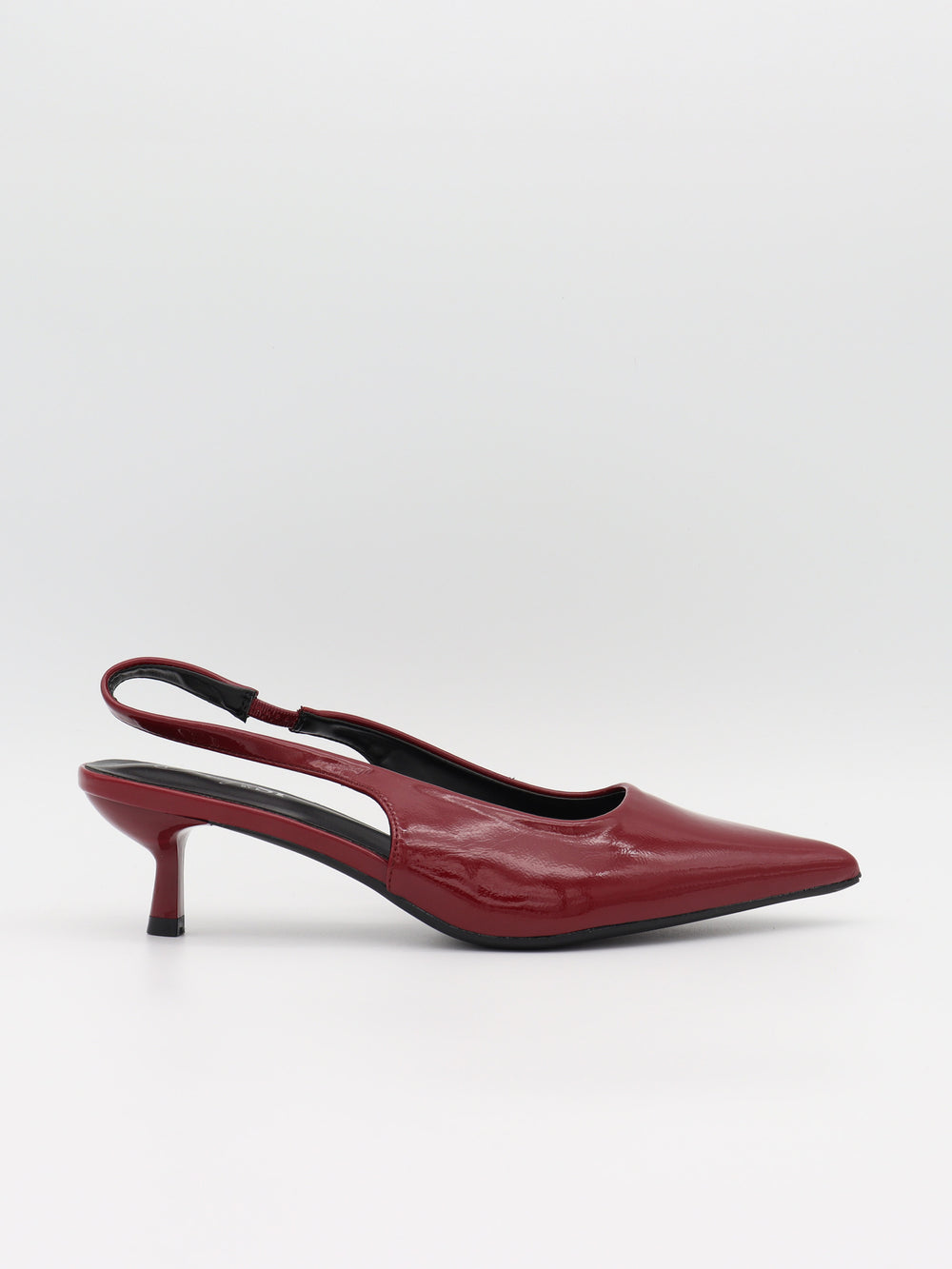 Disse elegante slingbacks kombinerer sofistikeret minimalisme med et moderne, poleret udtryk. Den blanke overflade giver skoene et luksuriøst look, mens den spidse snude skaber en skarp og feminin silhuet. Den slanke hæl tilfører elegance uden at gå på kompromis med komforten, og den åbne slingback-rem sikrer et let og luftigt fit. Perfekte til alt fra kontor- og aftenlooks til særlige anledninger, hvor du ønsker et enkelt men eksklusivt design.