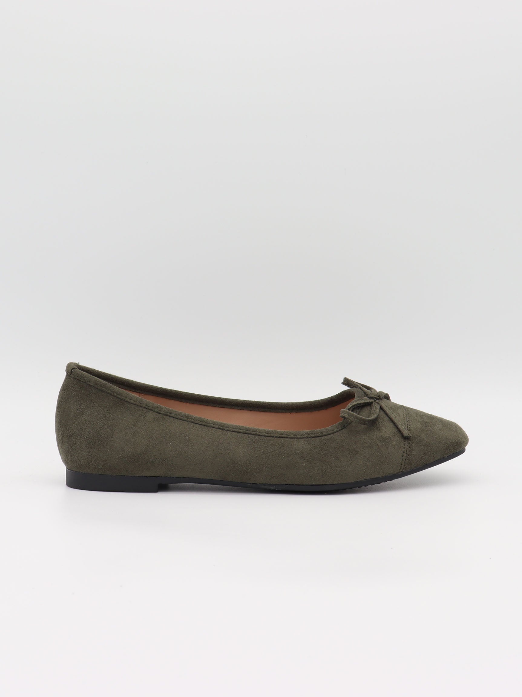 Disse fine ballerinaer har et klassisk og feminint design med et blødt ruskindsmateriale i en dæmpet olivengrøn nuance. Den spidse snude og den lille dekorative sløjfe foran giver skoen et elegant og let udtryk, som gør den nem at style til både hverdag og pænere lejligheder. Den flade sål sikrer komfort hele dagen, mens det enkle design gør skoen til et alsidigt valg i garderoben.