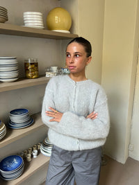 Denne cardigan er lavet i det blødeste materiale og kan enten bruges som hoveddel af et outfit, eller over dit outfit som et ekstra lag! Cardigan har de fineste knapper og har en afslappet pasform. Den har en rund krave og voluminøse ærmer.