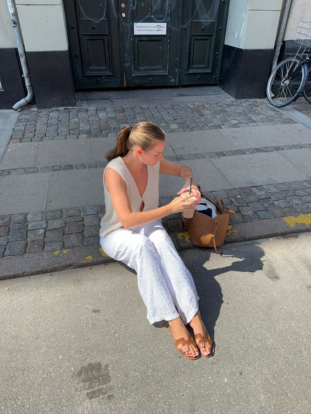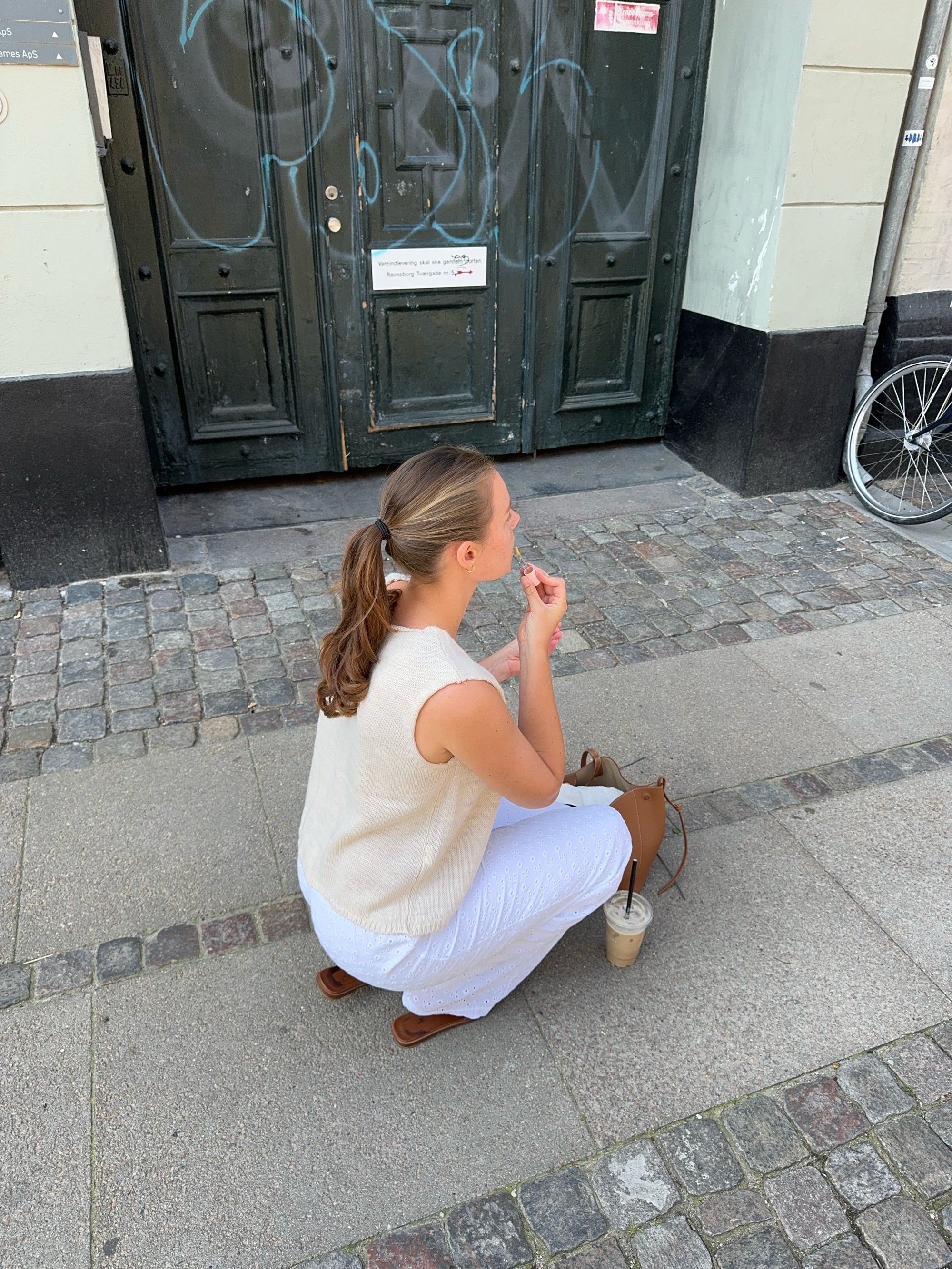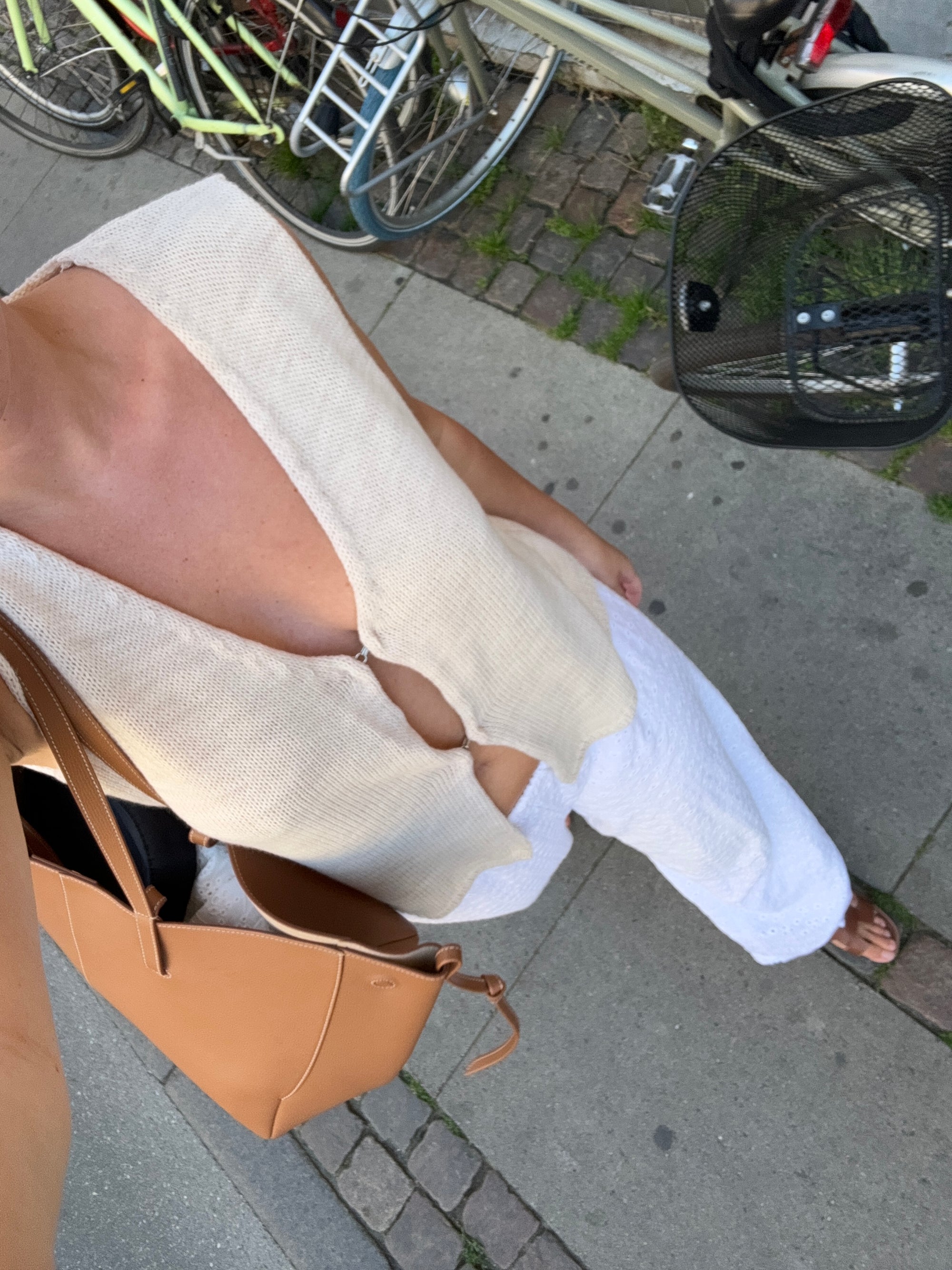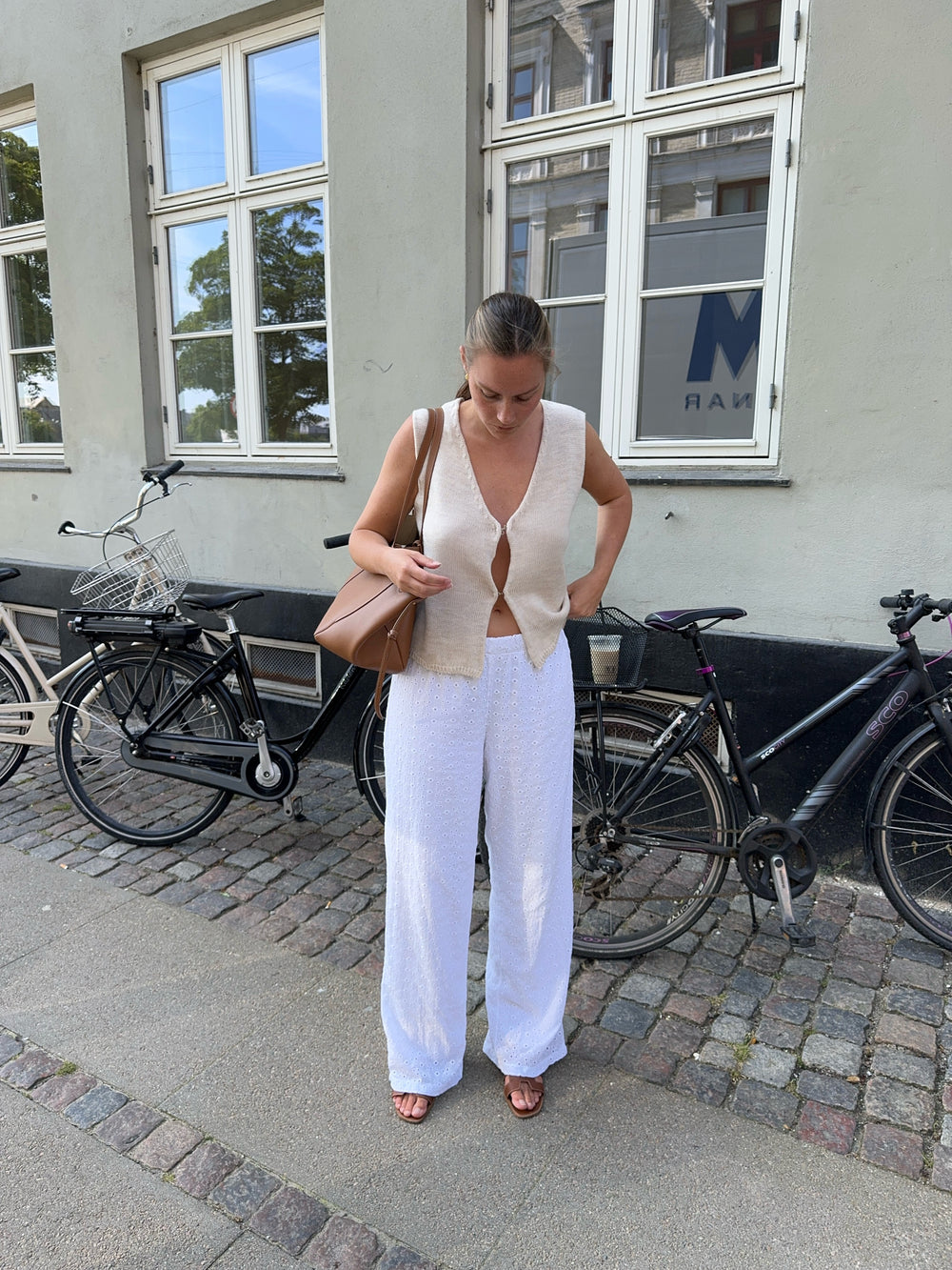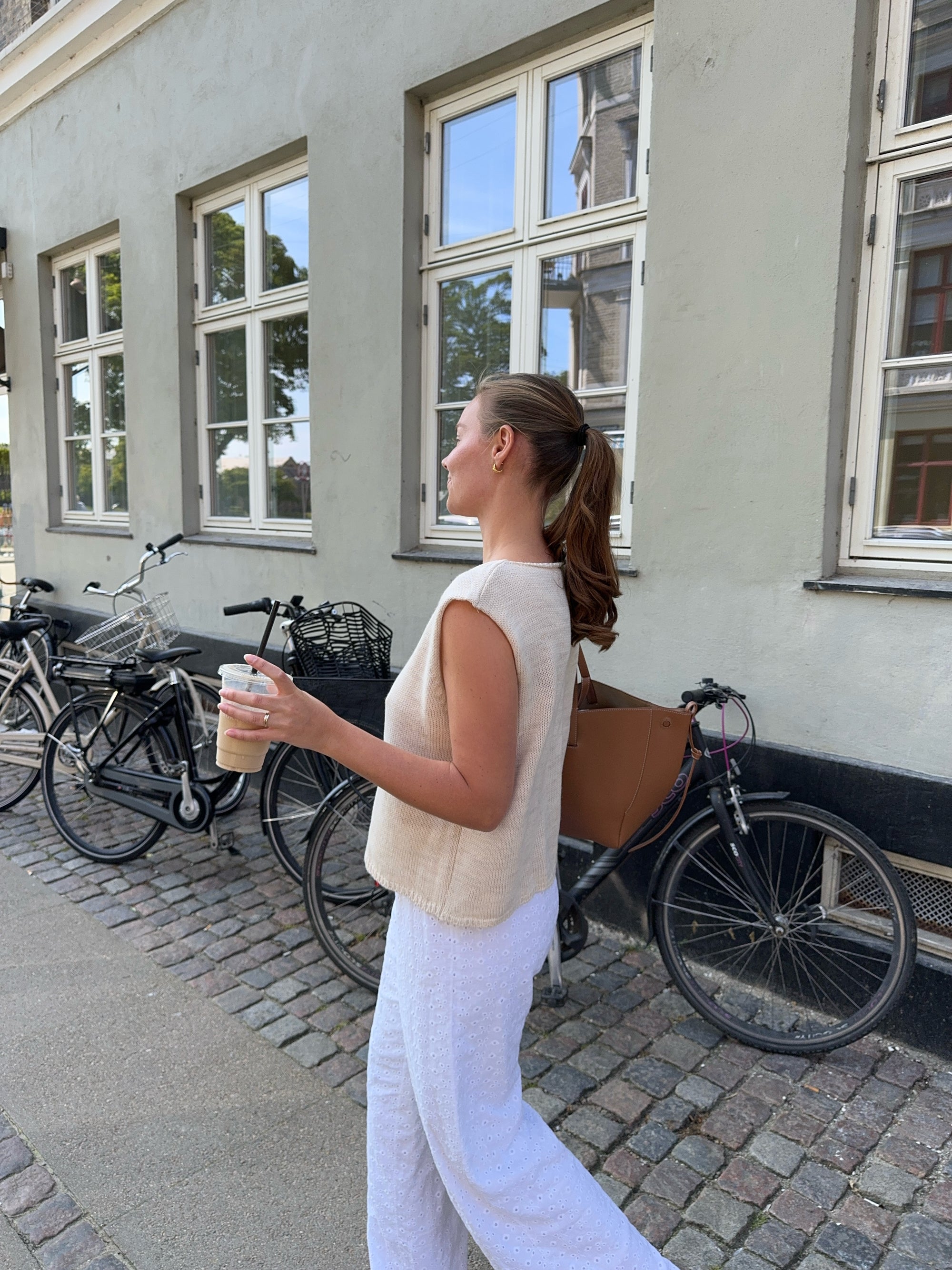 Denne beige strikvest har en løs pasform, der både er komfortabel og stilfuld. Den dybe V-udskæring og de to hægtelukninger tilføjer et elegant touch. Vesten kan bæres alene eller styles med andre stykker for et mere lagdelt look.