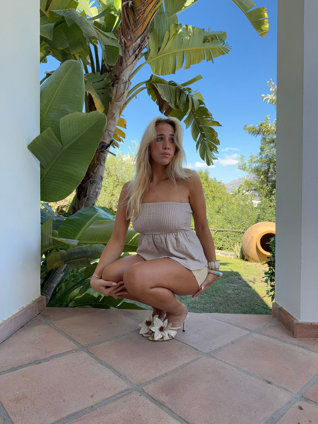 Denne stropløse top i en blød, struktureret kvalitet forener legende volumen med enkel elegance. Den tætsiddende smock-overdel giver en flatterende pasform og god komfort, mens det lagdelte skørt forneden tilføjer bevægelse og feminint spil til looket. Den neutrale nuance gør den nem at style til både hverdag og fest – hvad enten det er med jeans, en elegant nederdel eller shorts. En alsidig top, der balancerer casual charme med et raffineret udtryk. Perfekt til solrige dage eller som kontrast til en skarp blazer.