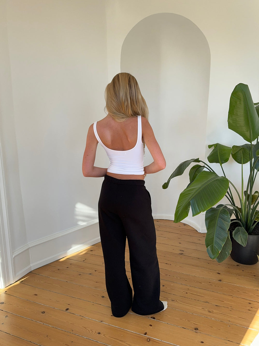 Denne enkle og stilrene tanktop i hvid er et musthave i garderoben. Med sin tætsiddende pasform, dybe udskæring og bløde materiale er den både behagelig og alsidig. Perfekt til at styles alene eller som et lag under en blazer eller skjorte.