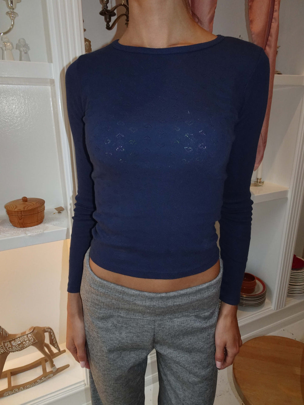 En feminin og tidløs langærmet top i en smuk navy nuance. Designet har en klassisk rund hals og fine broderede hjerter, der tilfører et subtilt, romantisk touch. Den tætsiddende pasform gør den perfekt til både hverdagsbrug og layering. Style den med jeans for et afslappet look eller under en blazer for et mere sofistikeret udtryk.