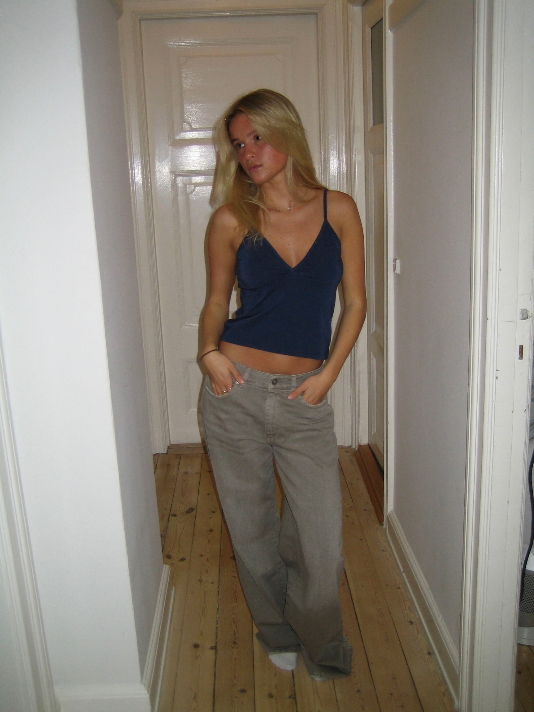 Denne blå tank top med spaghettistropper har en tætsiddende pasform, der smukt fremhæver din figur. Den har en elegant v-udskæring, der tilføjer et feminint og moderne touch. Fremstillet i blødt materiale, giver den både komfort og bevægelighed, uanset om du bruger den til en træning eller som en stilfuld basisdel i din hverdag.