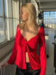 Langærmet bluse der bindes foran, og har v-udskæring. Vores Maddy bluse i blonde materiale er gennemsigtig, men vi har tilføjet et ekstra lag omkring brystet, så den kan bæres uden bh. Bemærk dog man forsat kan fornemme ens bryst en smule uden bh.