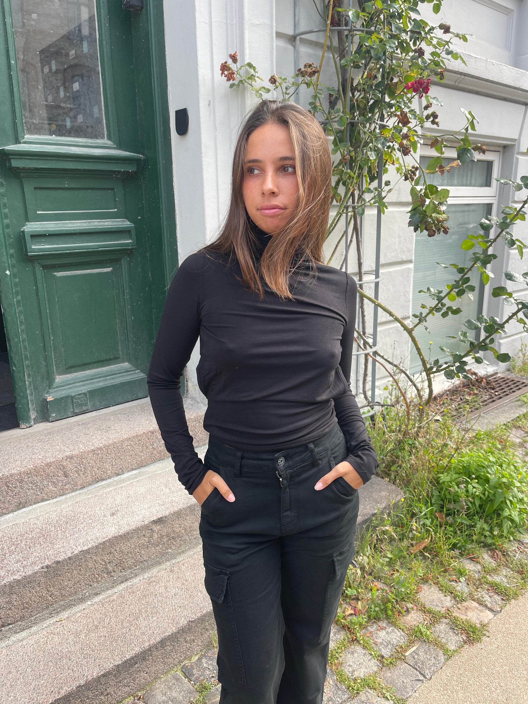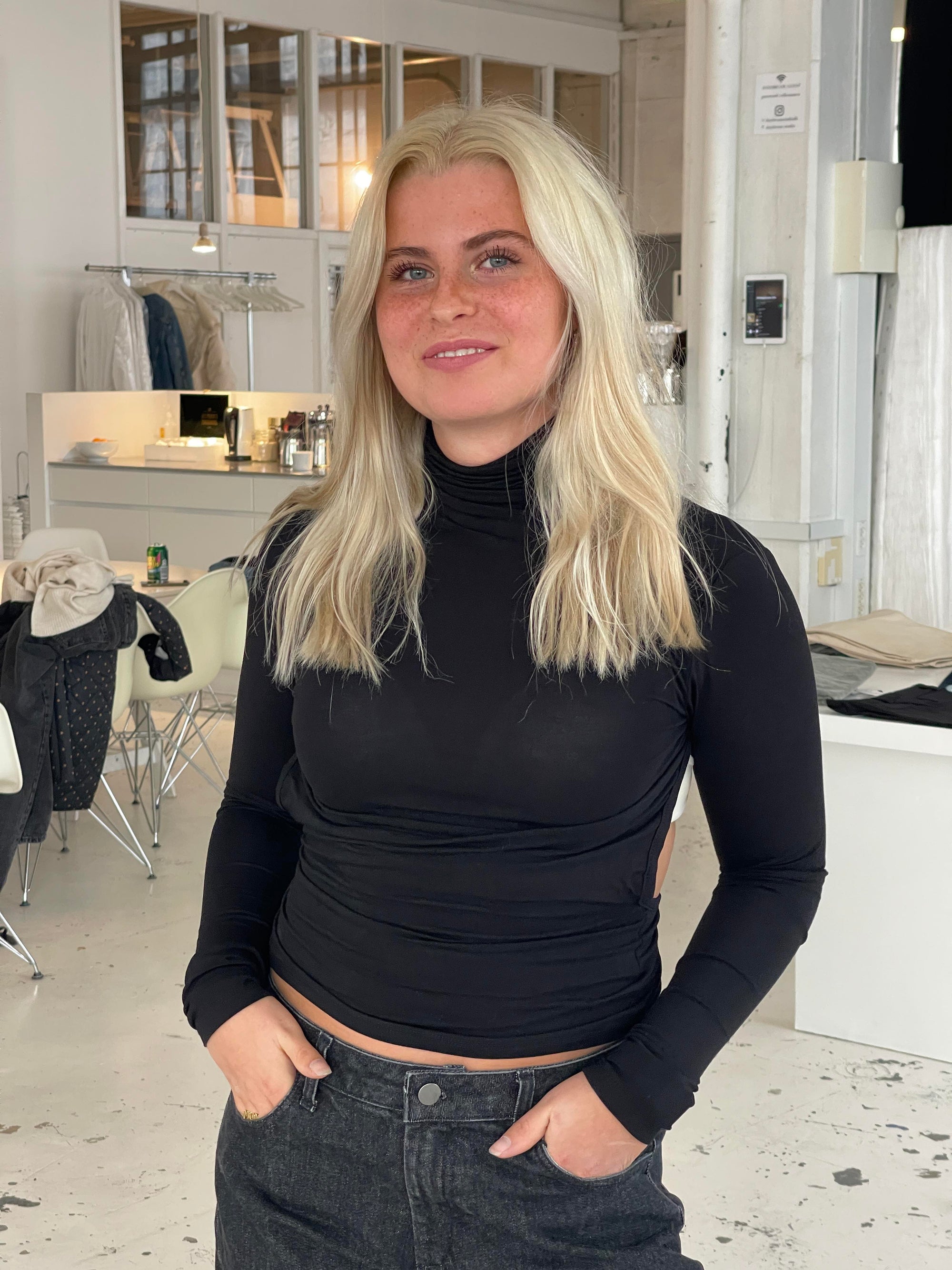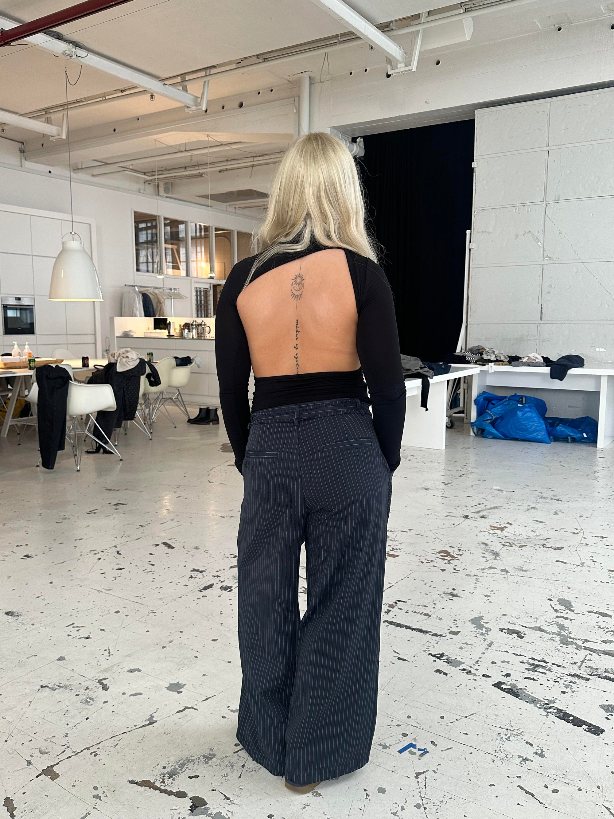 Denne bluse er designet med en høj hals og har lange ærmer. Blusen har den smukkeste åbne ryg, som er med til at gøre blusen unik.