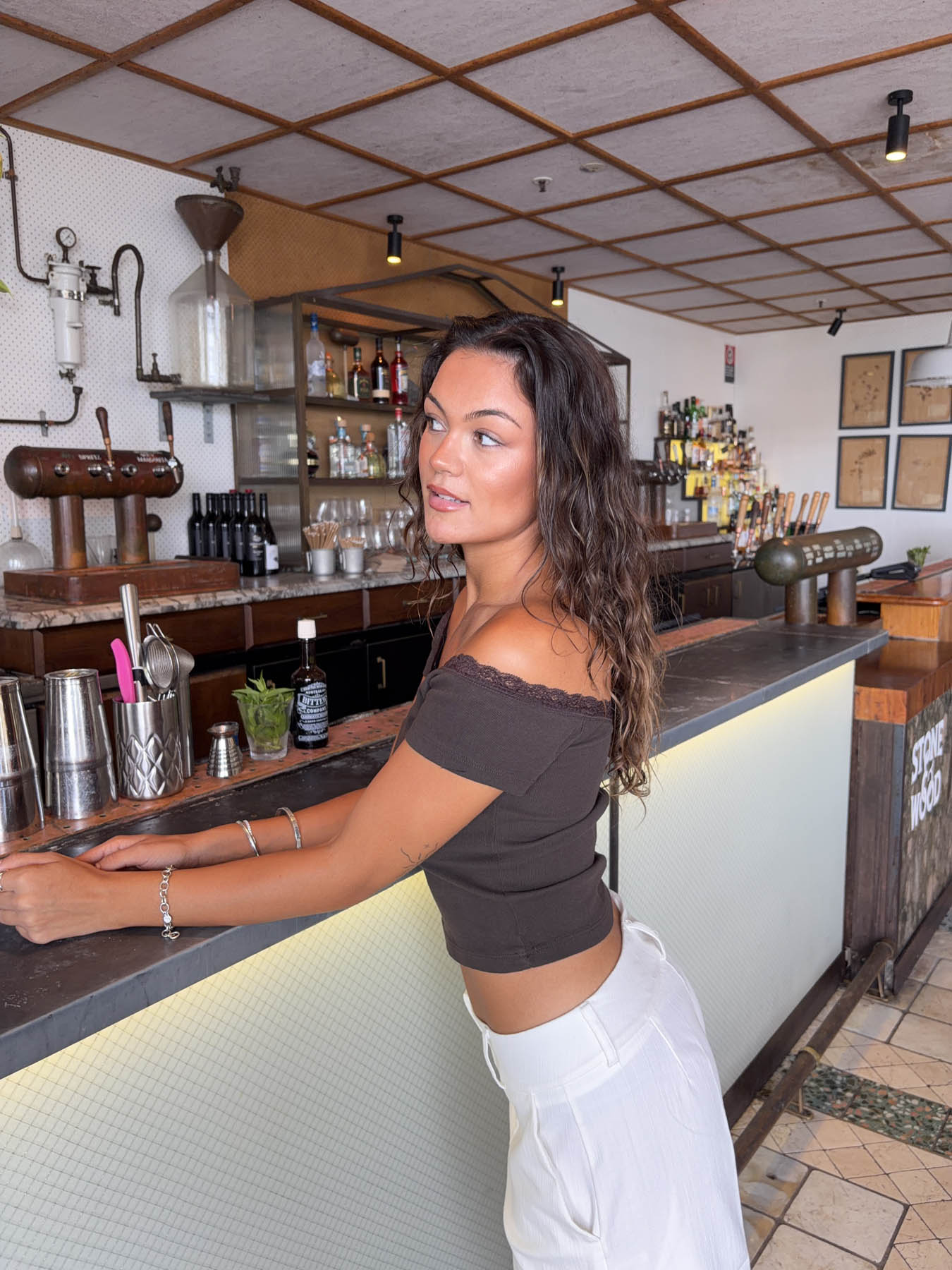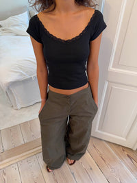 Opgrader din garderobe med denne smukke tætsiddende t-shirt, der kombinerer elegance og komfort. Den v-formede udskæring er smukt indrammet med fin blonde, hvilket tilføjer et feminint touch til den klassiske rib-design. Perfekt til både afslappede og mere formelle anledninger, hvor du ønsker at udstråle stil.