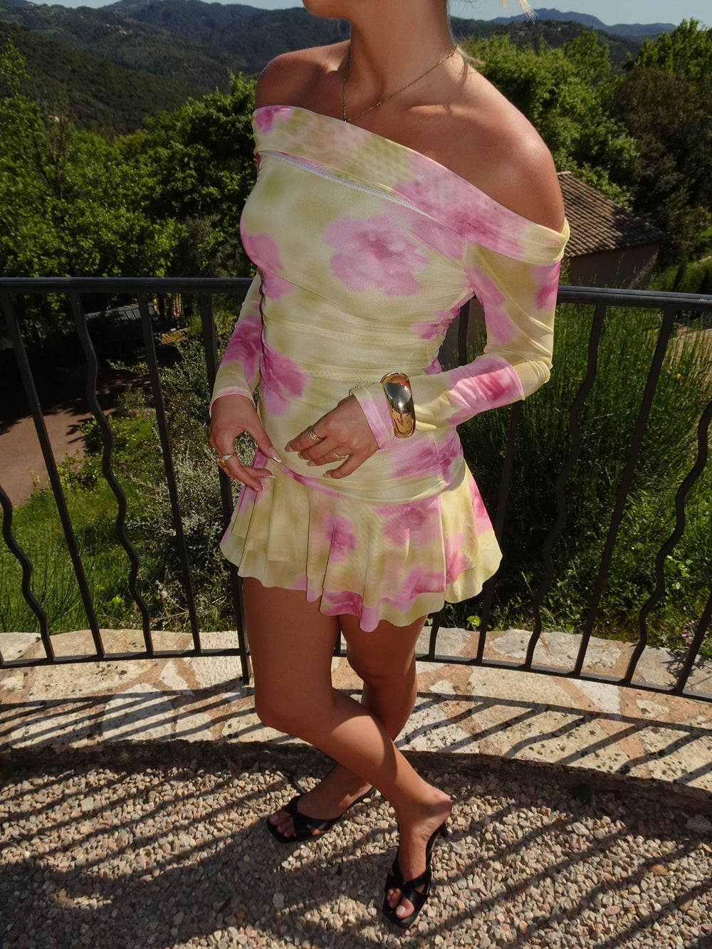 En romantisk og feminin kort kjole med et smukt blomsterprint. Designet har en elegant off-shoulder detalje, der fremhæver skuldrene, samt lange ærmer, der tilføjer et sofistikeret touch. Den flatterende pasform gør den perfekt til både hverdagsbrug og særlige anledninger. Style den med sandaler for et sommerligt look eller dress den op med et par hæle til en aften ude.
