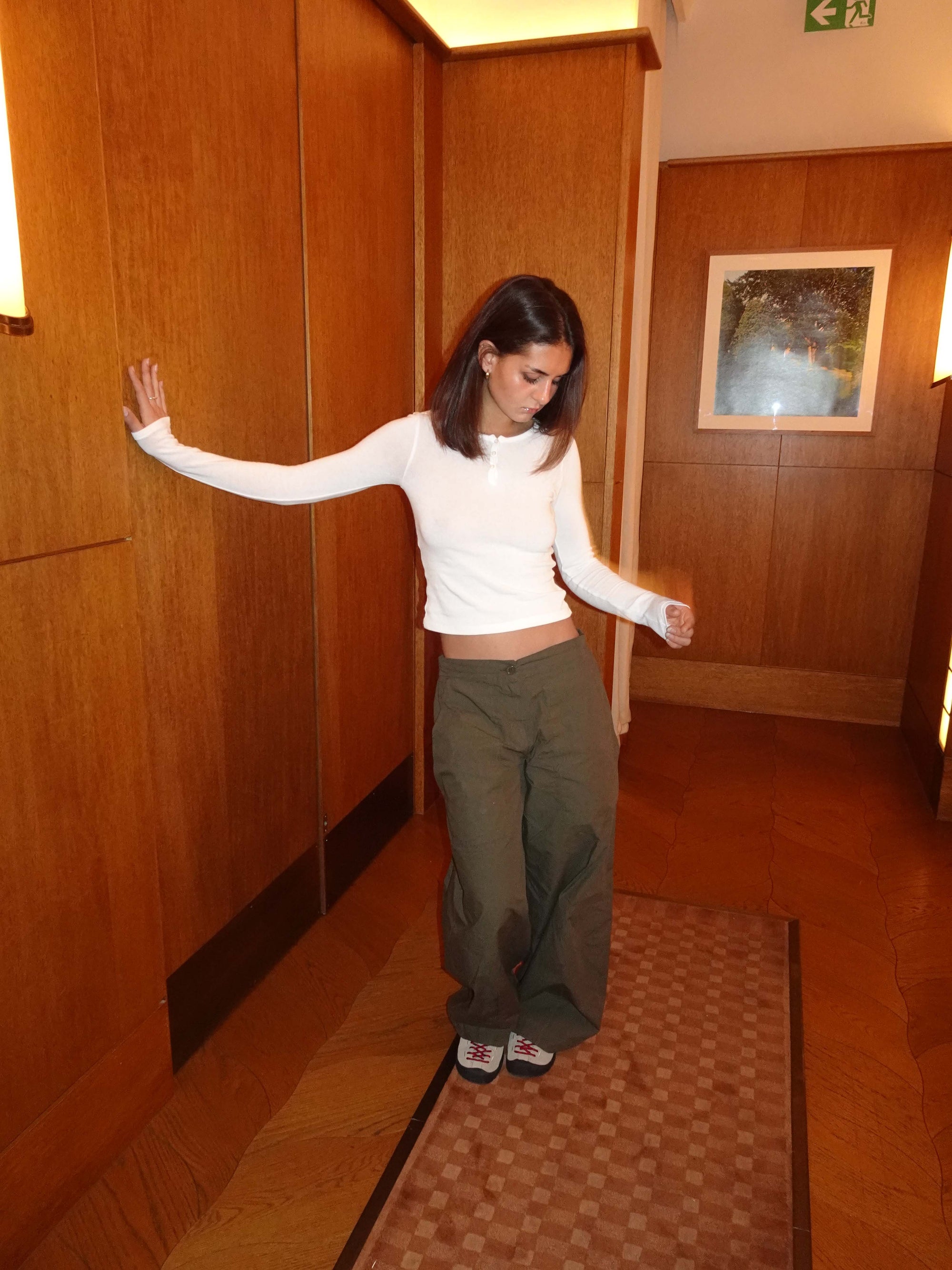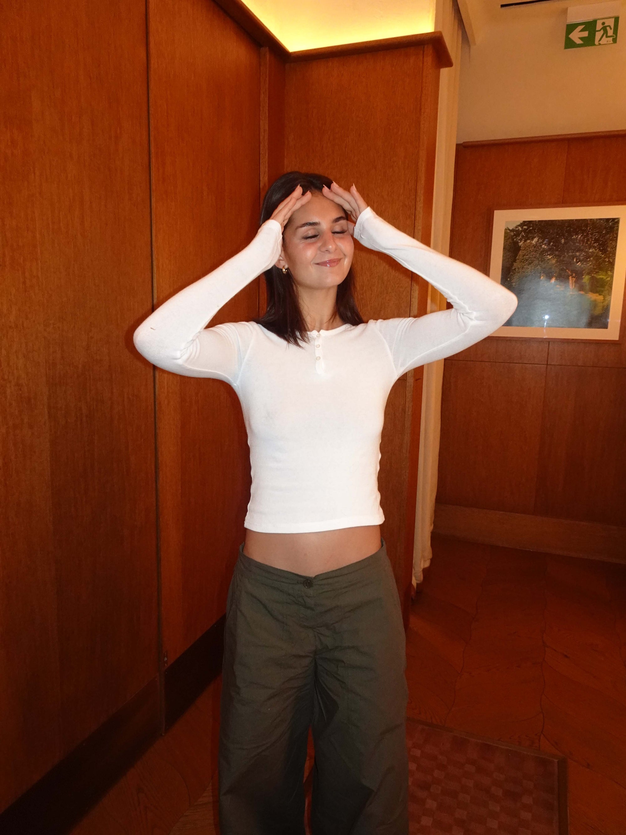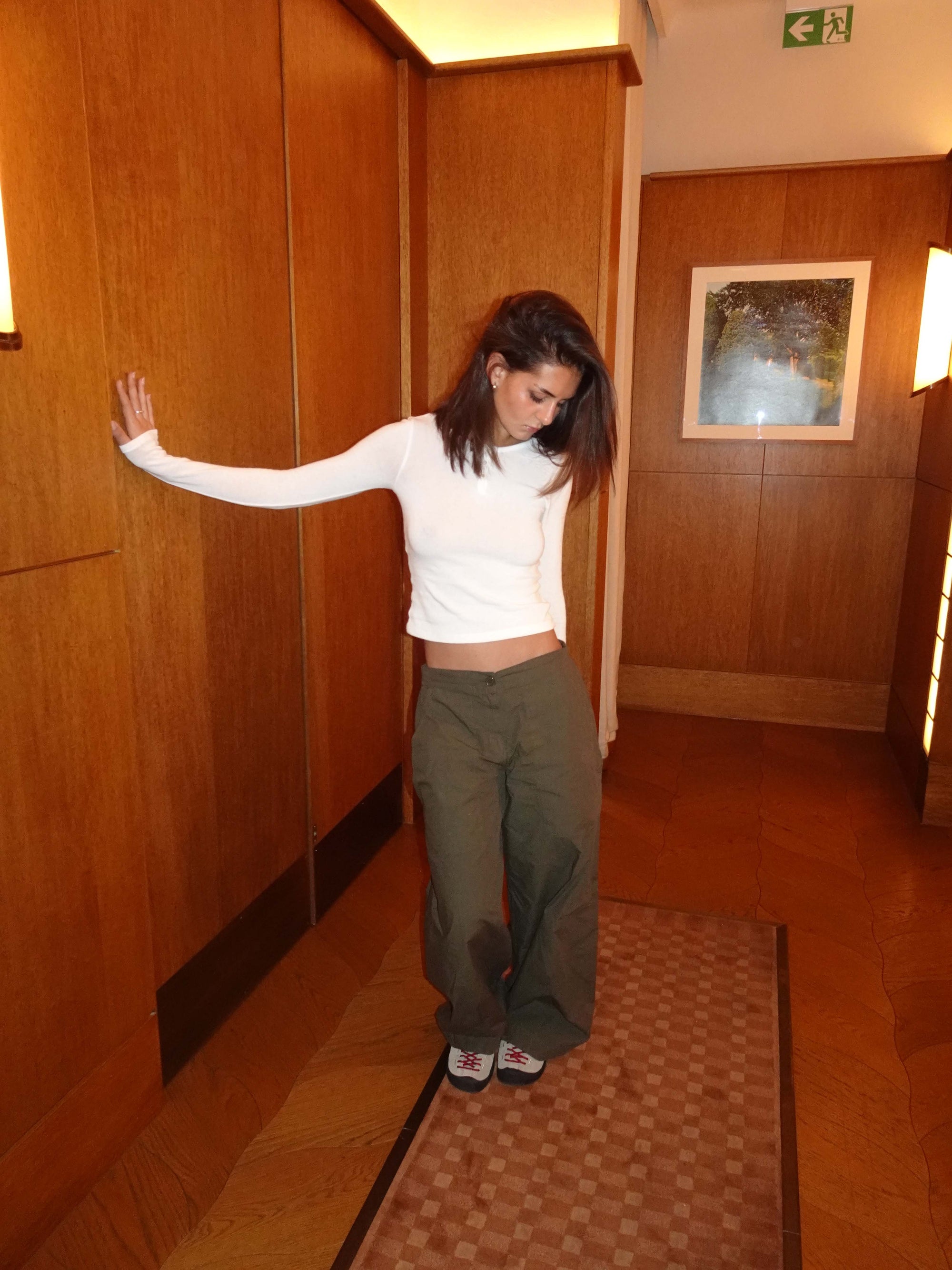 Denne hvide langærmede top er den perfekte basic til enhver garderobe. Den er lavet i et superblødt, strækbart materiale, der føles behageligt mod huden og giver en flot, tætsiddende pasform. Den lille knaplukning i halsudskæringen giver et diskret og feminint touch, der gør toppen både enkel og interessant.