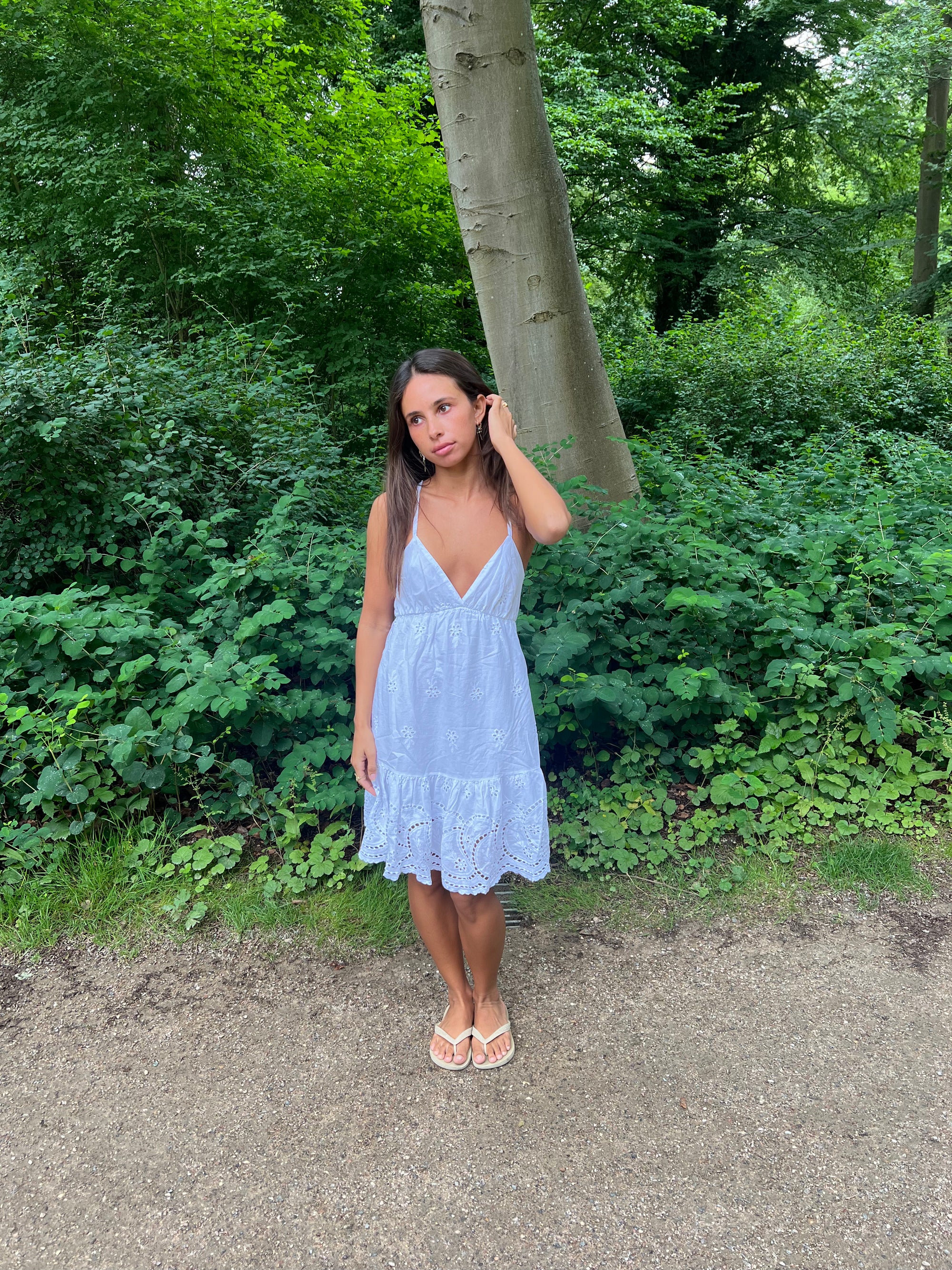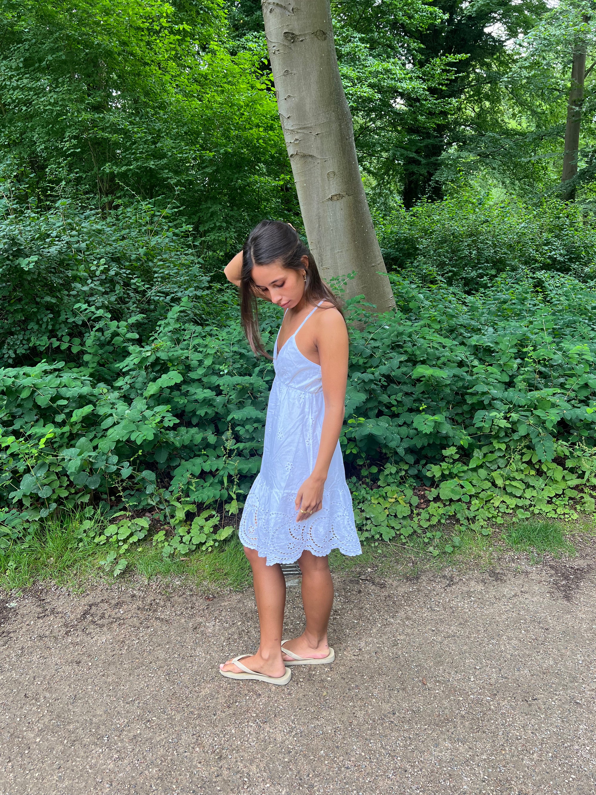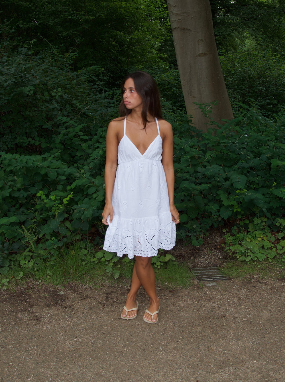 Den fineste broderi kjole i hvid med kort længde. Kjolen har en smuk ryg og tynde stropper. Den har en v-udskæring og fine broderidetaljer i bunden.