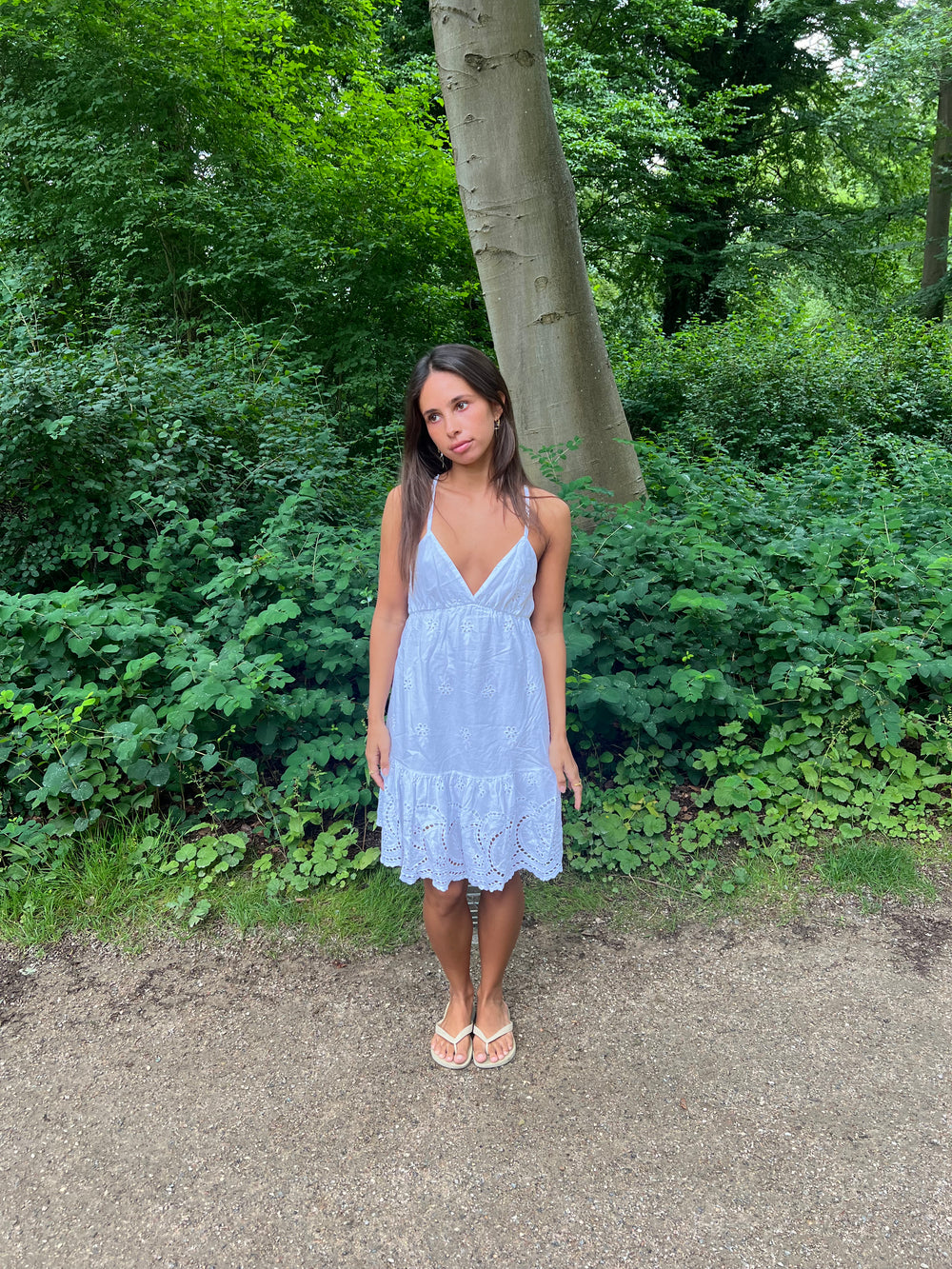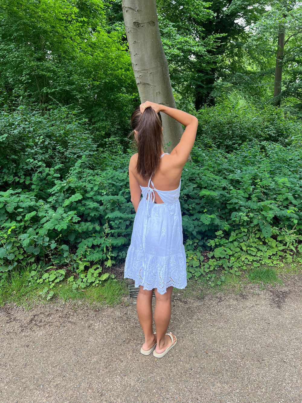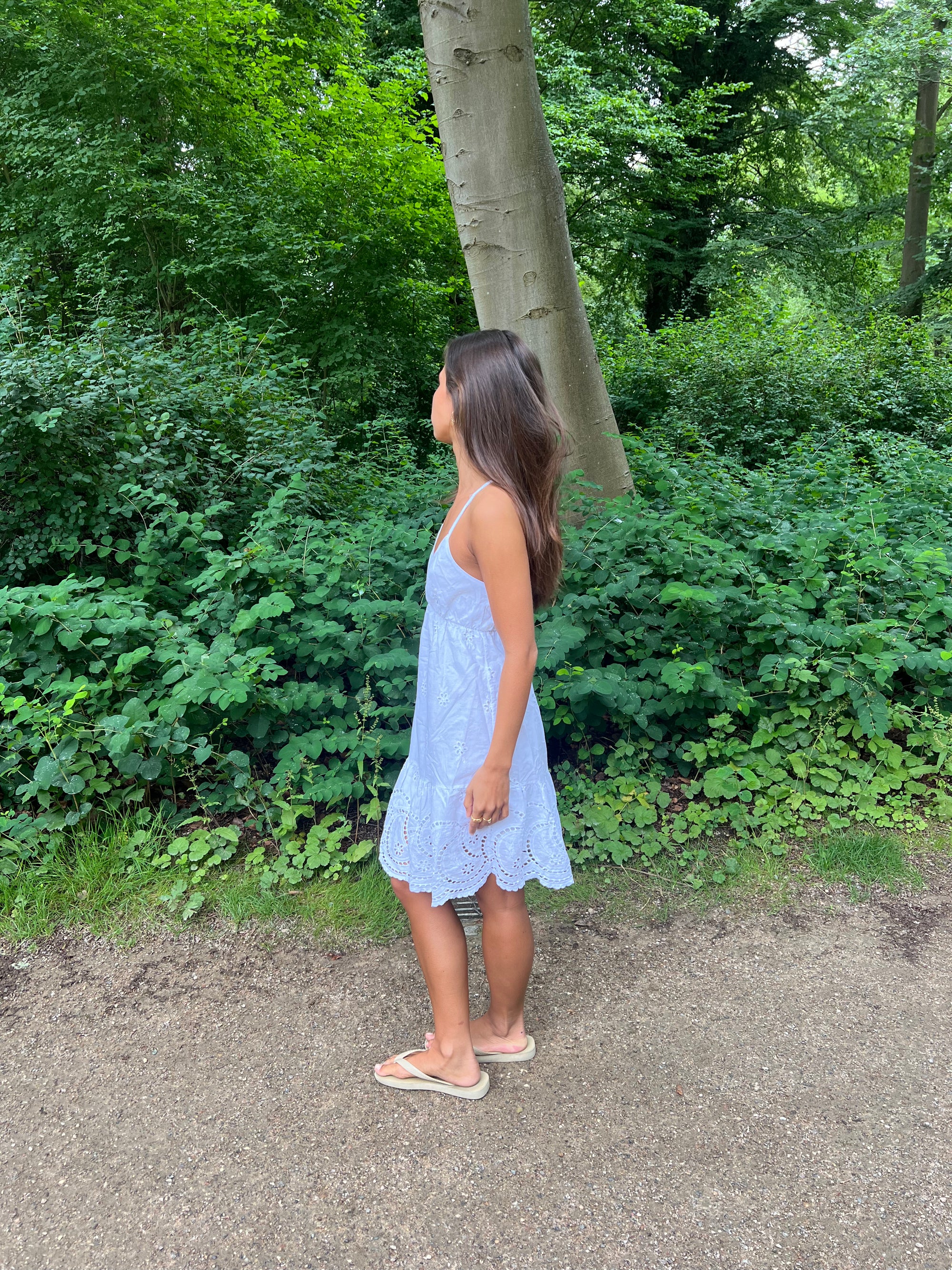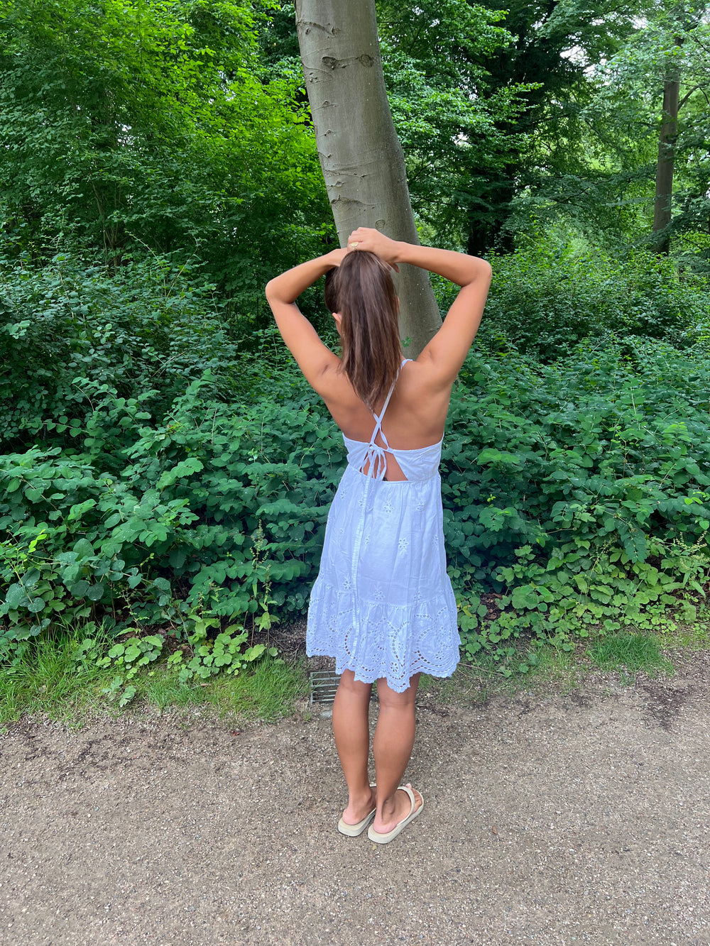 Den fineste broderi kjole i hvid med kort længde. Kjolen har en smuk ryg og tynde stropper. Den har en v-udskæring og fine broderidetaljer i bunden.