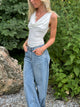 Denne top er helt perfekt til festlige begivenheder! Denne top har en vandfaldsudskæring ved brystet og en dyb ryg med bindedetalje.