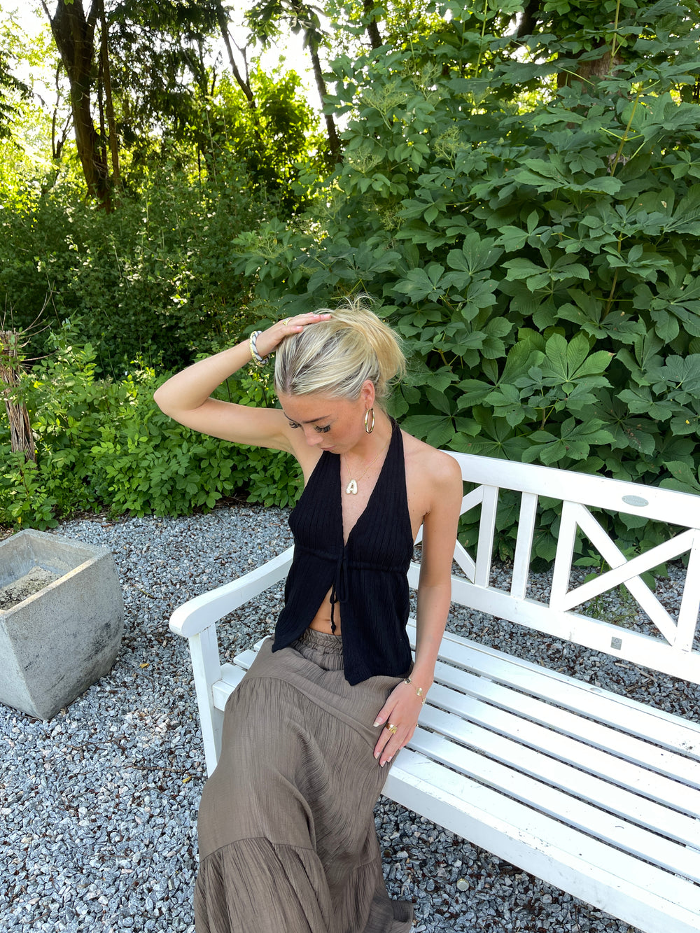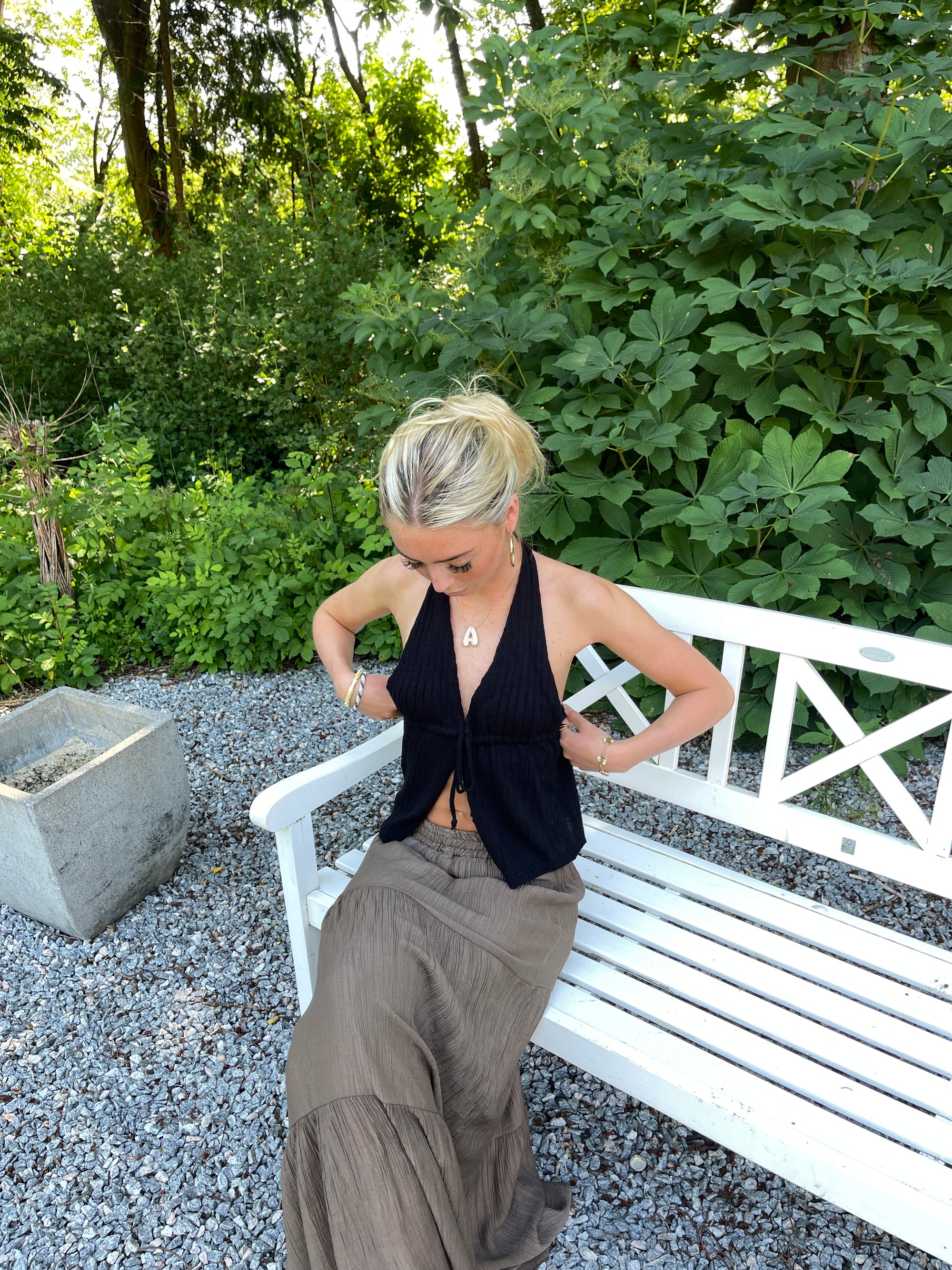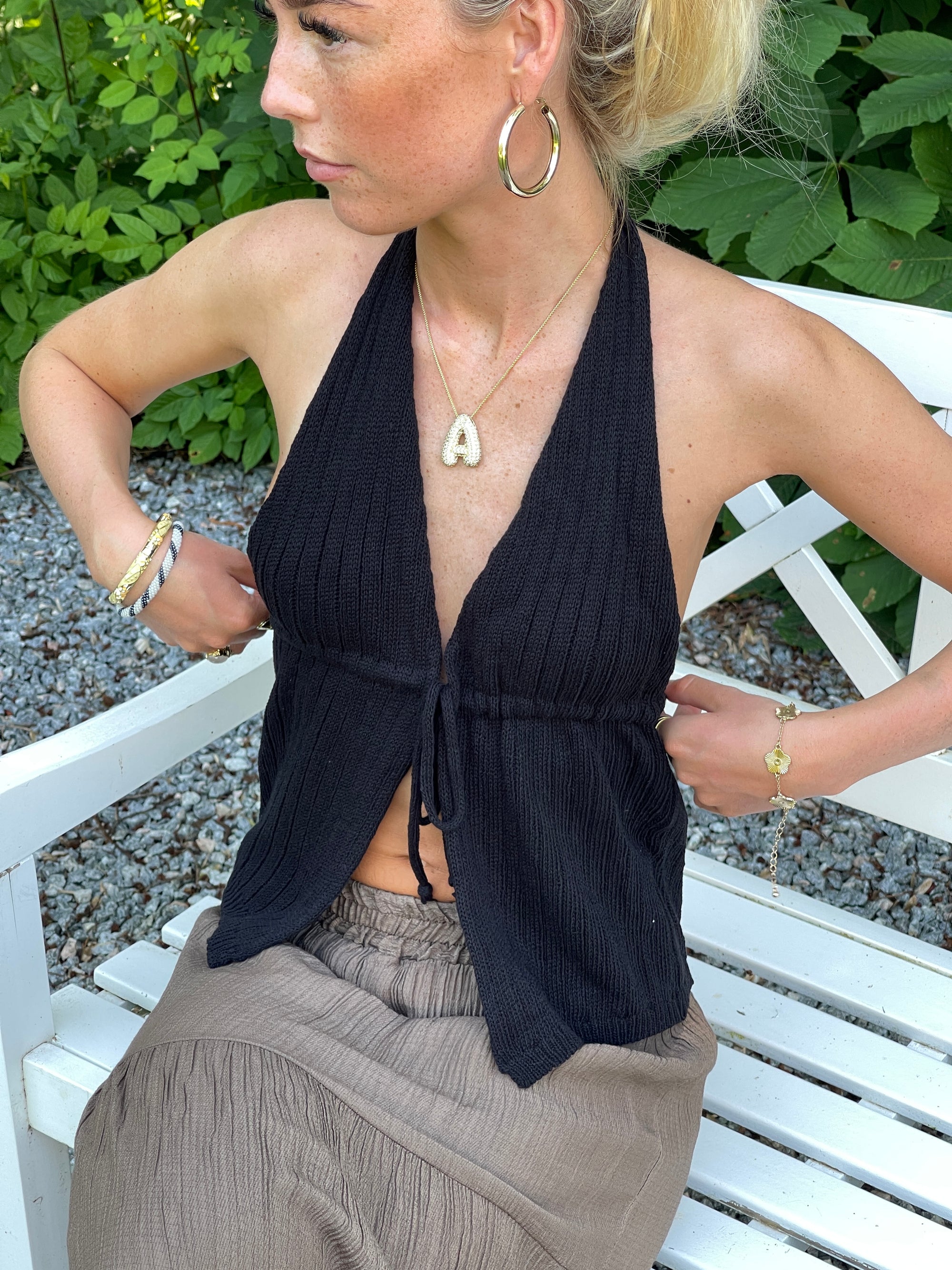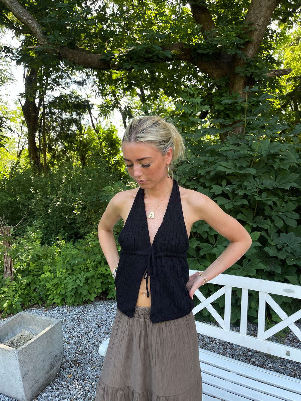 Vores sorte Sibba top i rib og 100% bomuld giver det perfekte sommerlook! Toppen har en fin bindedetalje ved brystet, som gør den justerbar. Den har en v-udskæring med stropper rundt om nakken. Toppen fås kun i onesize.