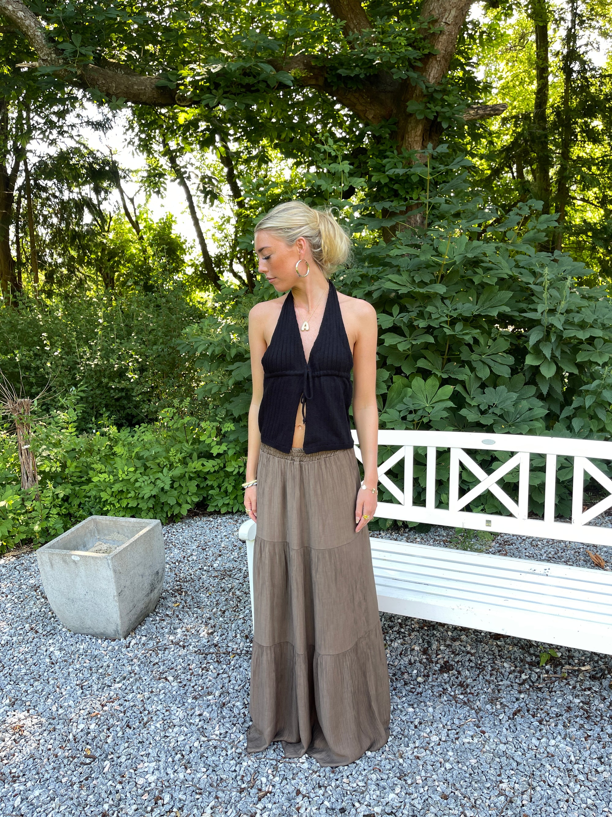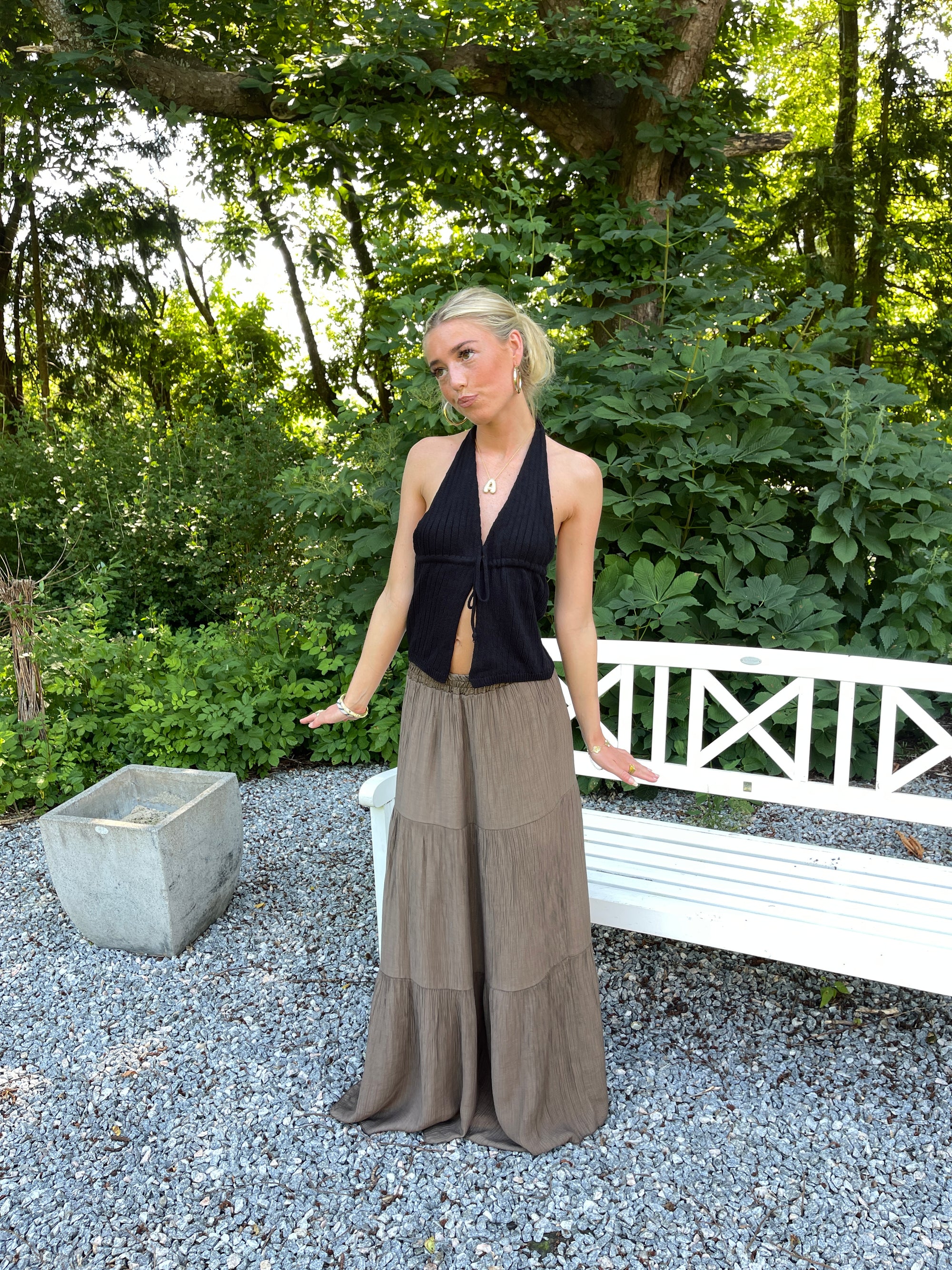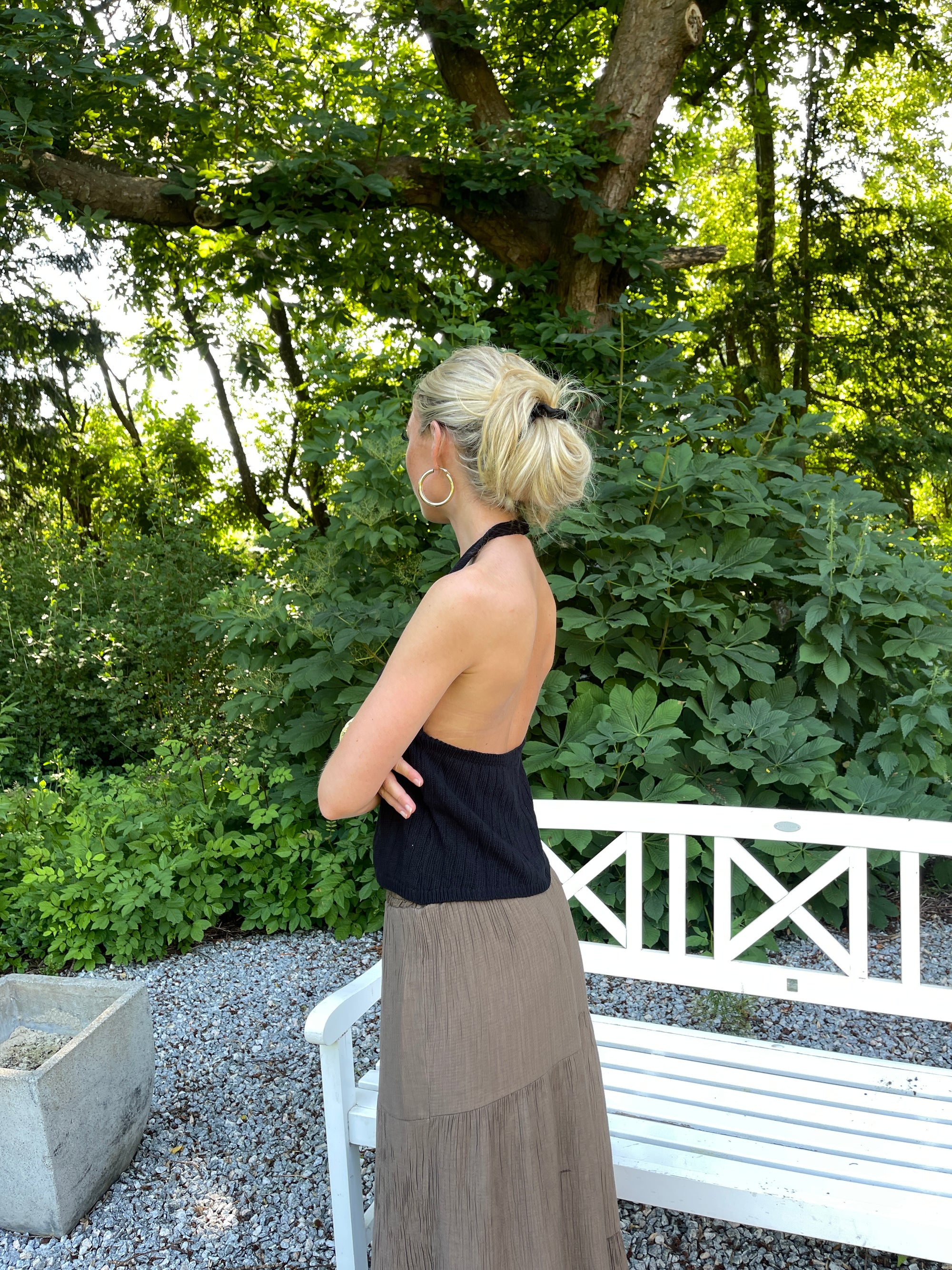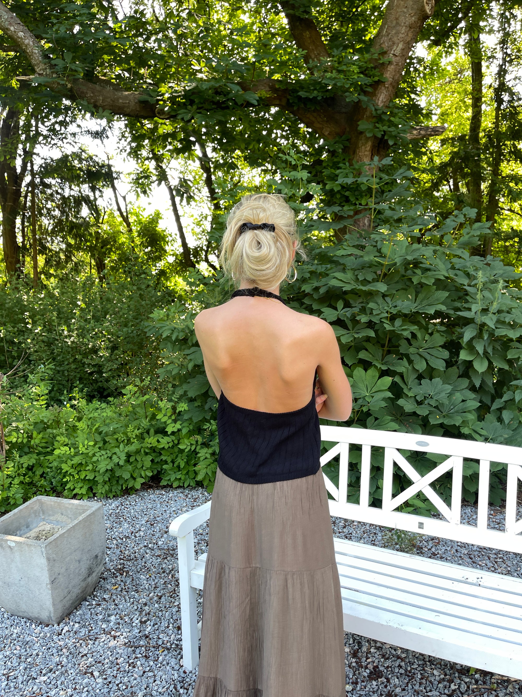 Vores sorte Sibba top i rib og 100% bomuld giver det perfekte sommerlook! Toppen har en fin bindedetalje ved brystet, som gør den justerbar. Den har en v-udskæring med stropper rundt om nakken. Toppen fås kun i onesize.