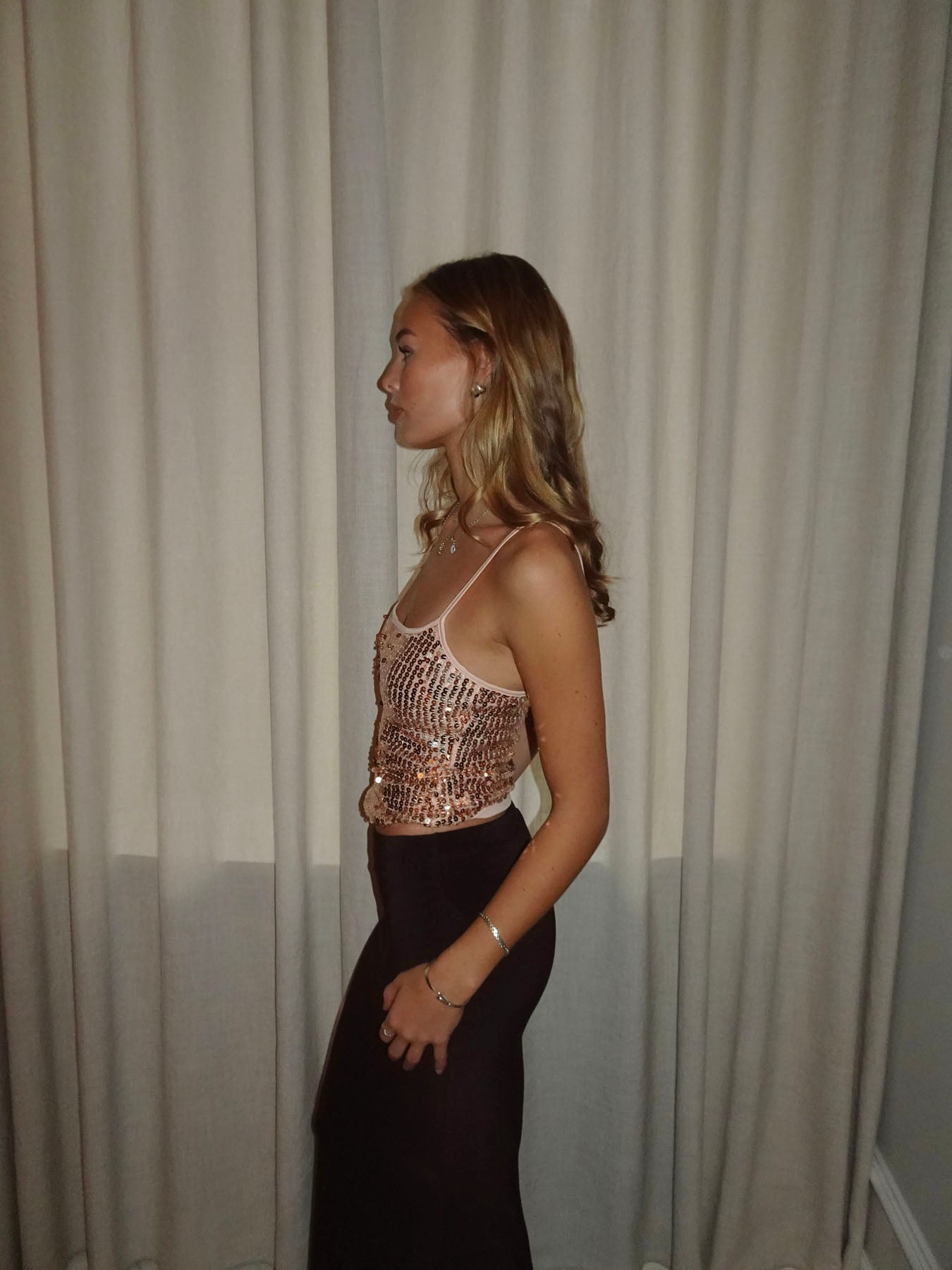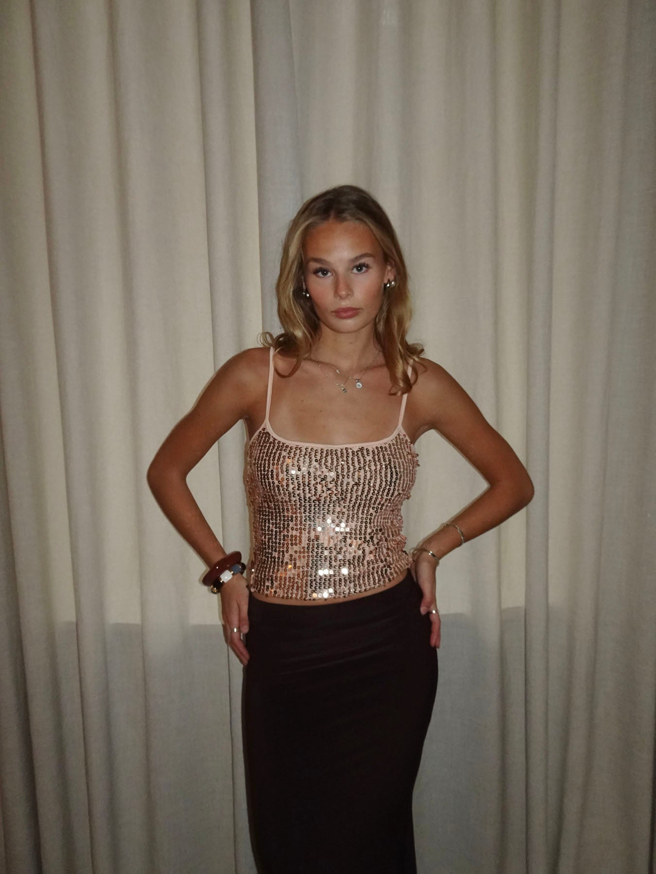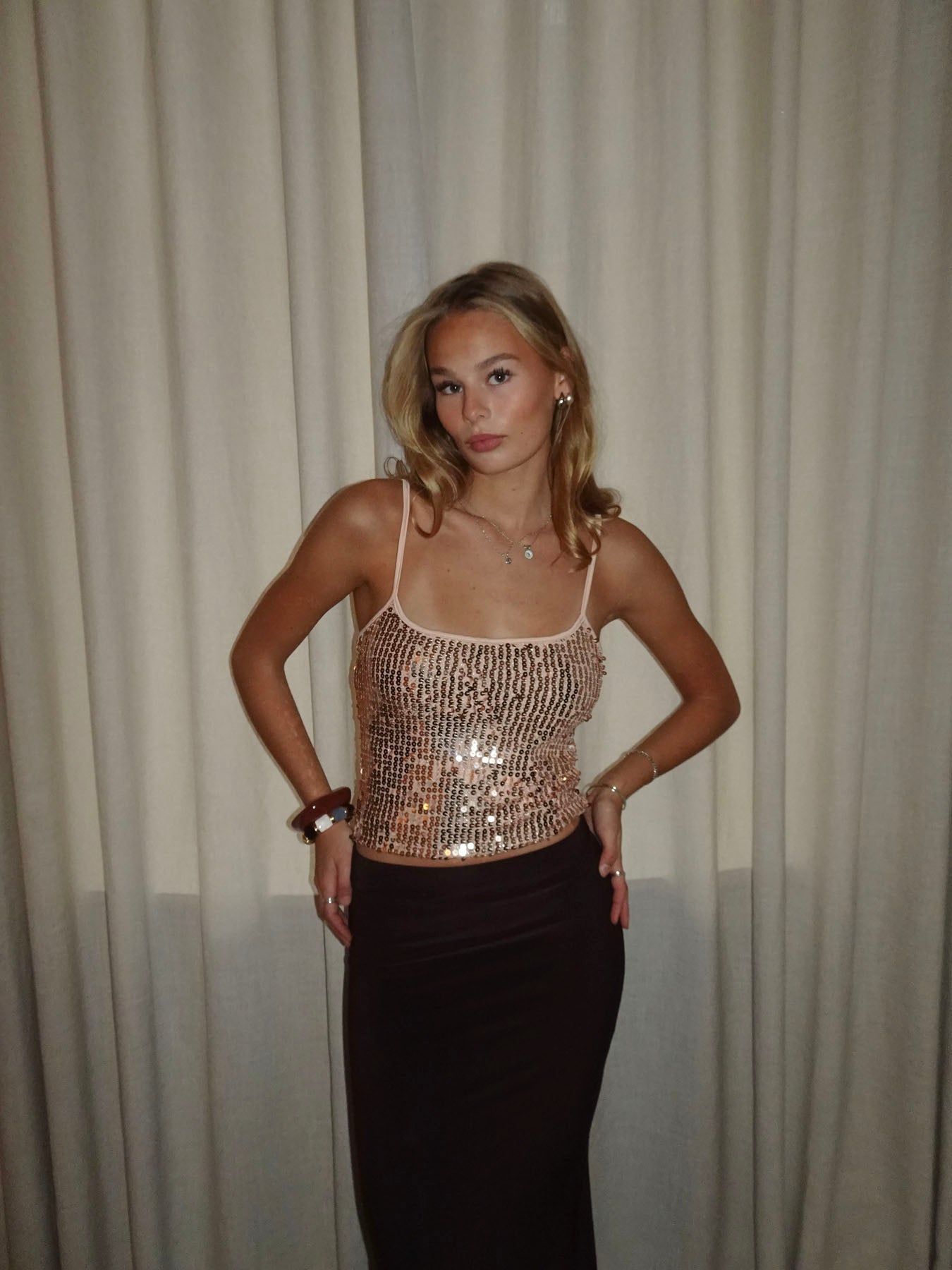 Denne smukke palliettop er dækket af glitrende guld- og nude-farvede pailletter, der fanger lyset på den helt rigtige måde. Det stretchy materiale og de justerbare stropper gør toppen behagelig at have på, samtidig med at den giver et glamourøst og eksklusivt udtryk.