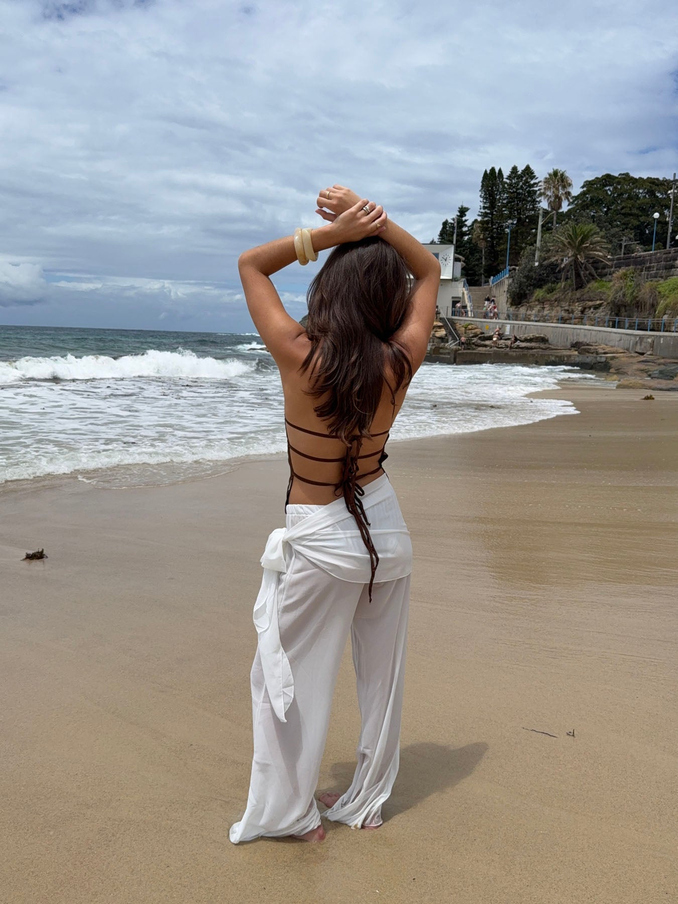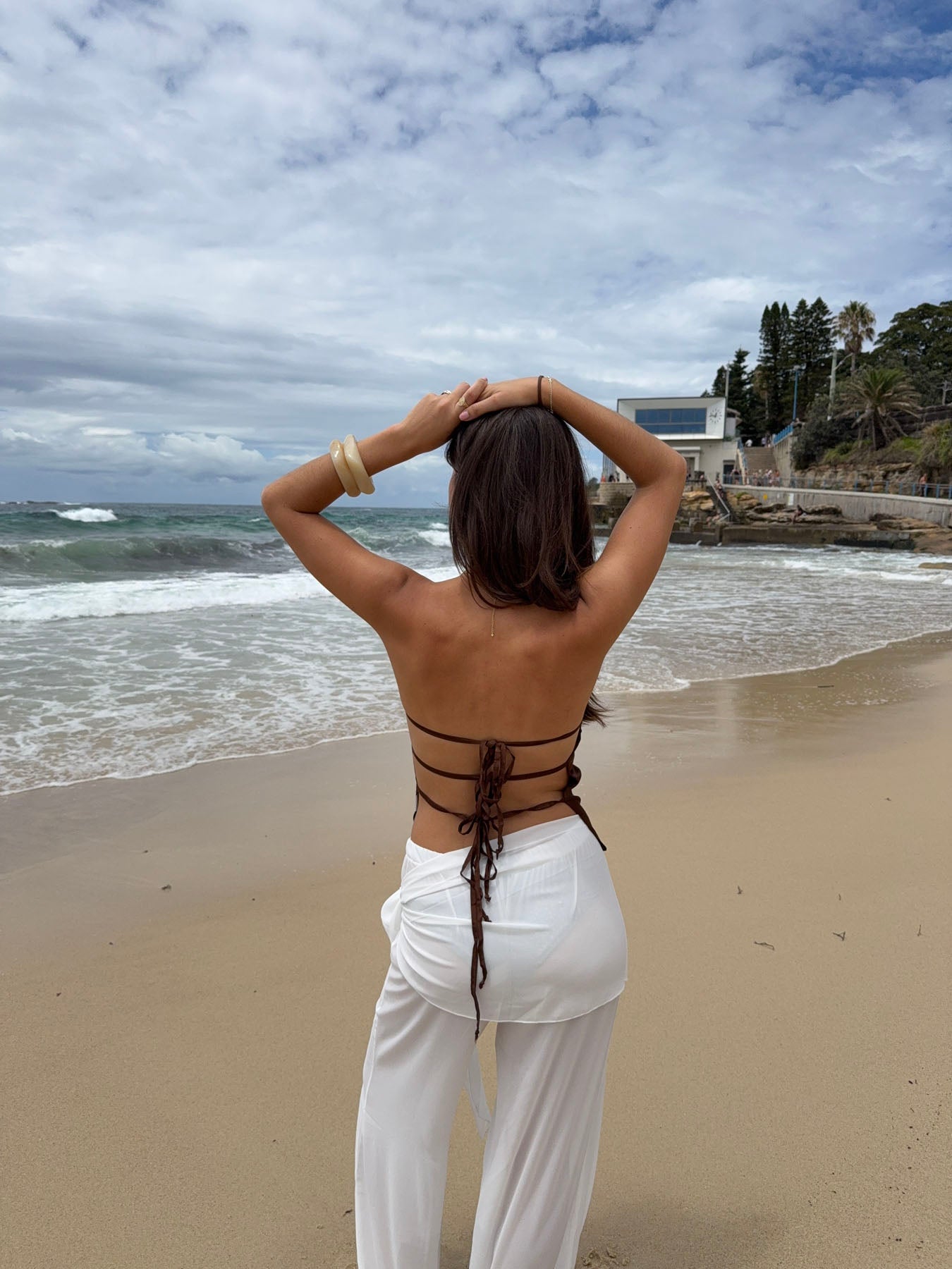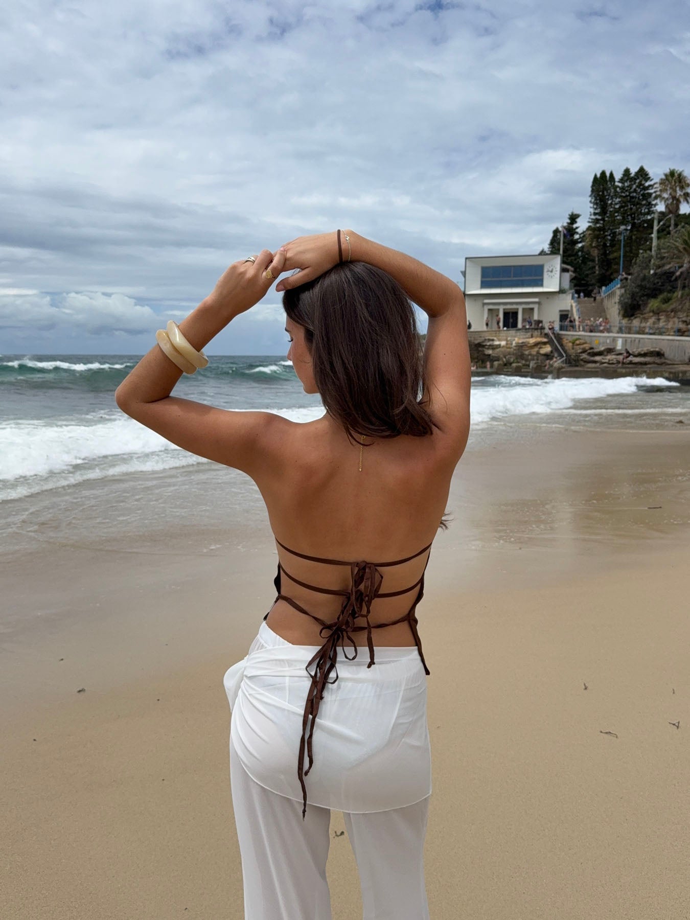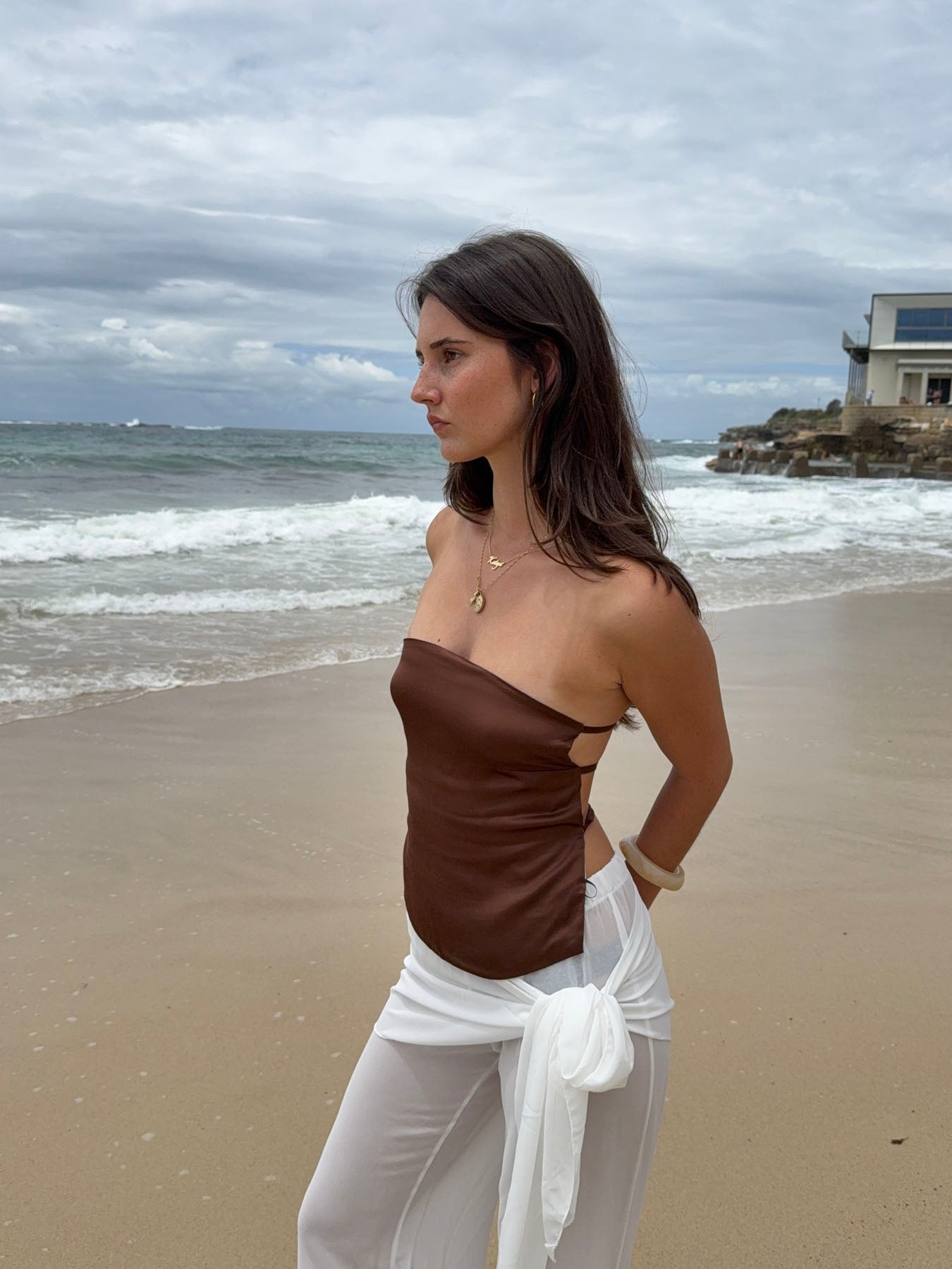 Denne elegante satin-top har en åben ryg med fine bindebånd, der giver et feminint og justerbart fit. Det glansfulde satinmateriale tilføjer et luksuriøst touch, mens den lette og luftige pasform gør den perfekt til både hverdagsbrug og festlige anledninger.