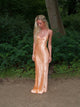 Lang hvid kjole i satin med tynde stropper. Kjolen har de fineste detaljer såsom et hul ved brystet, som er med til at give et unikt og klassisk look.