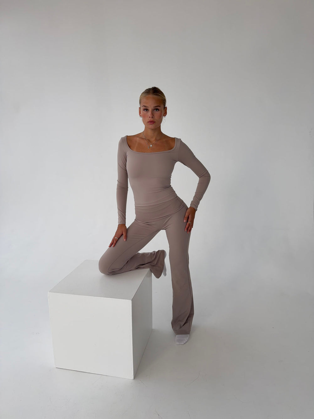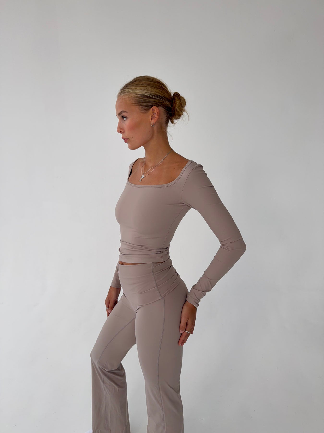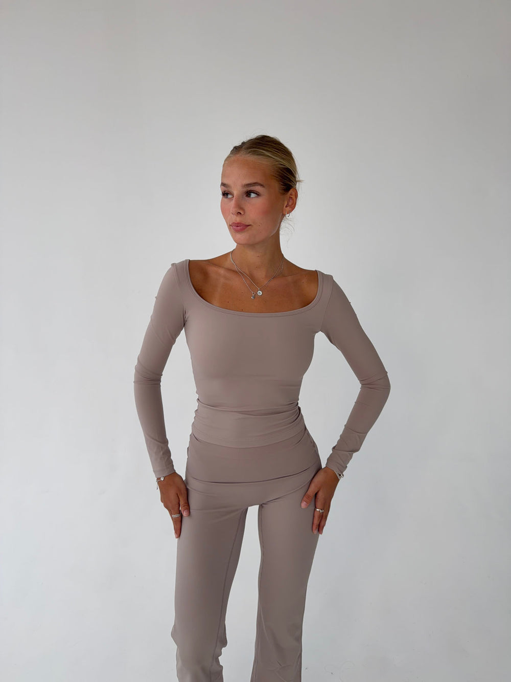 Denne træningsbluse i taupegrå kombinerer funktionalitet med et stilrent, feminint design. Det bløde, åndbare materiale giver maksimal bevægelsesfrihed og komfort under træning, mens den tætsiddende pasform og runde firkantede udskæring skaber et moderne og flatterende look. De lange ærmer og det enkle snit gør blusen ideel til både yoga, løb eller hverdagsbrug, hvor du ønsker et sporty, men elegant udtryk. Et perfekt valg til dig, der vil føle dig både komfortabel og velklædt – uanset aktivitet.
