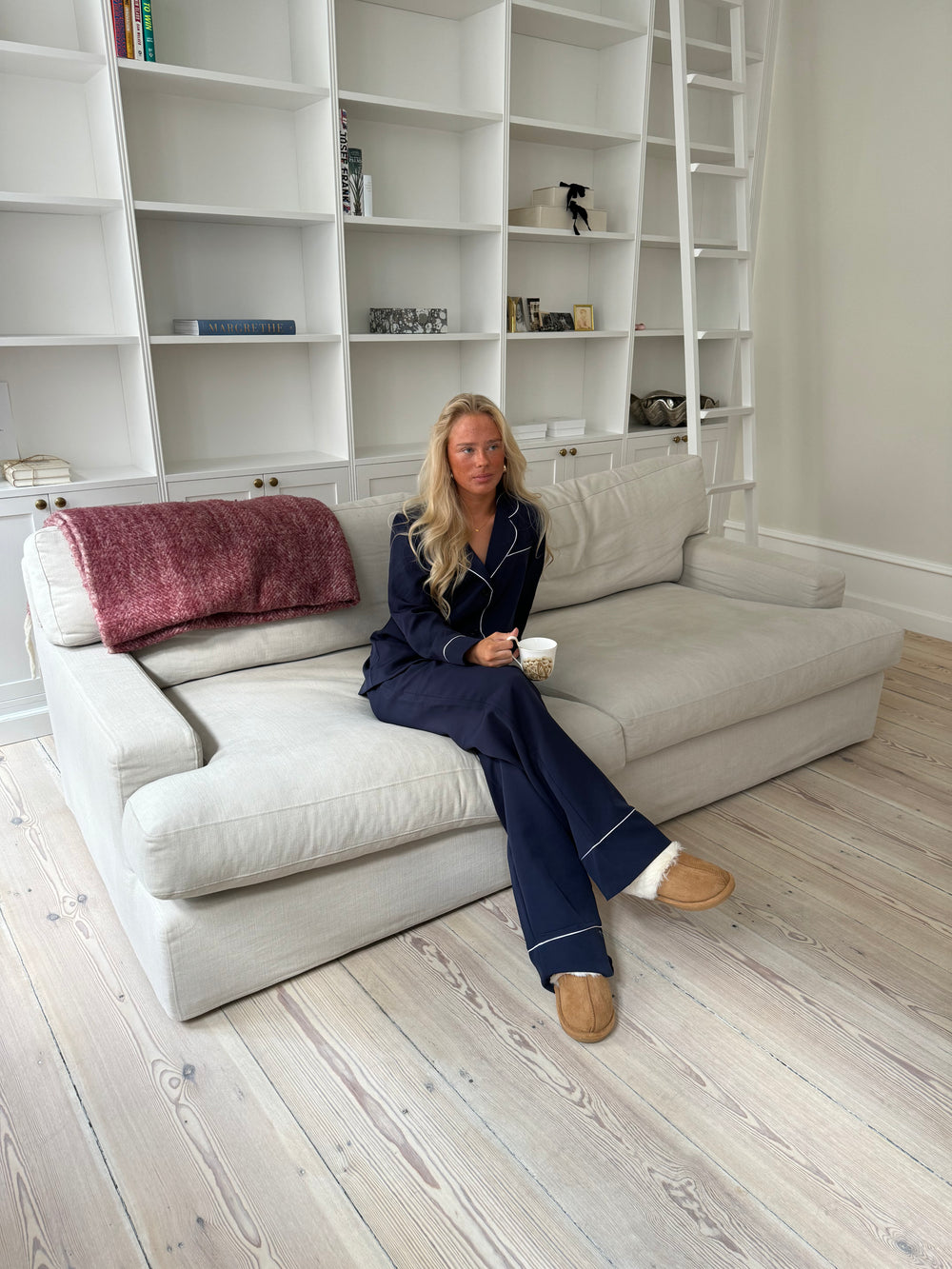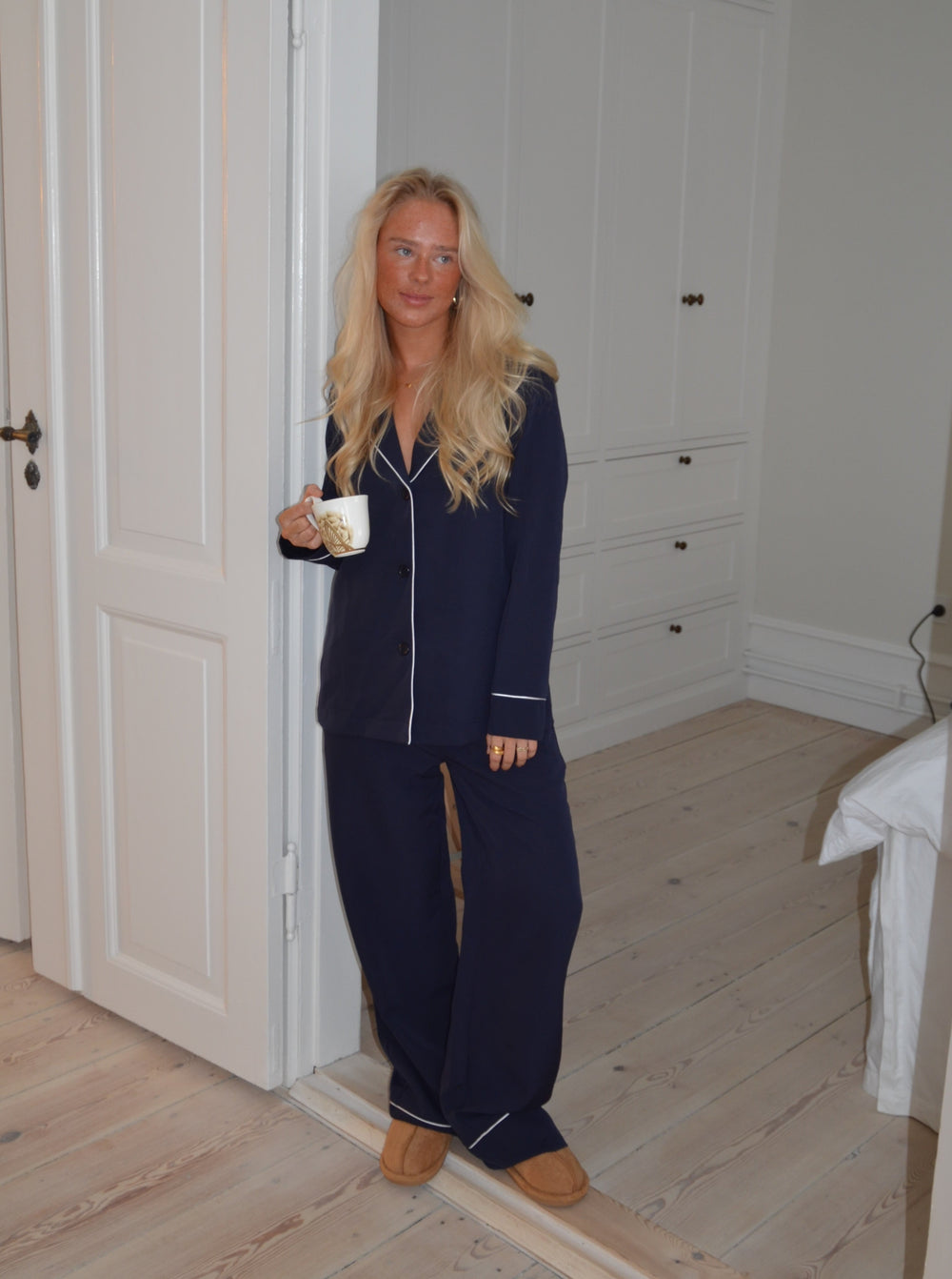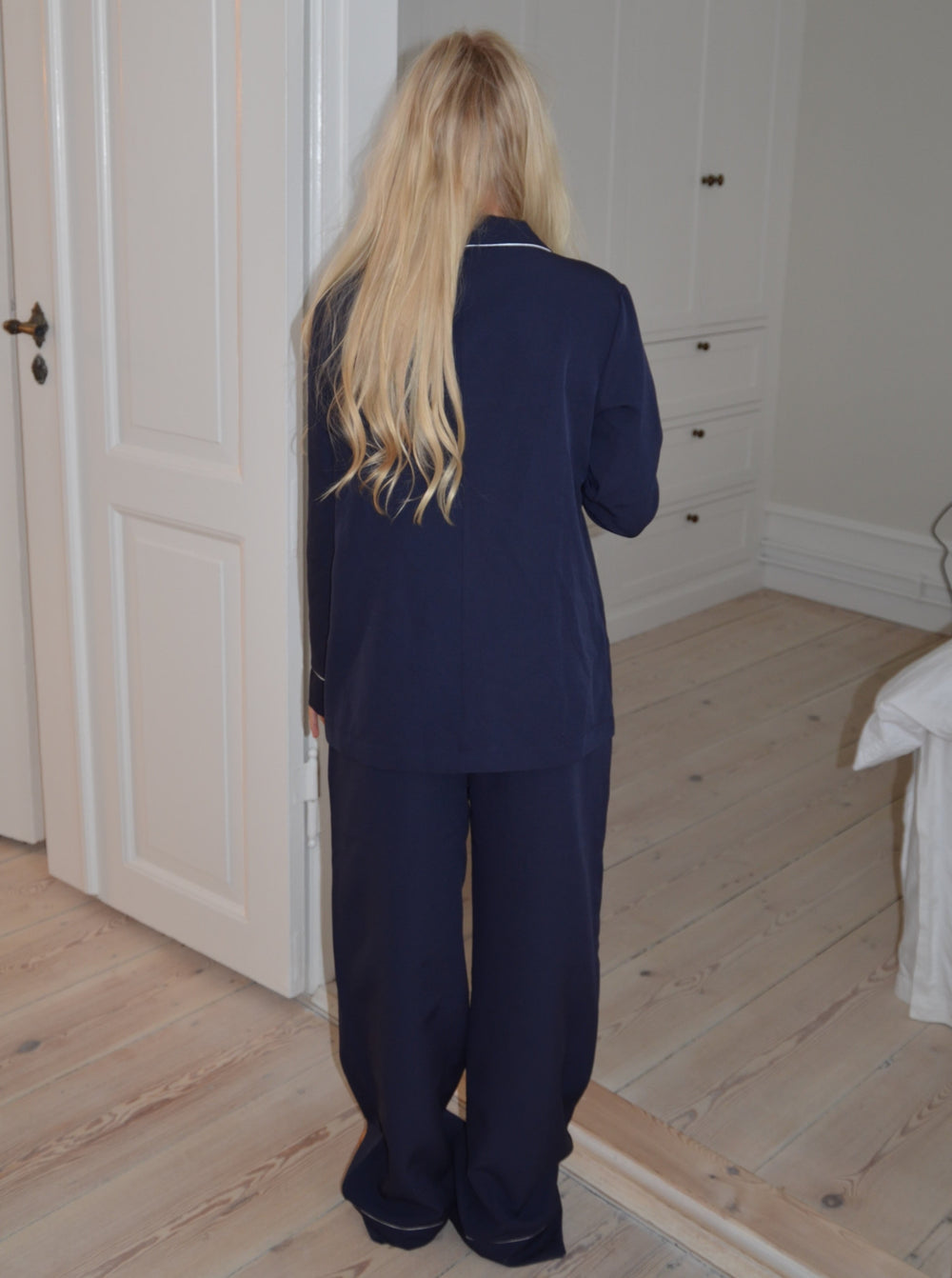 Navy pyjamasbukser med hvide detaljer. Disse bukser er lavet i et lækkert blødt materiale, som er super behageligt at have på derhjemme. Passer perfekt sammen med vores Aurelia pyjamasskjorte.