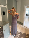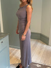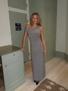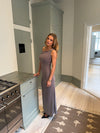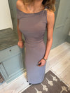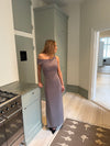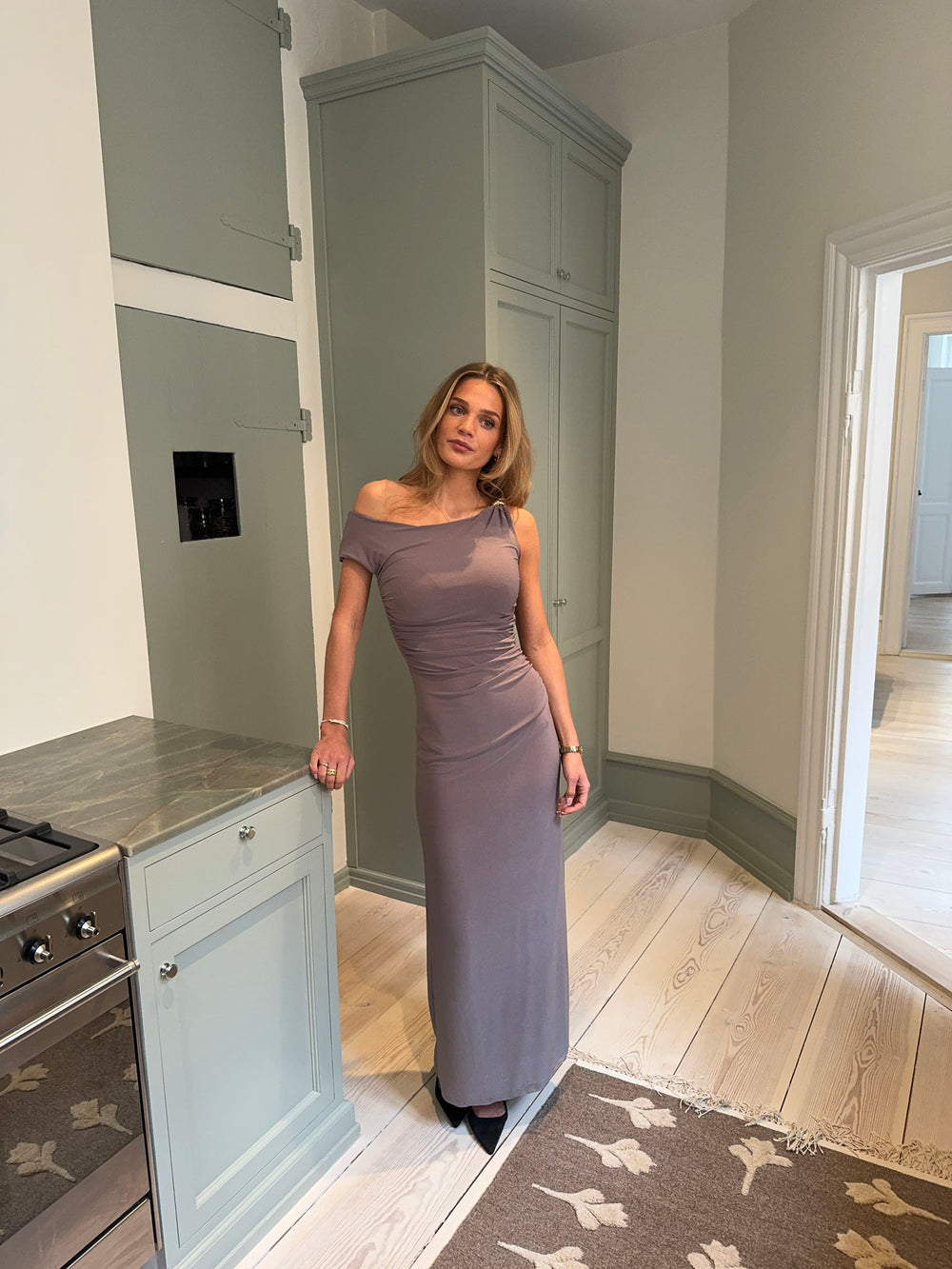 Denne smukke taupefarvede maxi-kjole kombinerer elegance med sofistikerede detaljer. Det one shoulder-design fremhæver skuldrene, mens en eksklusiv gulddetalje på højre side af "ærmet" tilfører et luksuriøst touch. Kjolens scrunch-effekt i højre side skaber en flatterende silhuet og smyger sig smukt om kroppen. Perfekt til særlige anledninger – style den med minimalistiske smykker og hæle for et stilrent, men opsigtsvækkende look.
