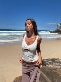 Den fine rynke- og cut-out detalje foran skaber et flatterende udtryk, der gør toppen perfekt både til hverdag og fest. Style den med jeans for et casual, men chic look – eller med en nederdel og smykker for et mere opløftet outfit.