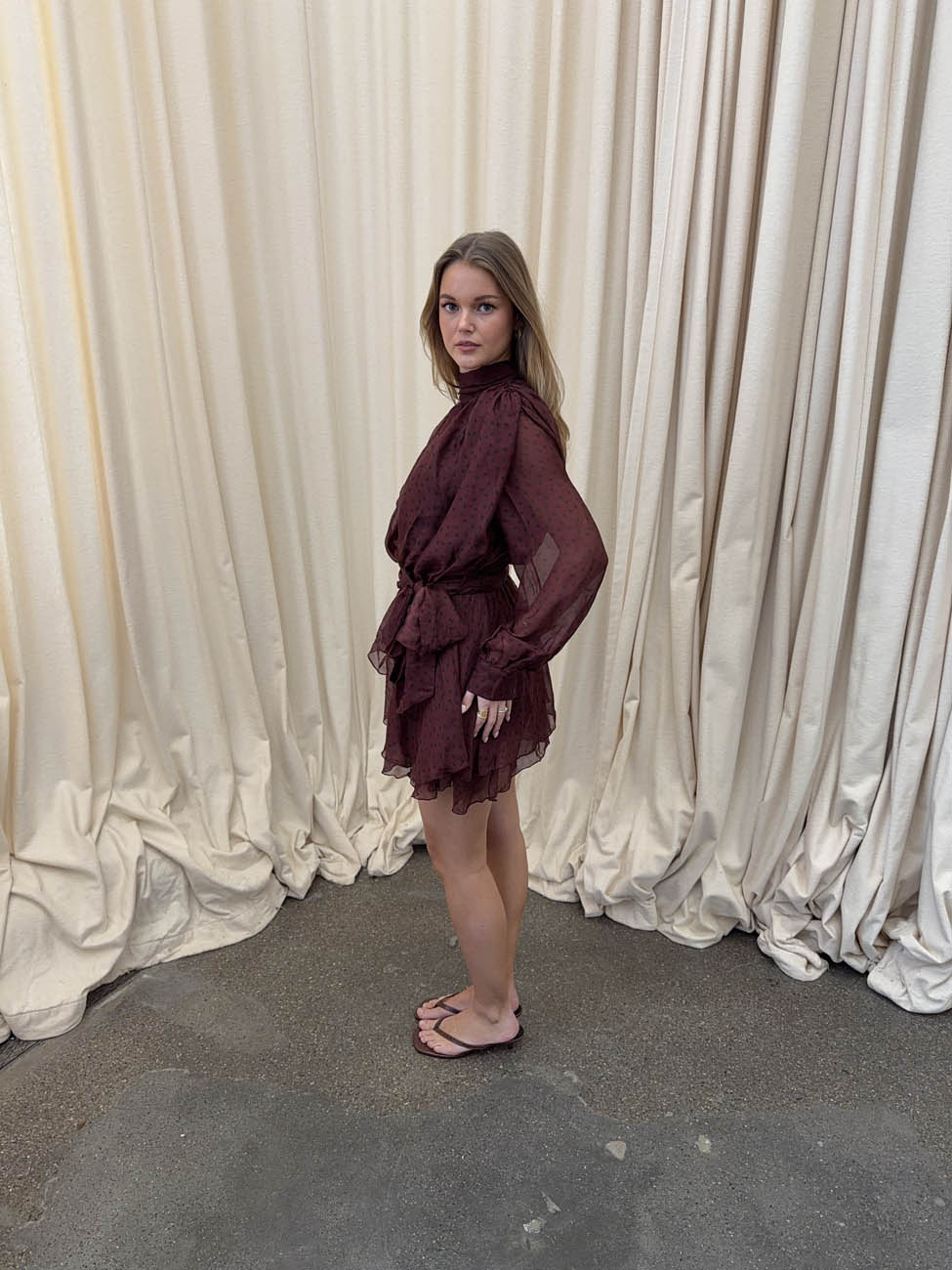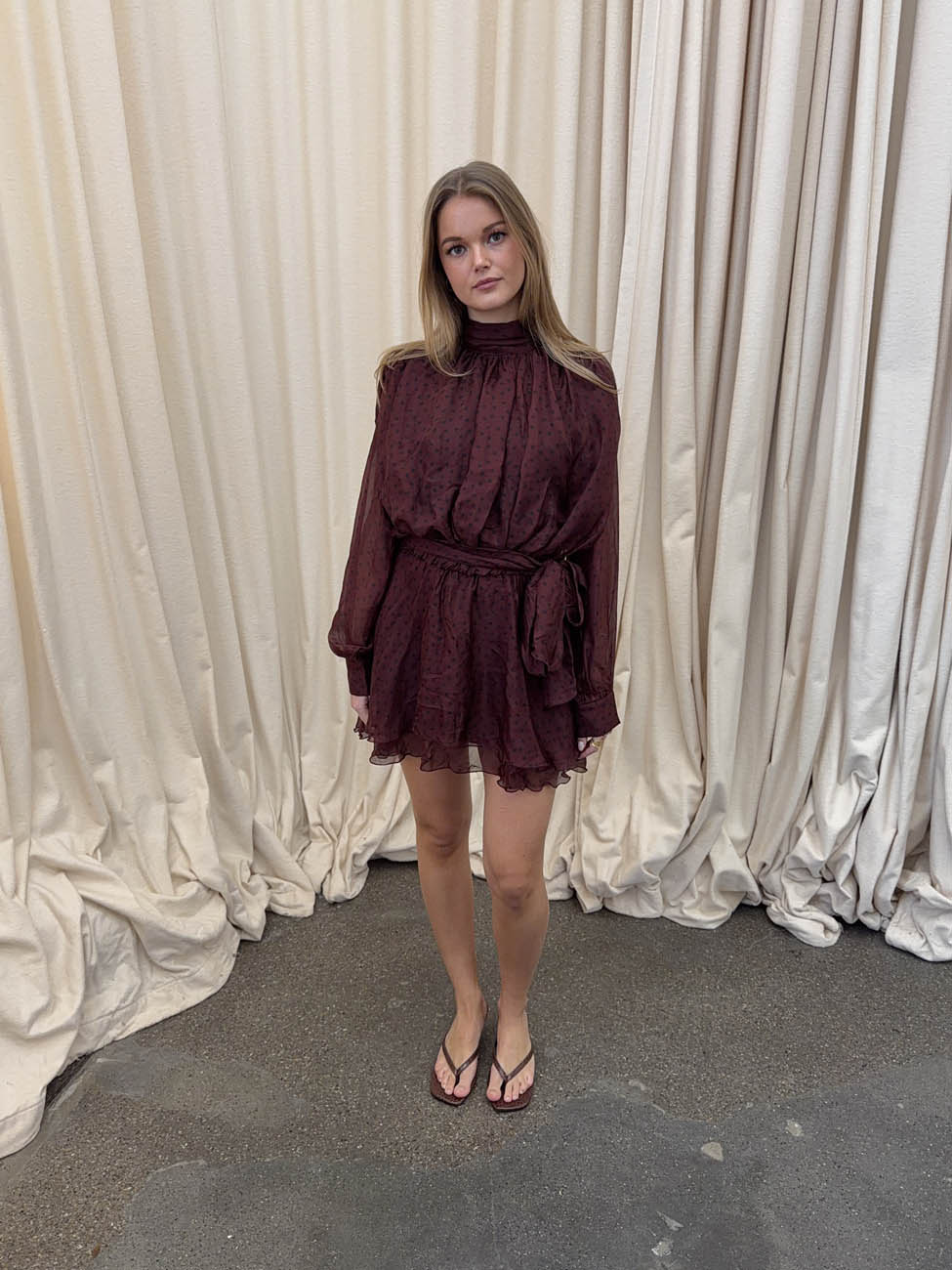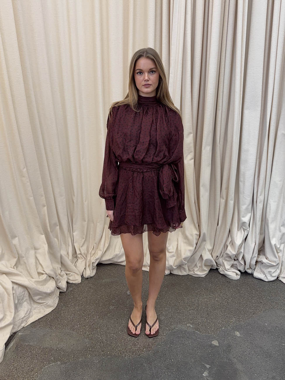 Denne smukke prikkede kjole i en dyb rødbrun nuance kombinerer romantiske detaljer med et legende og luftigt udtryk. Den er designet i let, semitransparent chiffon med mørke prikker og har en rummelig, rynket konstruktion, der giver blusen et blødt og voluminøst fald.